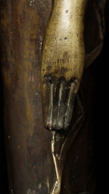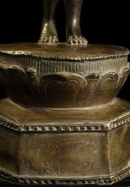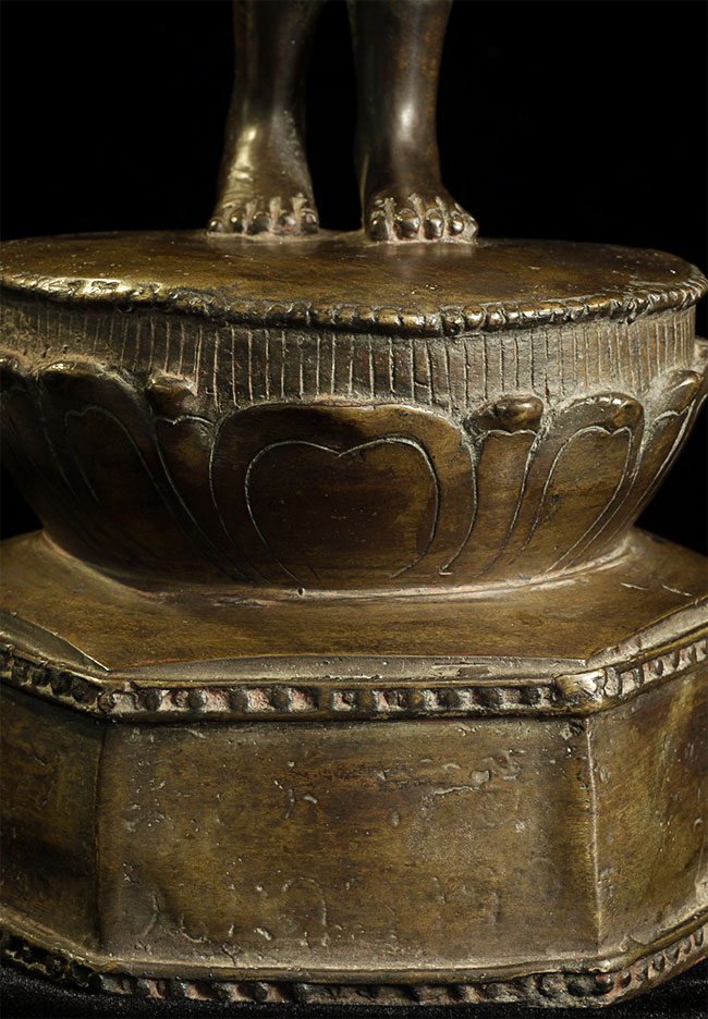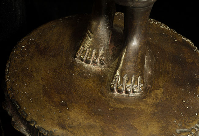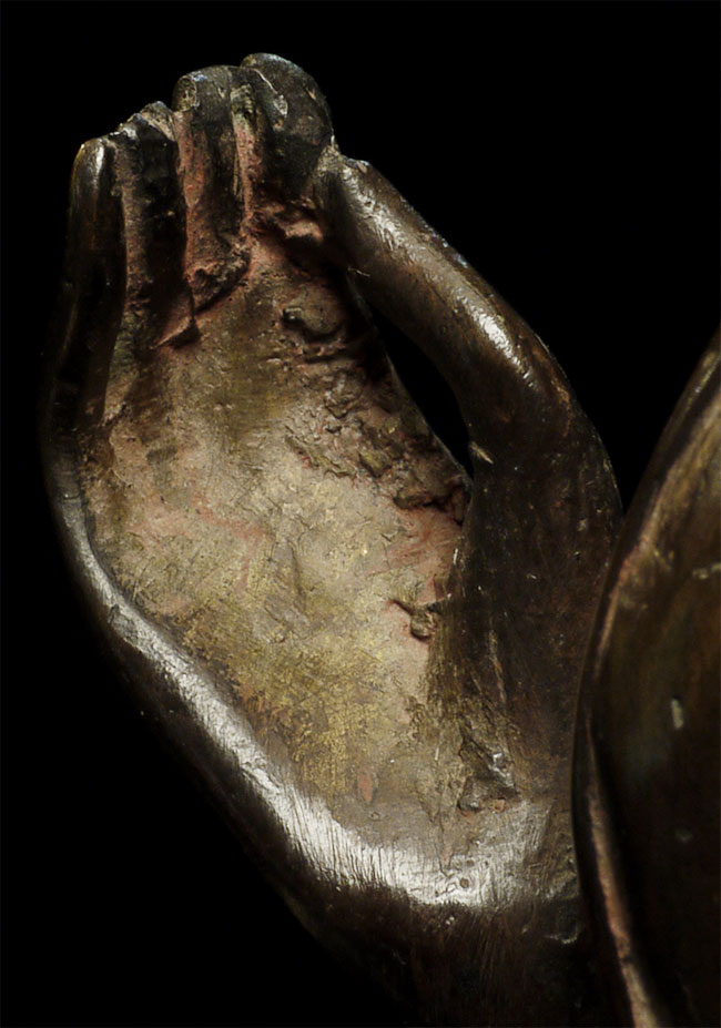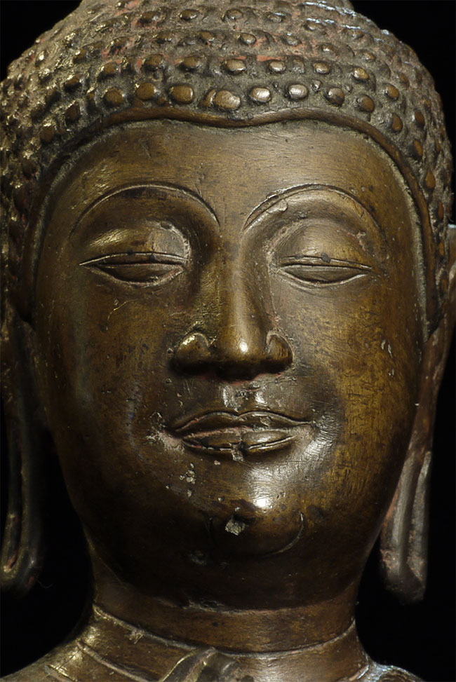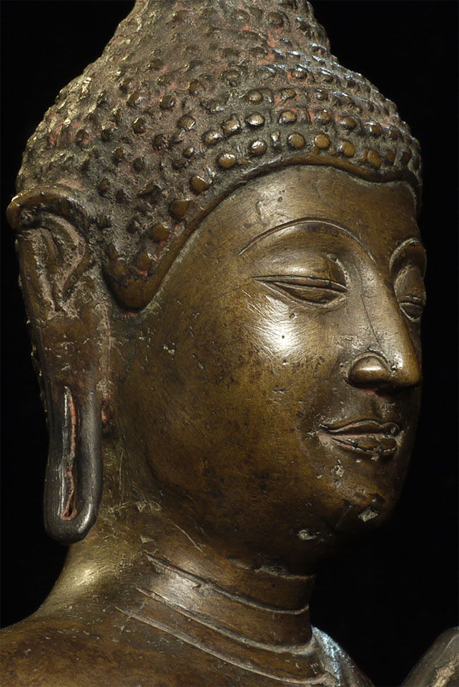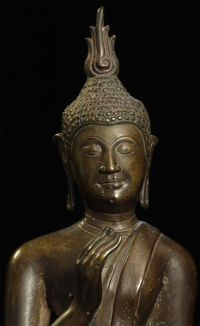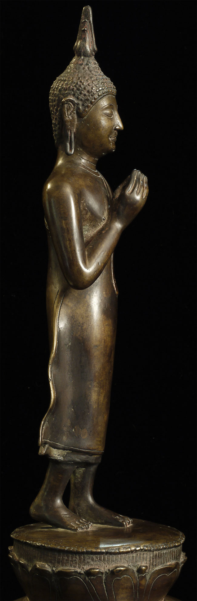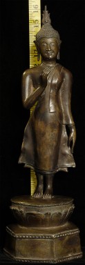 Probably 17/18thC Thai Walking Buddha from an European collection. The vast number of this type were made during the reign of Rama V in the last part of the 19th century and first part of the 20th. I believe this is not a period (13/14th) piece, but that it is a rare and beautiful Ayuthaya period emulation. Excellent quality, and very hard to find. 16 1/8" tall, bottom of base has an approximate diameter of 4.75 inches