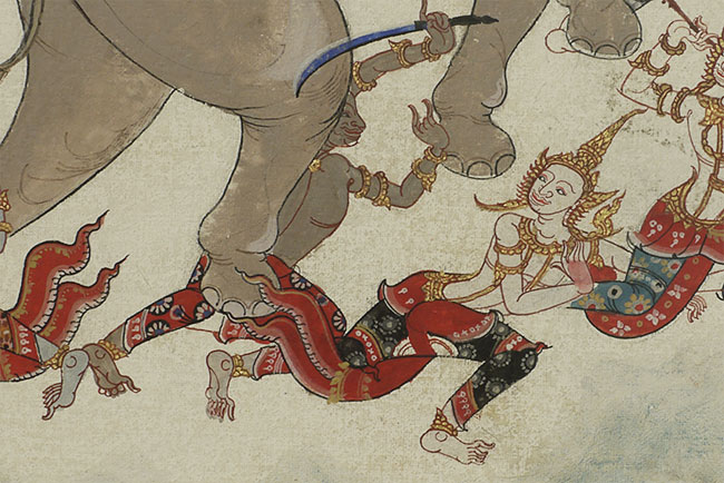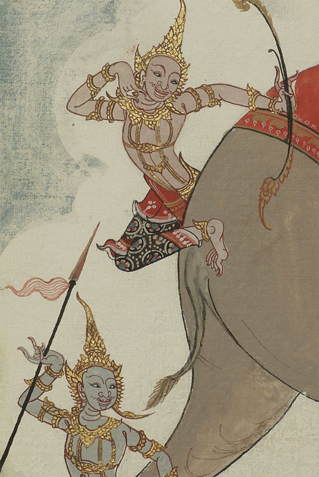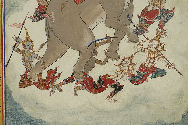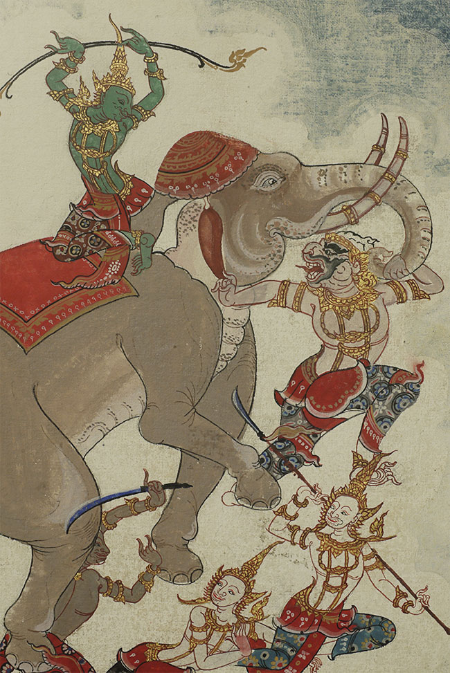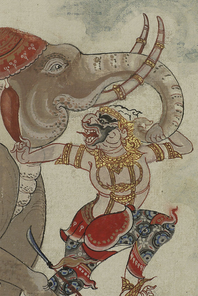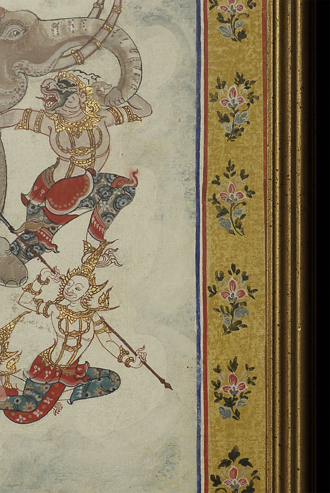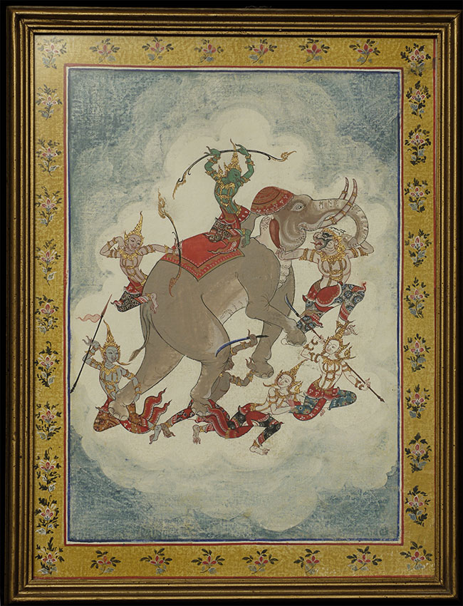 Very special Antique Thai Painting of a Royal Elephant being escorted to heaven by celestial beings. Purchased by the previous owner in a high end antique shop in Bangkok in 1970. Condition, quality, and finesse are all of the highest quality. Inside of frame is 11.5 x 15 5/8 inches, outside 13.25 x 17.5 inches.
