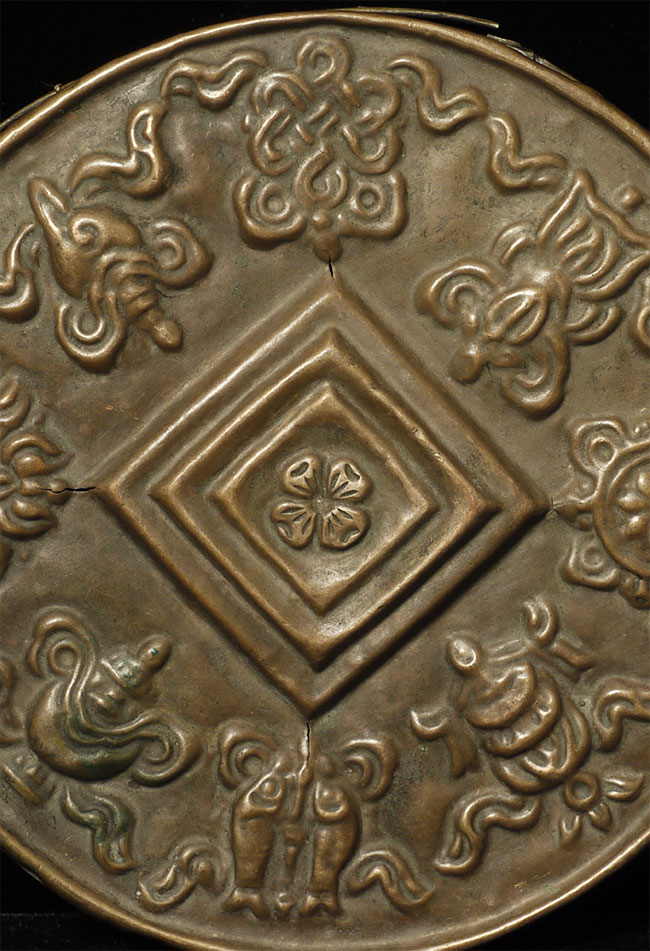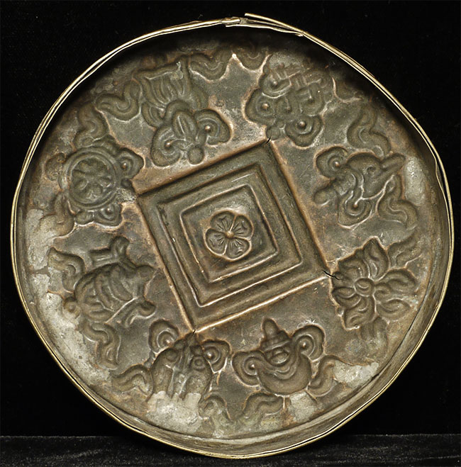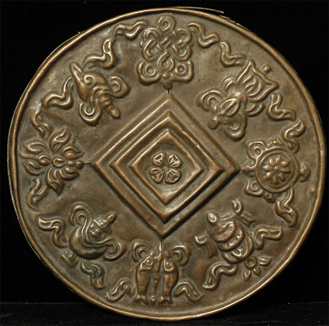 Stylized Antique Mongolian Copper Mandala. Used to meditate on the freedom of suffering for all sentient beings. Diameter is 5"