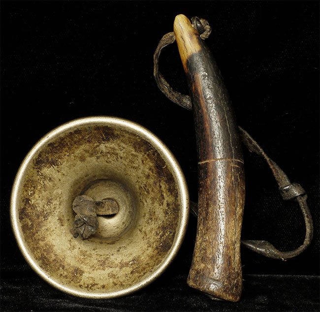 Antique cymbal/bell and horn. Cybal has a diameter of 2.75 inches. Horn is 4 3/8 inches long, . Purchased by previous owner in 1972 from a Tibetan refugee in Northern India.