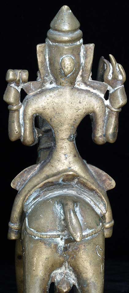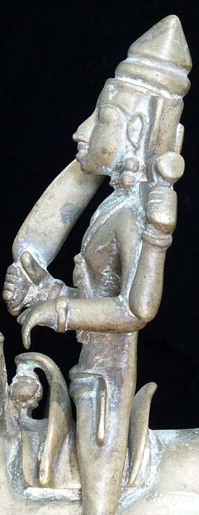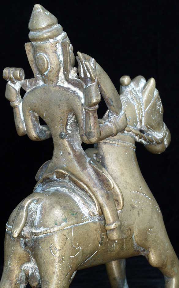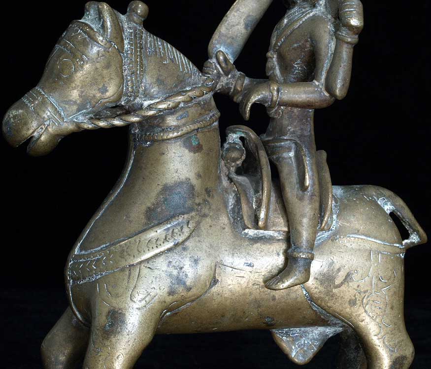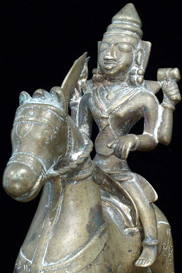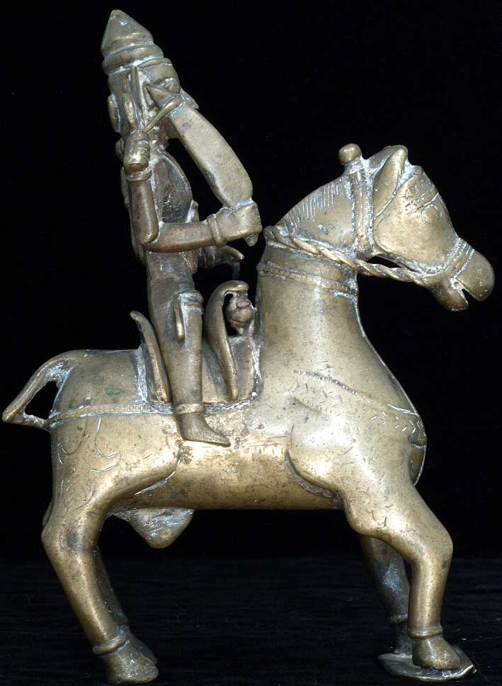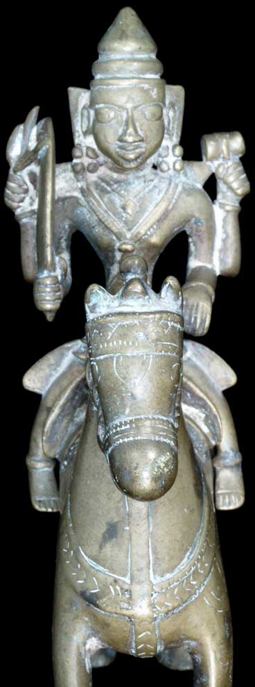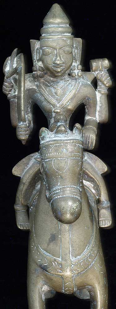 This is a nice 4 armed 18/19thC Hindu Deity upon his horse. It is cast in two parts (rider and horse), and shows nice old patina. The horse and rider both show tremendous personality with great expressiveness, and are both well cast and sculpted. Assembled they sit 7.25 inches tall and are over 5 inches long.