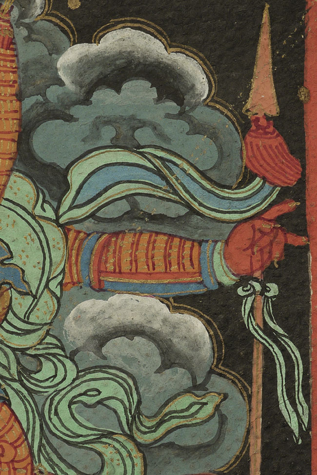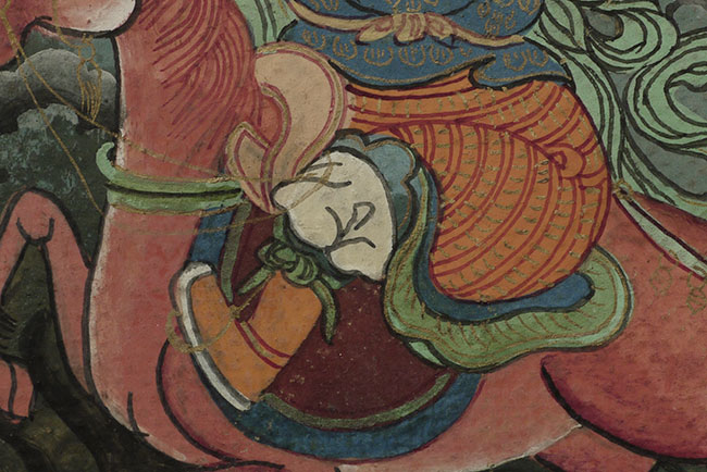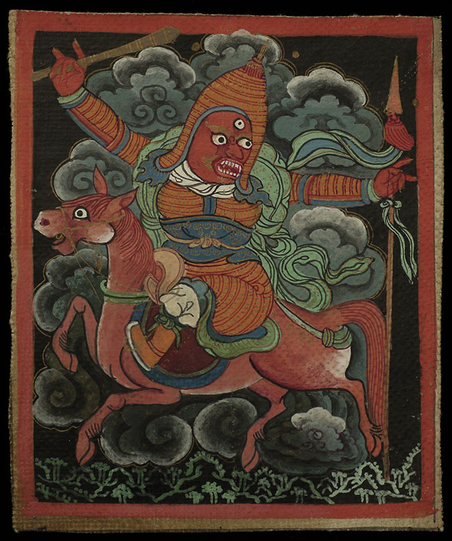 Delightful old Mongolian Thangka of fierce deity on his horse. painted thangka measures 3 x 3.5 inches