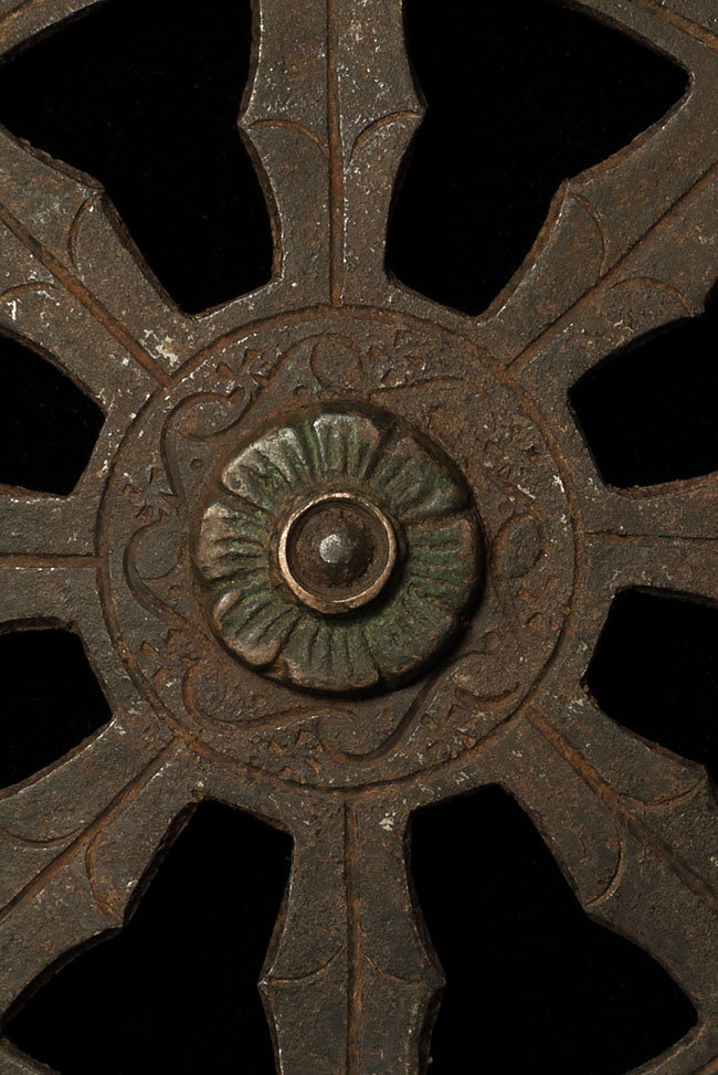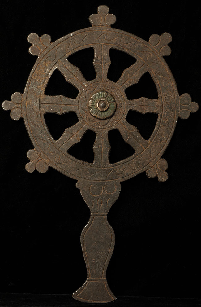 Antique Tibetan or other Himalayan Iron Buddhist Wheel of the Law. 12.25 inches tall/long. Could use a stand or could easily be displayed on a wall. Unusual item.