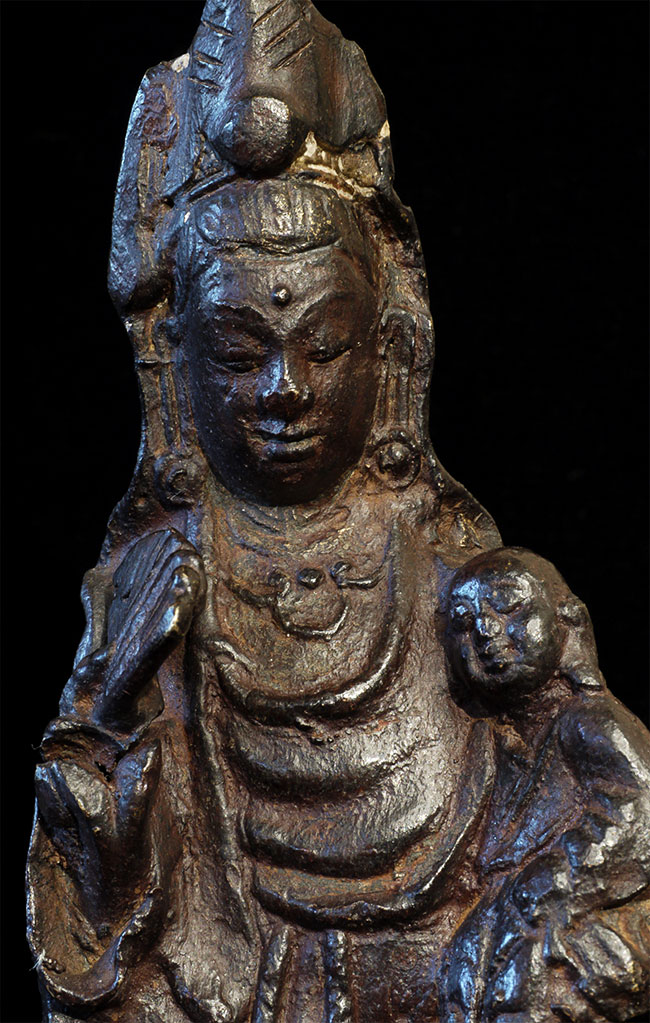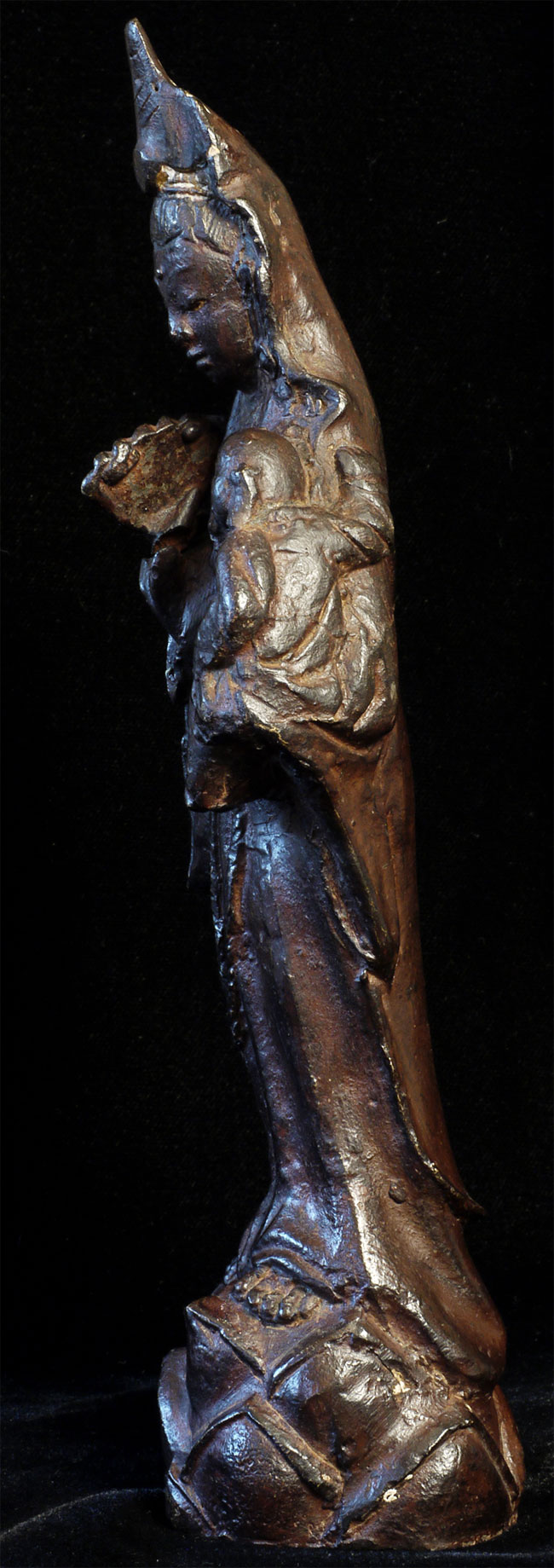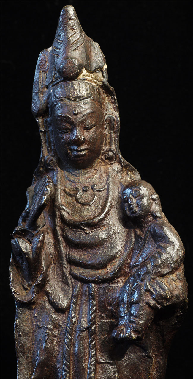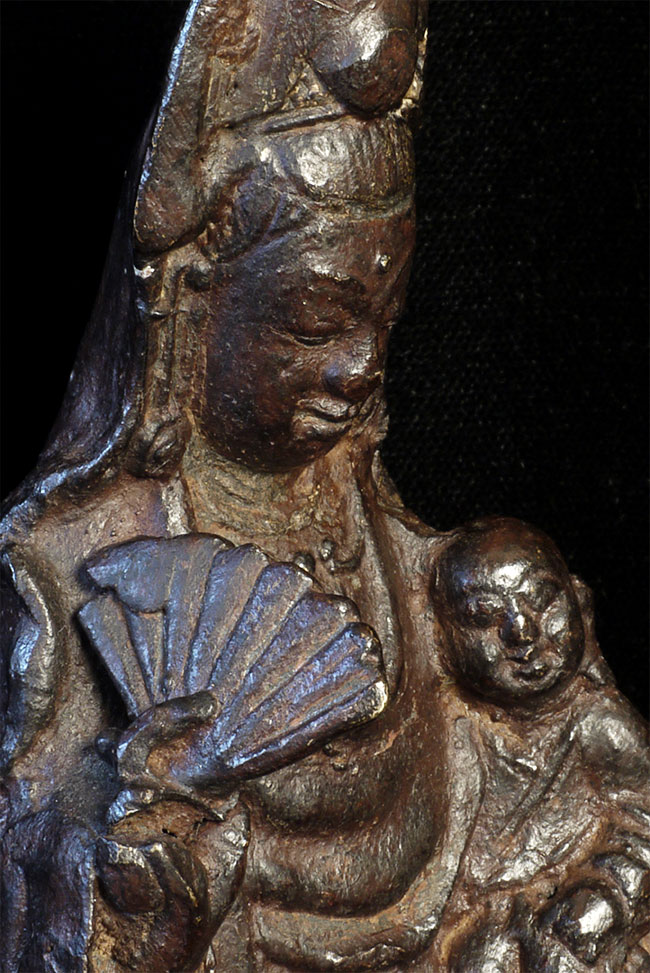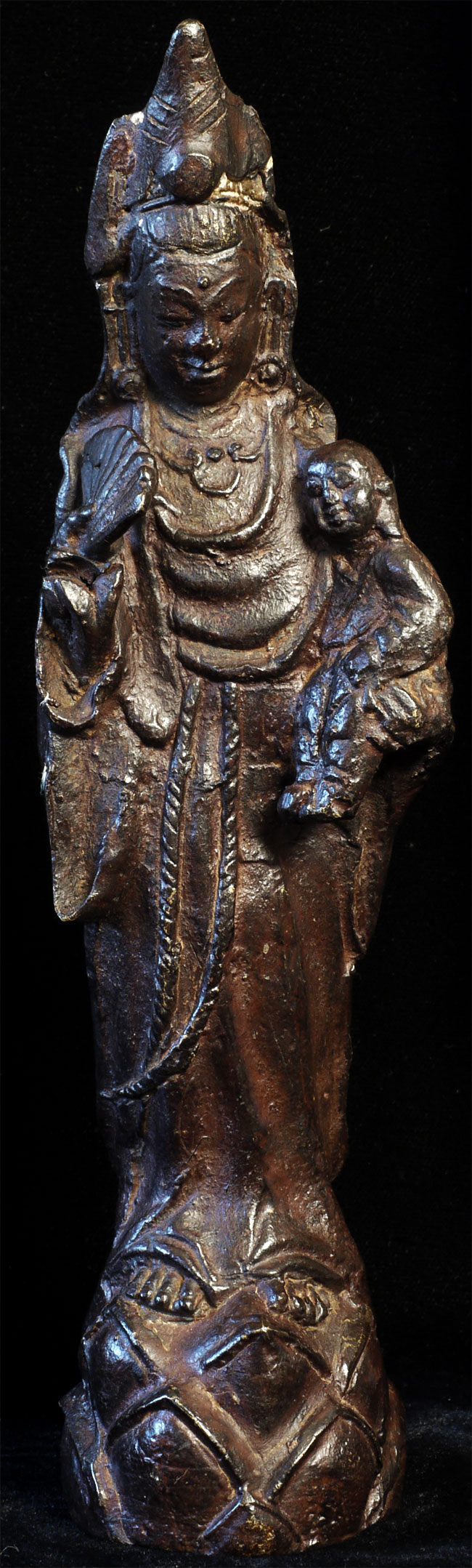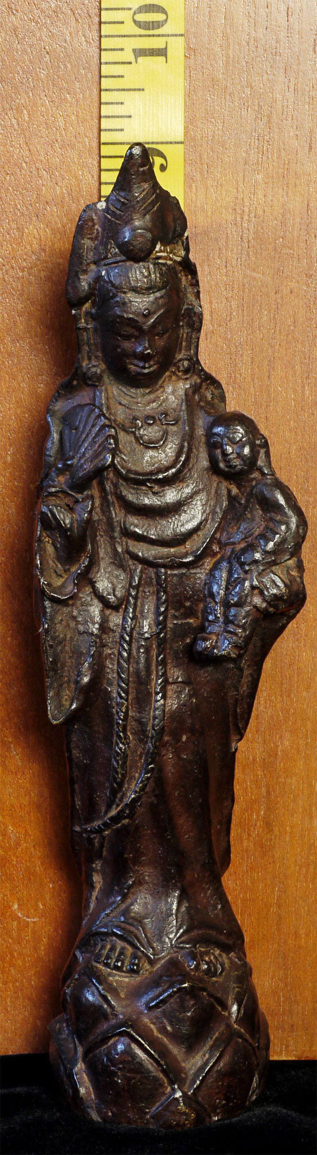Delightful 19thC bronze Quanyin with baby. Stands 9 1/8" tall. Especially expressive faces, with a deep sense of connection between the two.