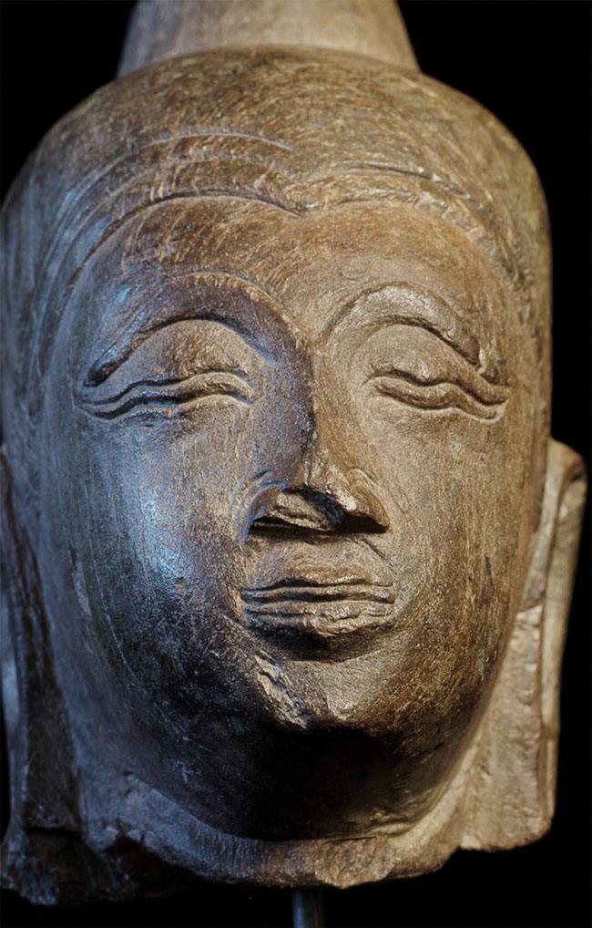 Serene 16/17thC Thai hard stone Buddha head. Total height on attached base is 4 1/8 inches.