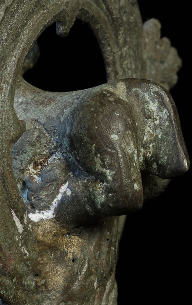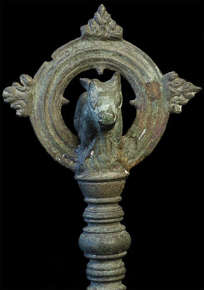 12-14thC Indonesian or Javanese Hindu bell. Excellent example of its type. Animated cow finial. Stands 7.5 inches tall, has a diameter of 3 1/8 inches.