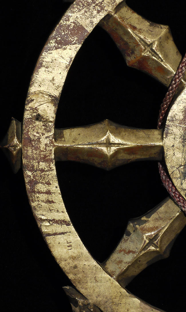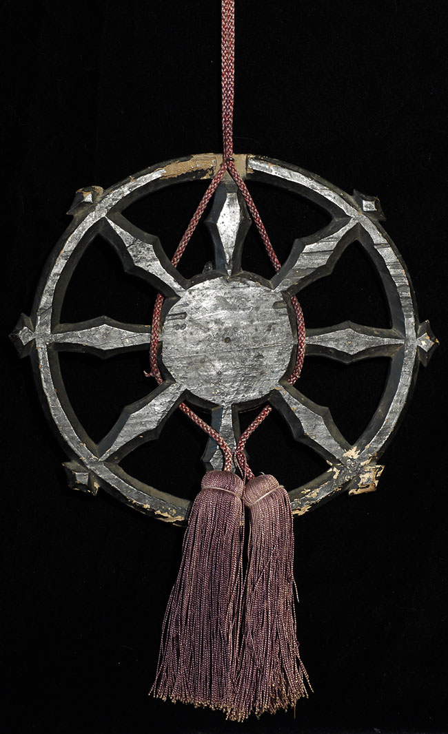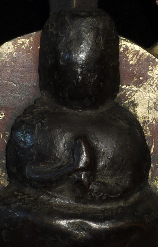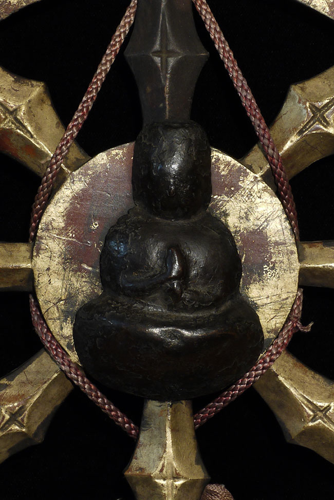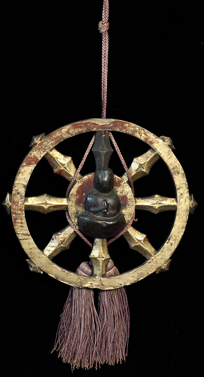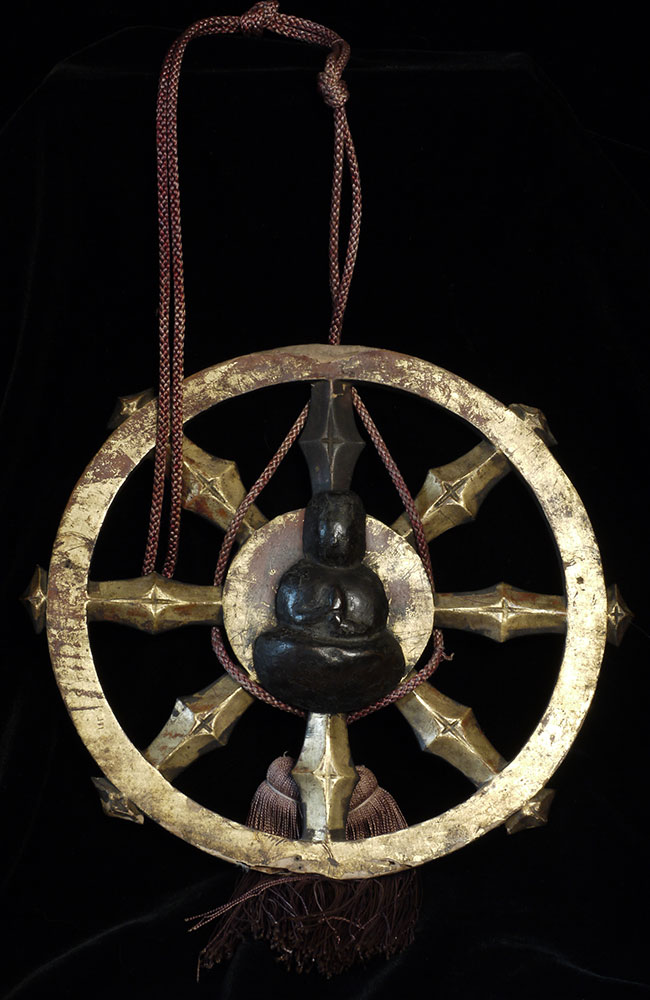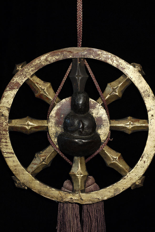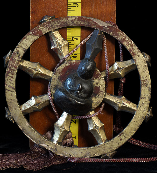 Early Japanese Bronze Buddha mounted to a "wheel of the law". Unclear of the two are a marriage. Likely over 600 years old (bronze part-wood part appears to be 19thC) Diameter measures 8.25". Was originally the center of a Japanese "Buddhist Mirror". These were popular in the 13th to 15th centuries-often the Buddha was cast in bronze and the "mirror" was made of wood. the "mirrors" are usually lost and they are either re-mounted or sold unmounted.