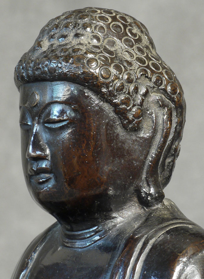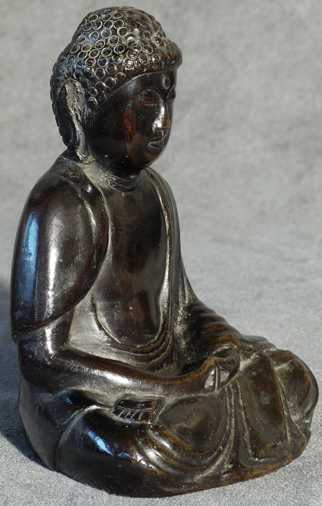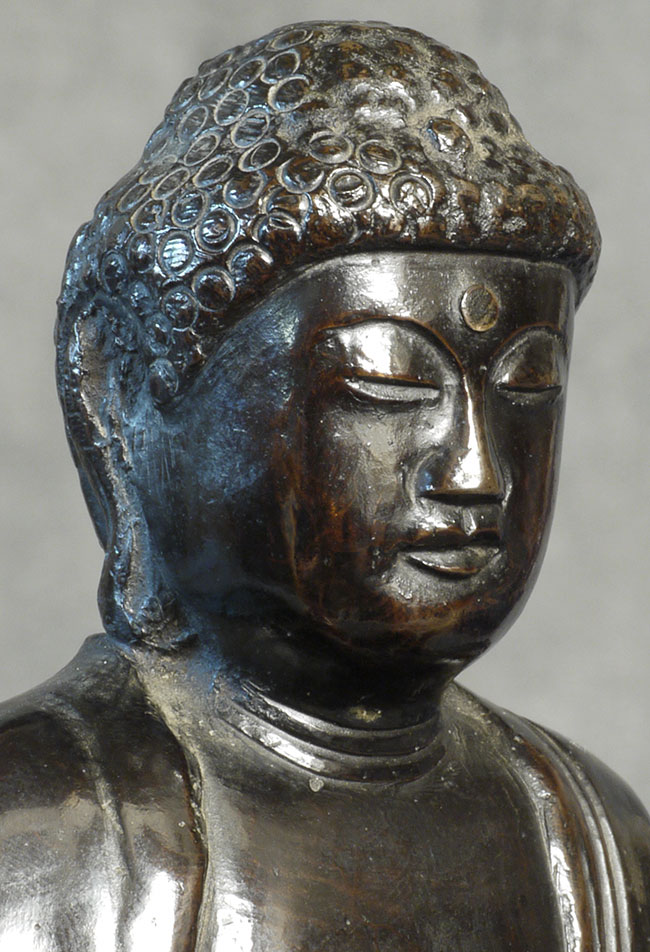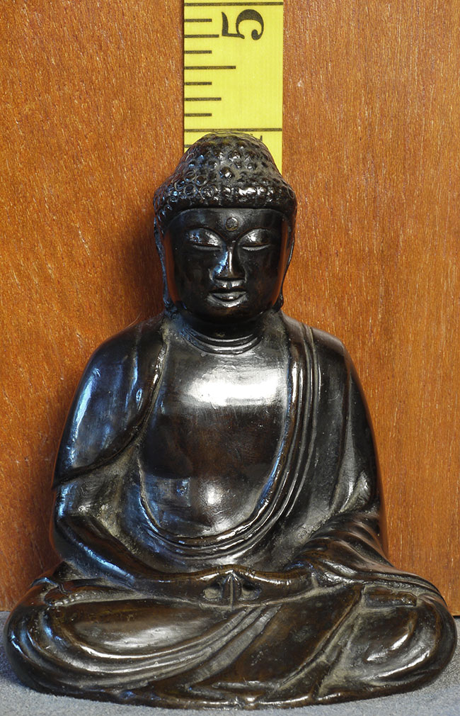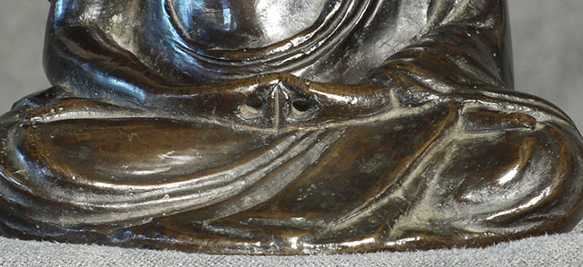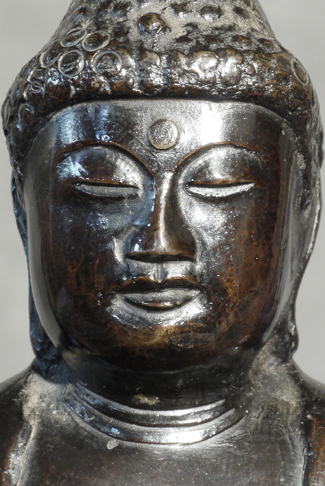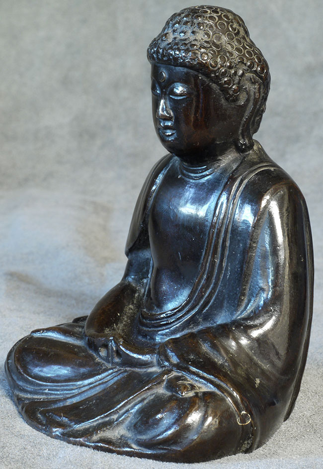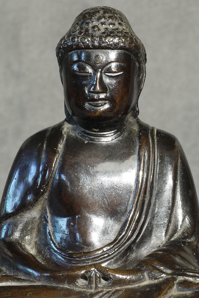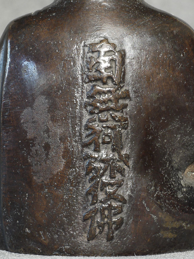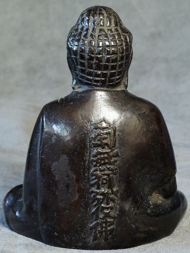 Meiji bronze Buddha with writing in high relief on the back. Sits 4 inches tall