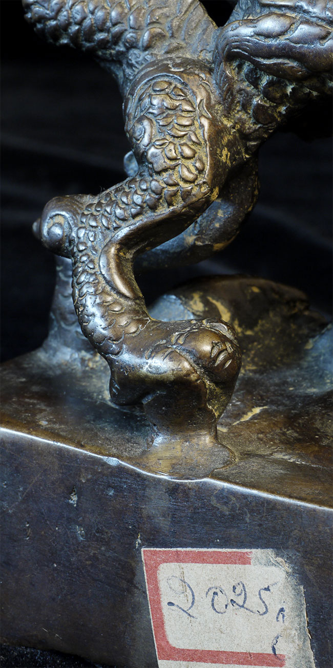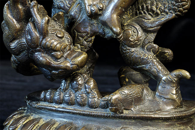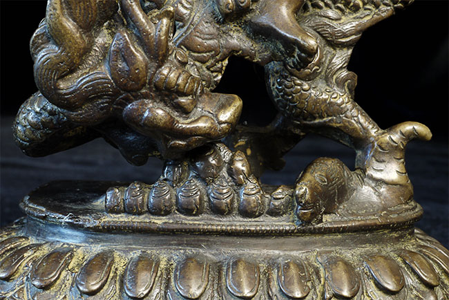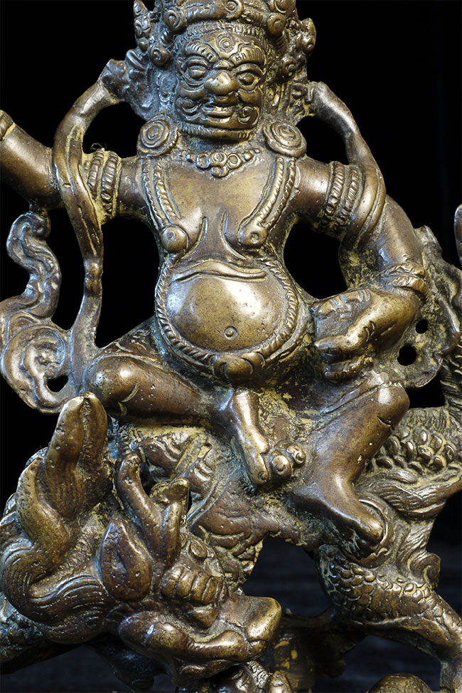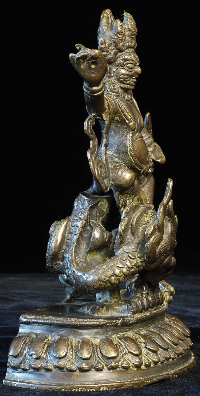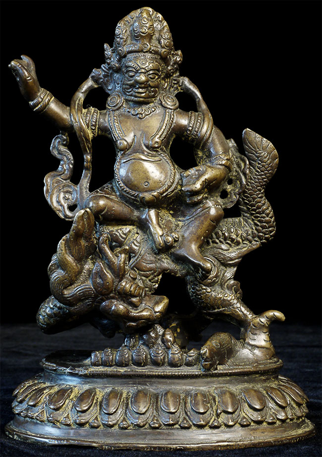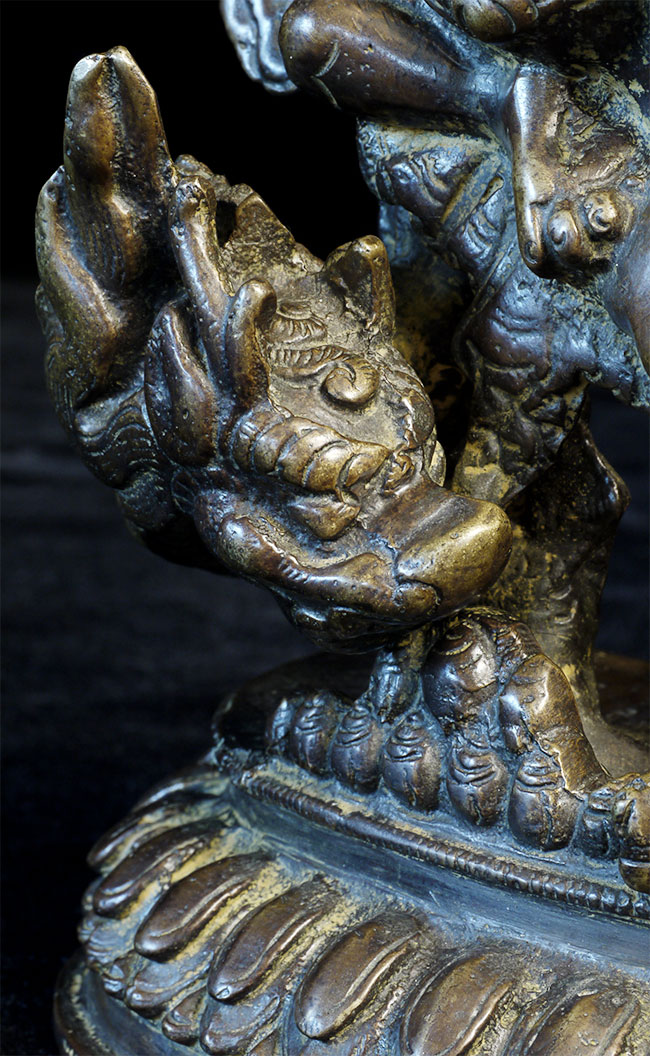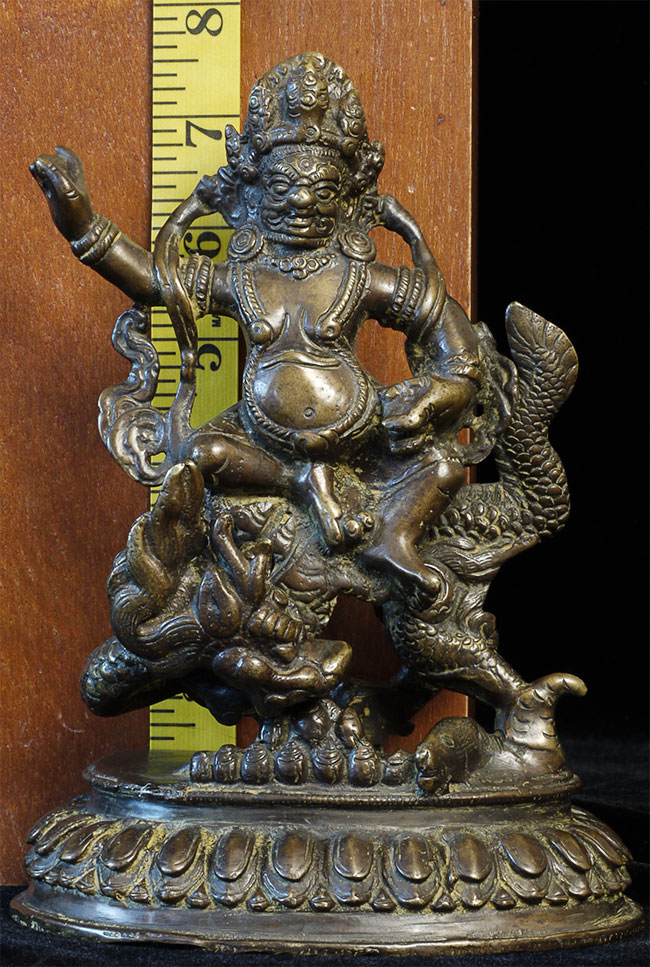Antique bronze Mongolian or Tibetan deity on dragon. A substantial piece at 7.75 inches tall, 6 inches wide, 3 1/8 inches deep, and quite heavy.
