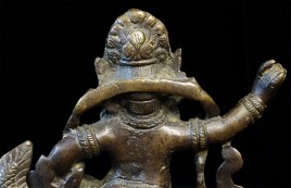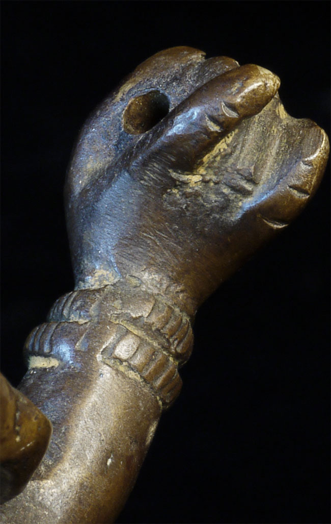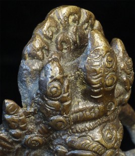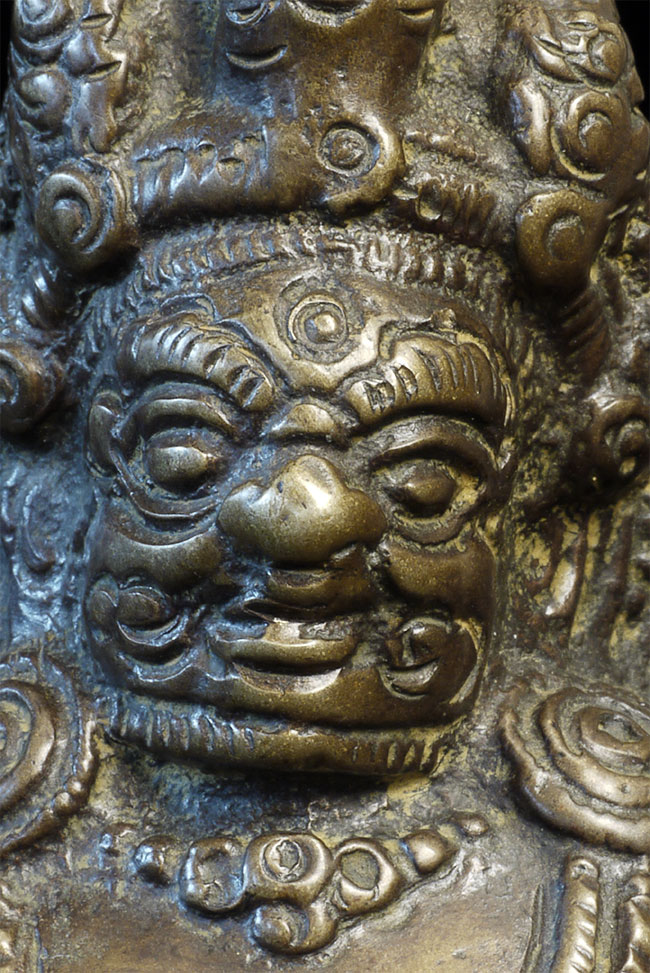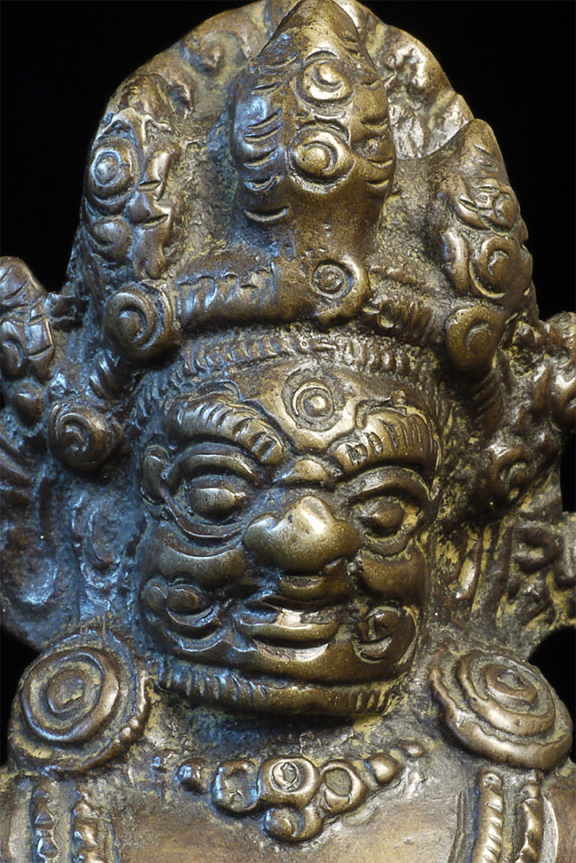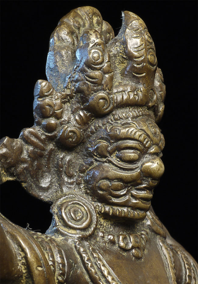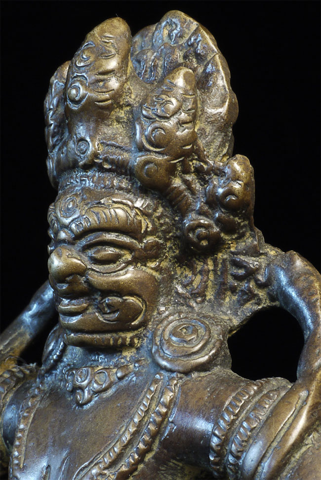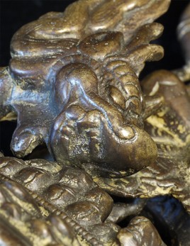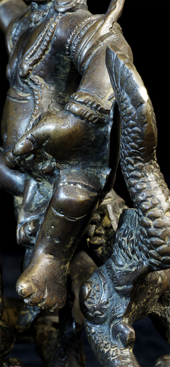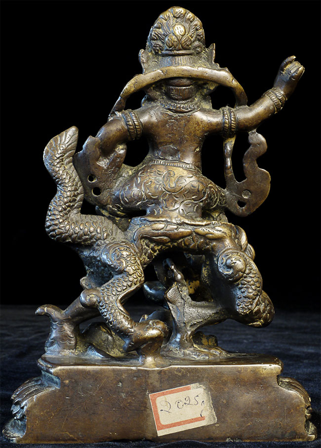 Antique bronze Mongolian or Tibetan deity on dragon. A substantial piece at 7.75 inches tall, 6 inches wide, 3 1/8 inches deep, and quite heavy.