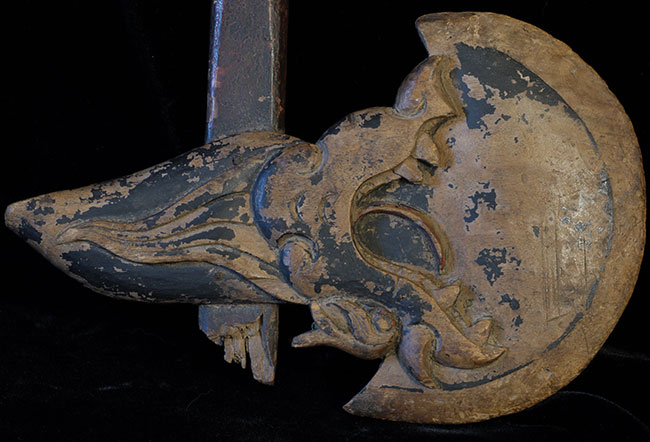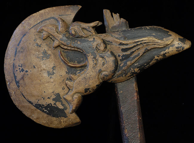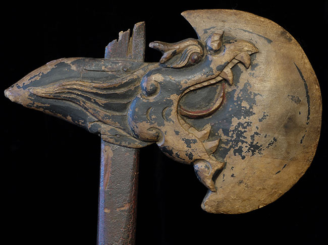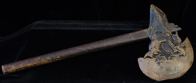 Very old Chinese ceremonial axe. Beautifully carved. Blade alone is 8 inches wide. The handle looks to be original.
