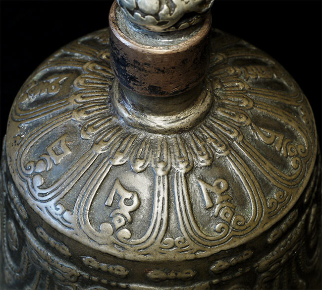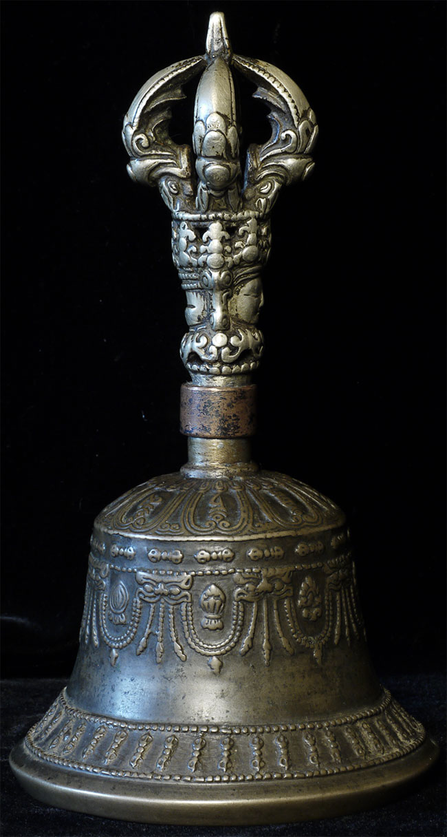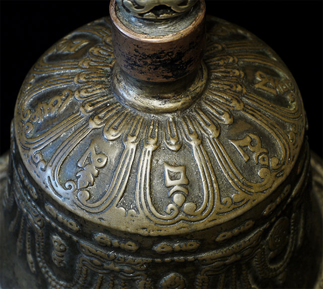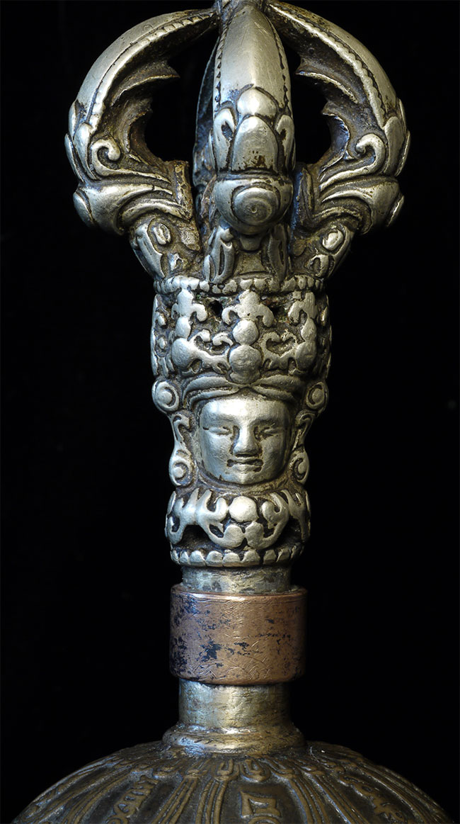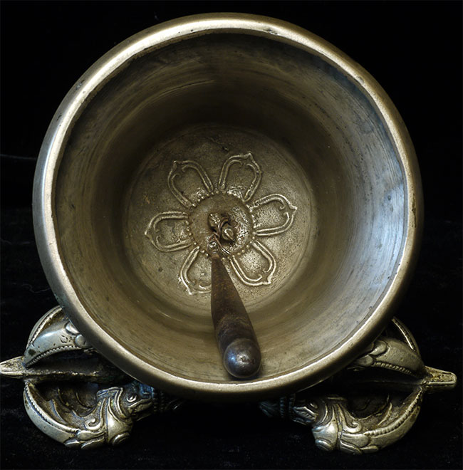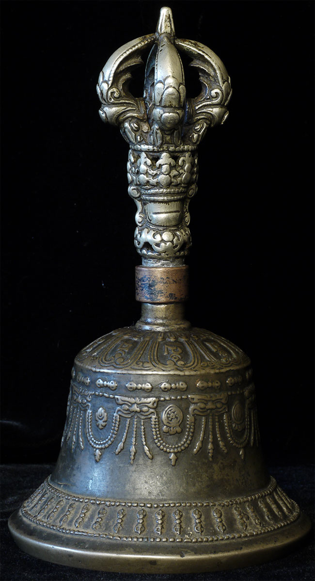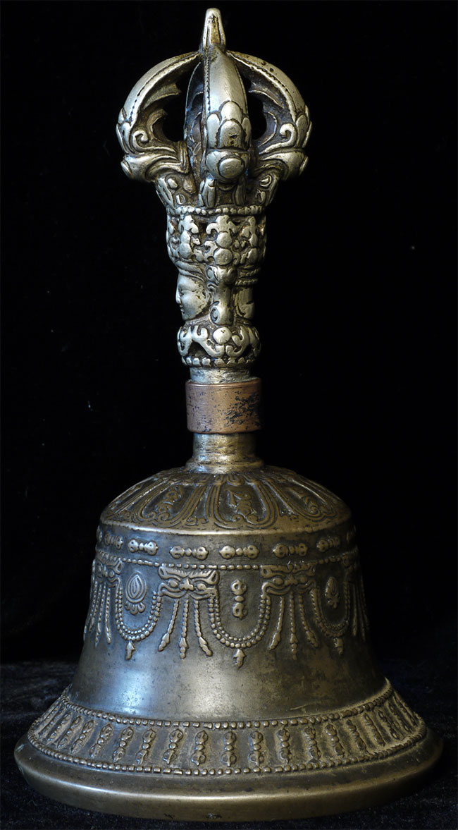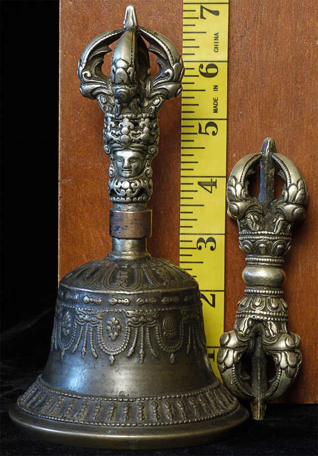 It reportedly had belonged to a Kagyu Rinpoche at one time. The handle is brass/bronze and displays wear commensurate with its age. Both are very heavy for their size, and appear to be cast from a silver alloy. The sound quality is exceptional. Please note the copper tube repair around the bell handle. This is an addition to the bell that was added by Karma Moffett, a famous Tibetan/New Age Musician. There is additional soldering underneath this to assure many years of ritual use to come.