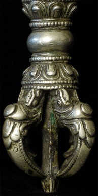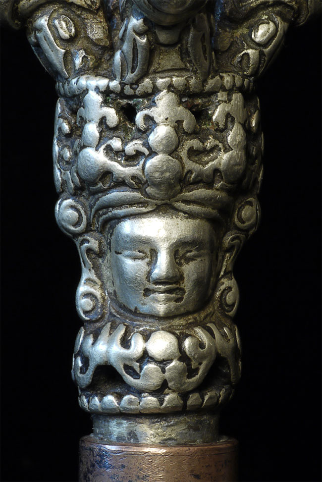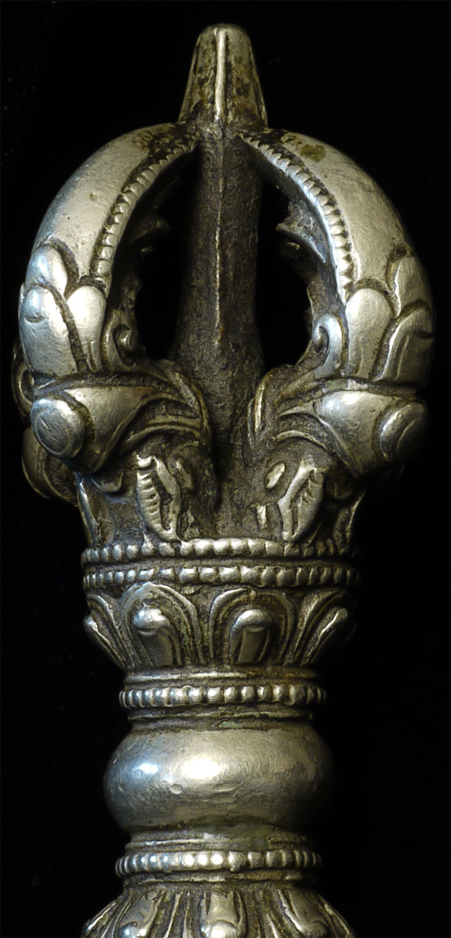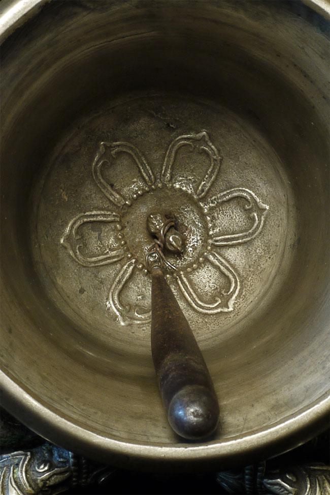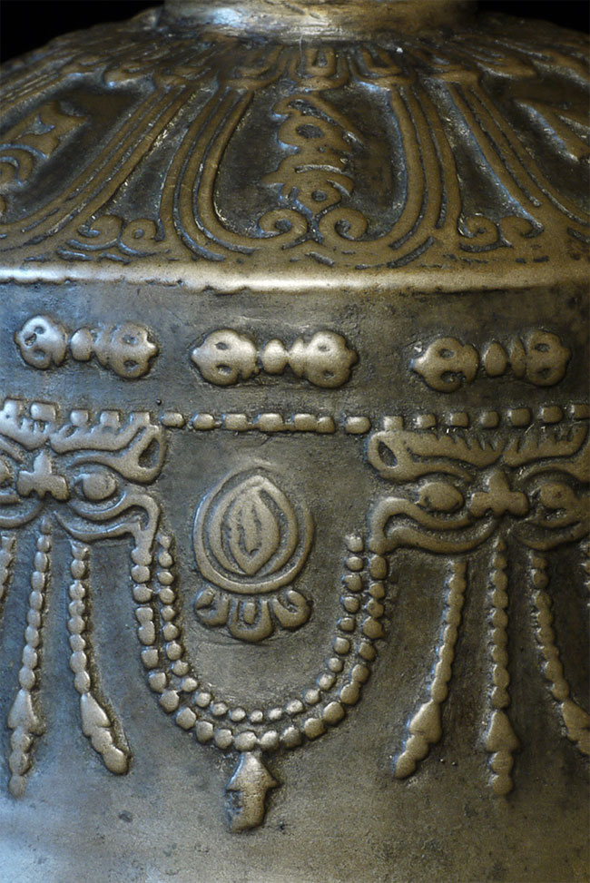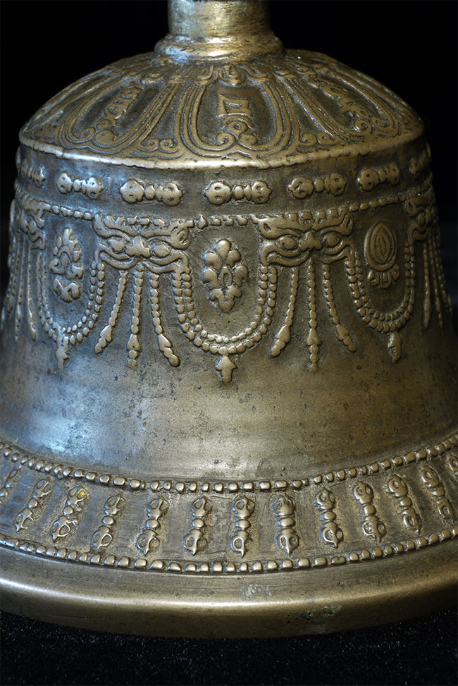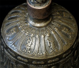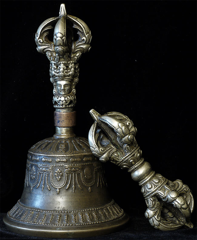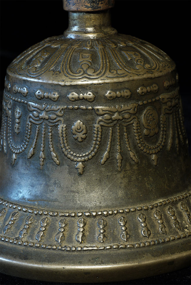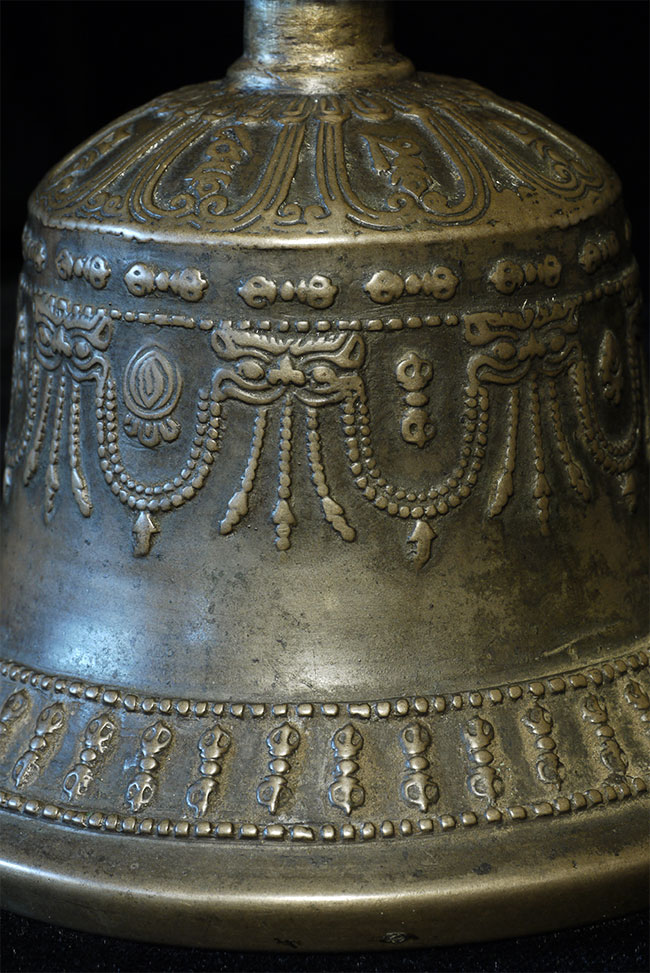 It reportedly had belonged to a Kagyu Rinpoche at one time. The handle is brass/bronze and displays wear commensurate with its age. Both are very heavy for their size, and appear to be cast from a silver alloy. The sound quality is exceptional. Please note the copper tube repair around the bell handle. This is an addition to the bell that was added by Karma Moffett, a famous Tibetan/New Age Musician. There is additional soldering underneath this to assure many years of ritual use to come.