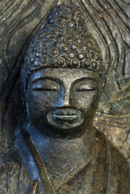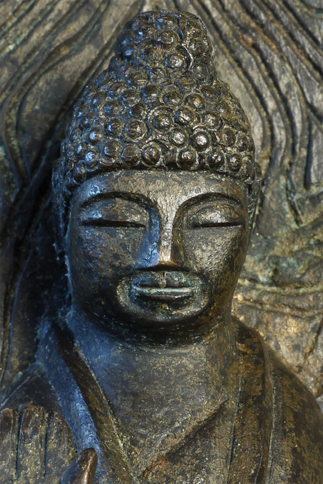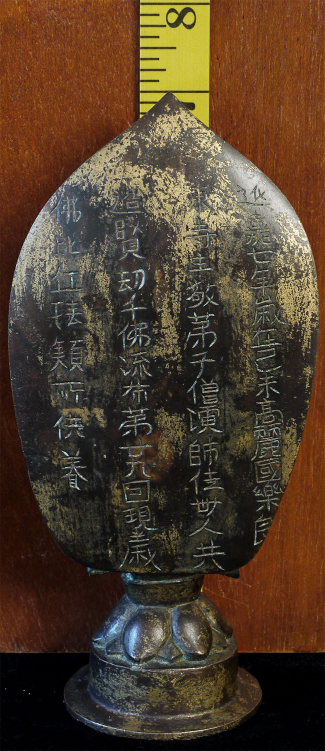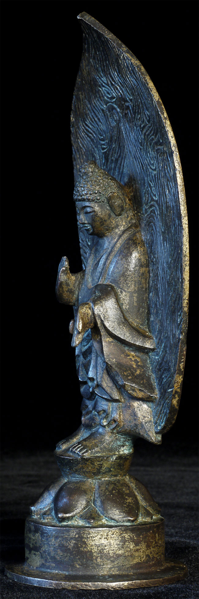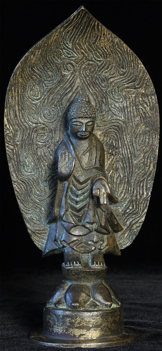 Vintage old Chinese bronze Buddha in an archaic style. Stands 7.25 inches tall
