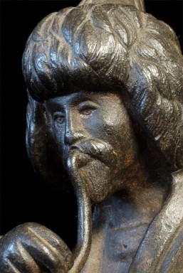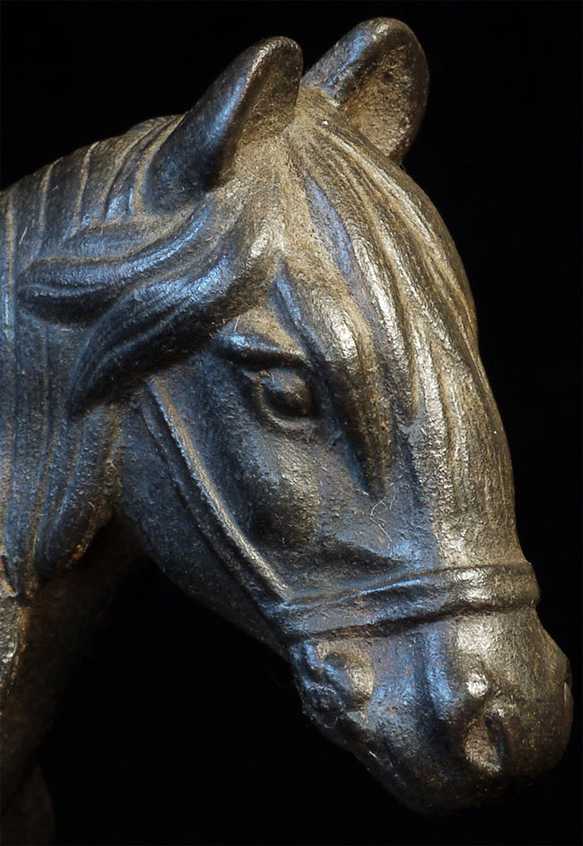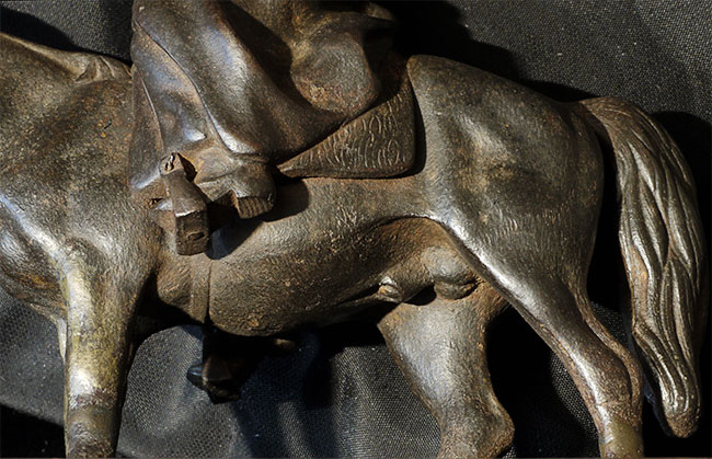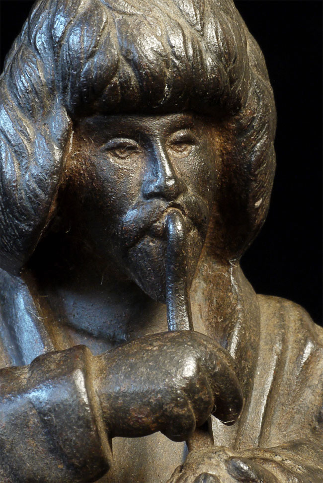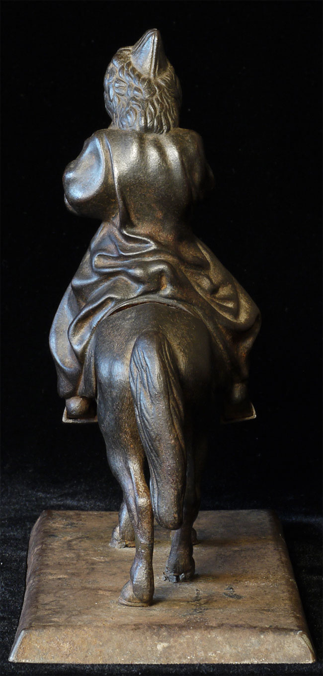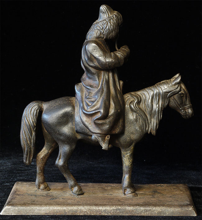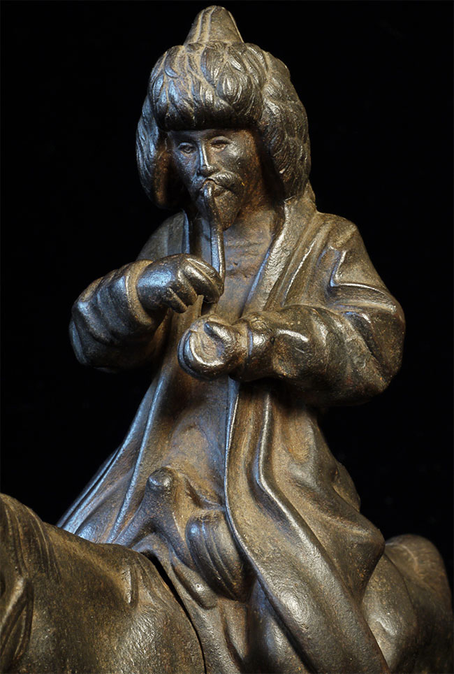 Unusual Vintage/Old Mongolian Iron Figure on Horse. Stands 7.25 inches tall, base measures 3 5/8 x 7 1/8 inches. Beautiful detail for an iron statue.