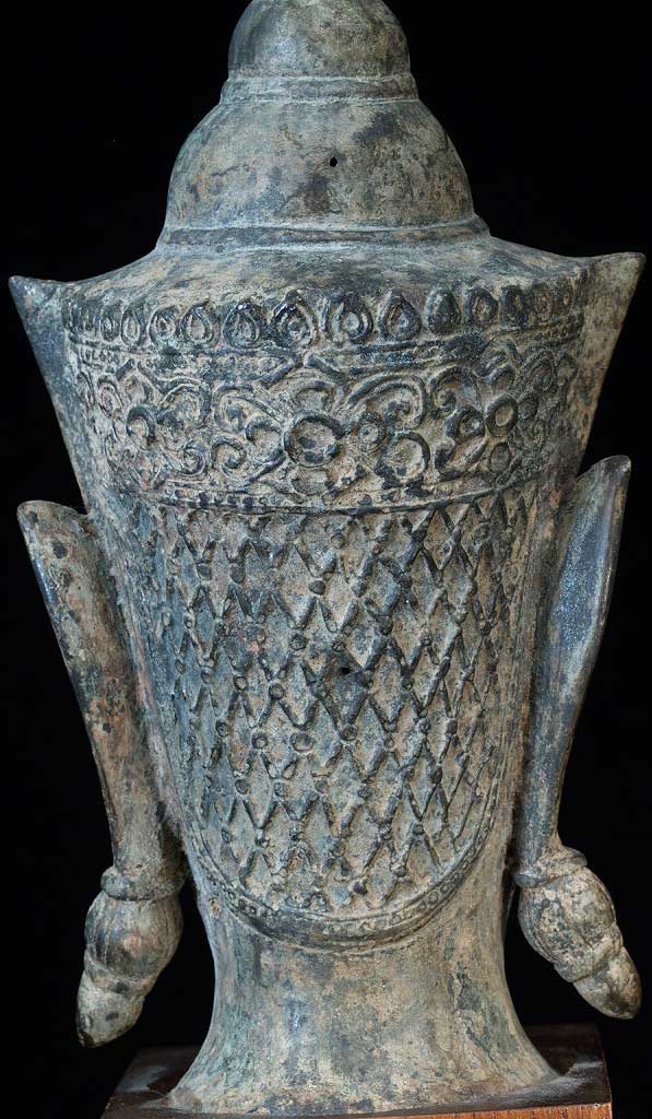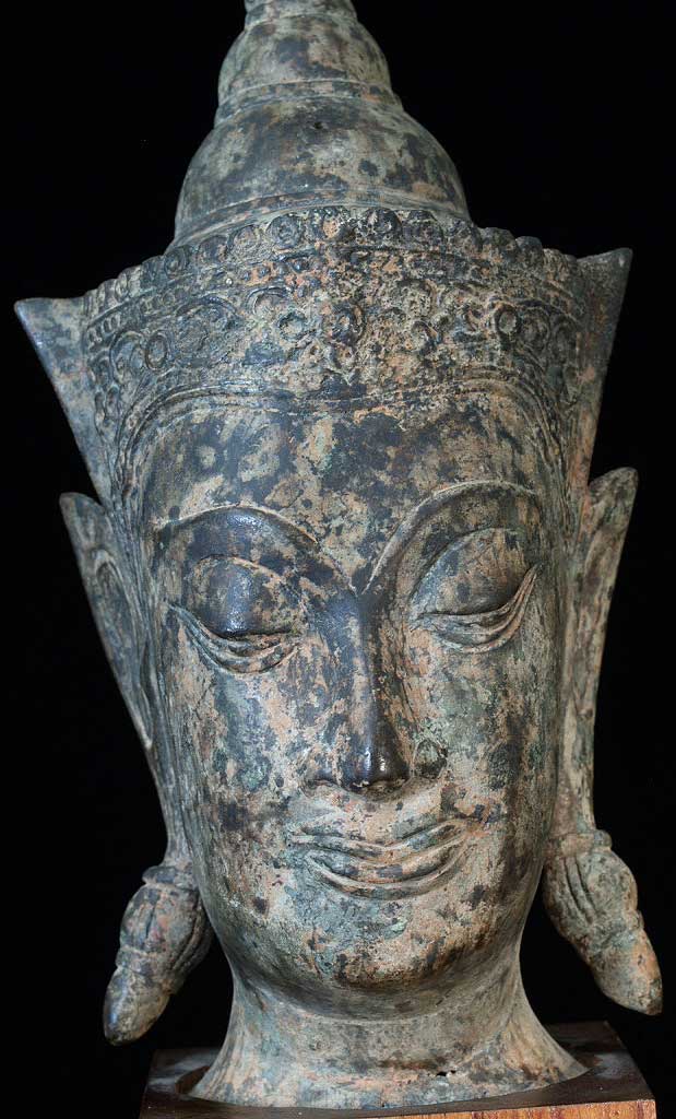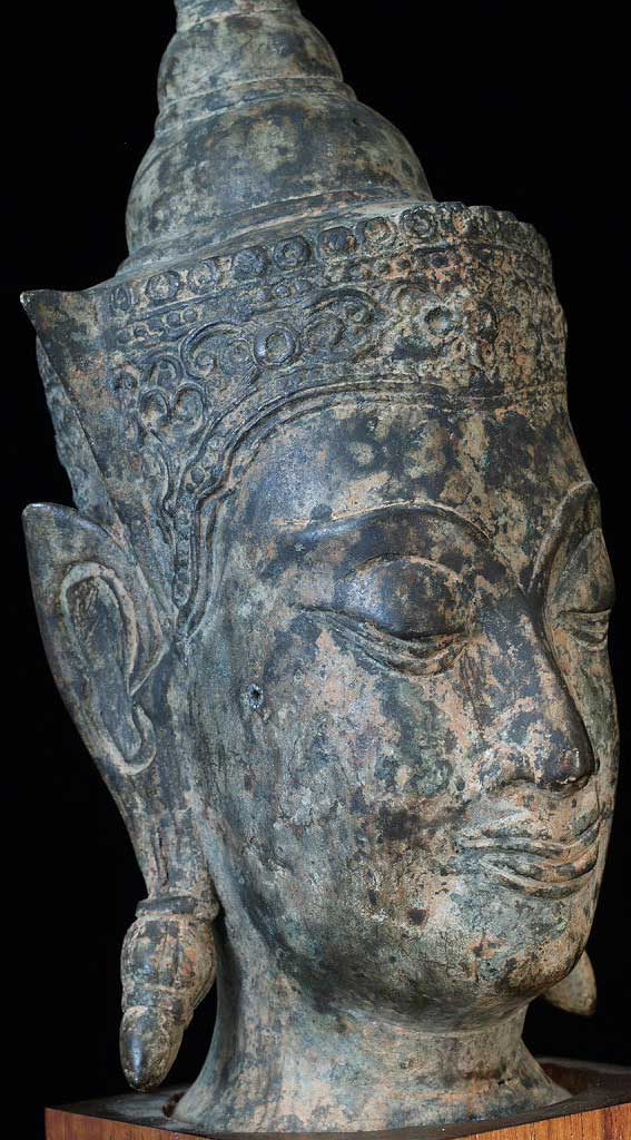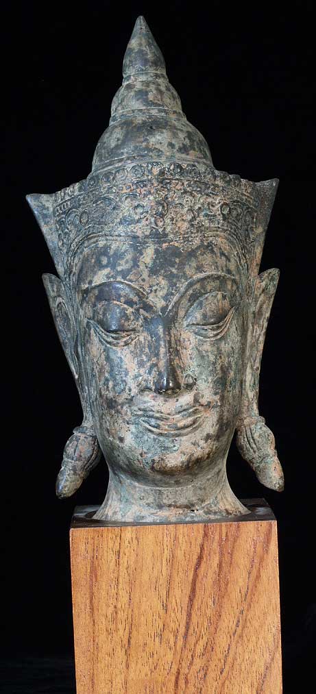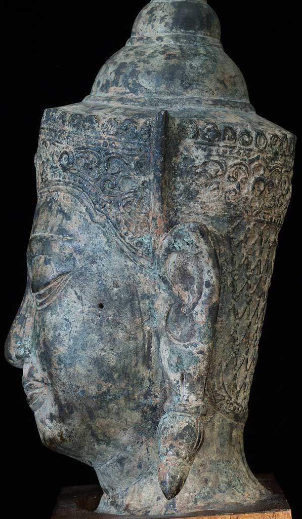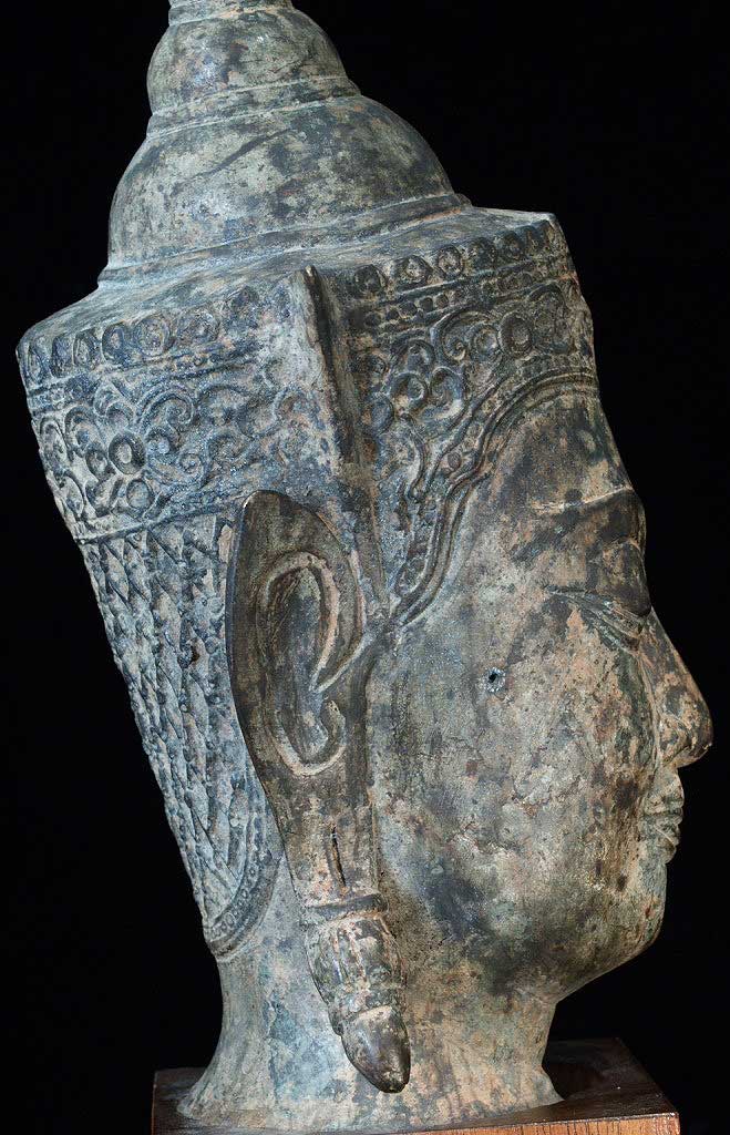 This is a lovely and large vintage/old Thai Bronze Buddha Head with very distinctive styling. It was collected 35 years ago by a man who was living in SE Asia and who worked for Air America (i.e. the CIA). I recently bought a large part of his estate, which included several early rain drums, many bronze statues, early ceramics, and several other wonderful items. It is in a 17/18thC style, but I believe it may actually be cast in the first half of the 20th century, as there were many of this type of head cast at that time, and while it has some legitmate wear, it does not have the typical wear or is of the casting of the 17/18th century examples. As I am unsure of precise age, I will simply say old (I do not believe that it was new when it wad purchased 35 yeas ago). It is a very good size at over 8 inches tall by over 4 inches wide not including the base. With the base it is a full 11.5 inches tall. NOTE: The estate was selling individual items before I came along and negotiated a price for the entire lot - this is one of the few which still has its price tag still on it - which is 1200 DOLLARS!