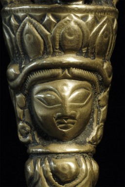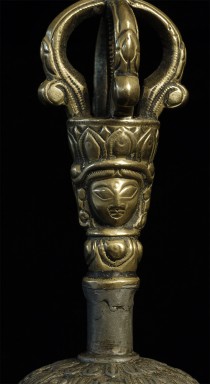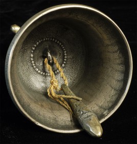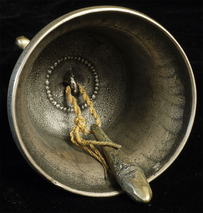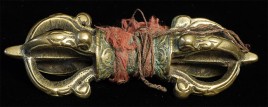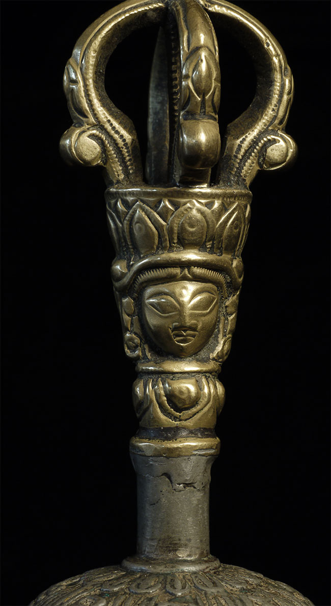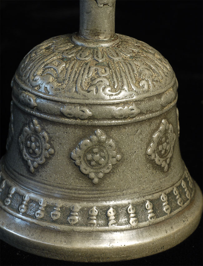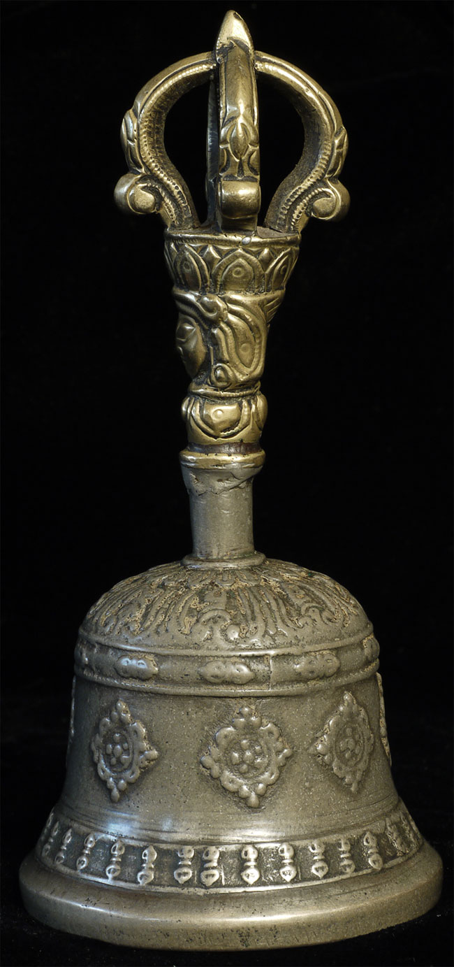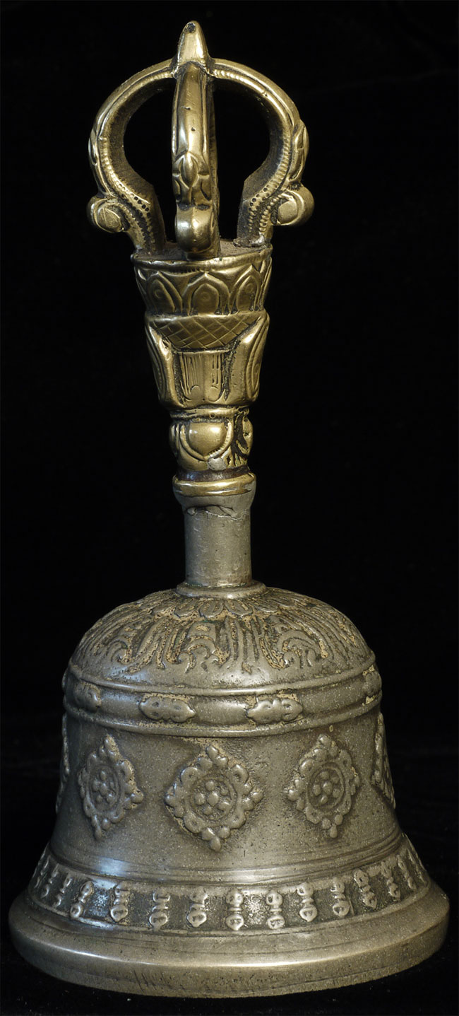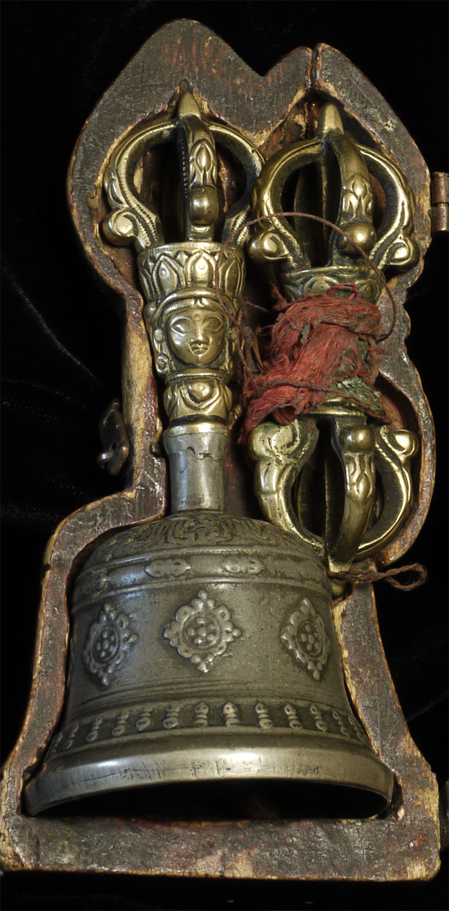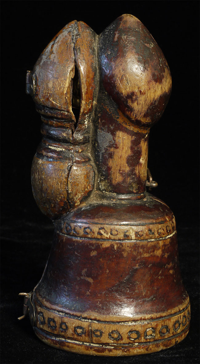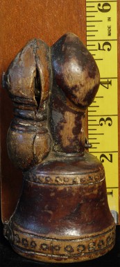 Diminutive antique Tibetan bell and dorge set in a wooden case. Total height including the case is 5.5 inches tall. First set I've encountered in what looks to be the original custom carved case.
