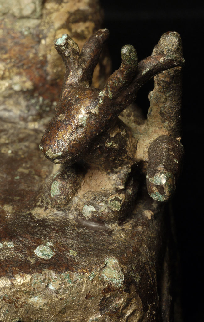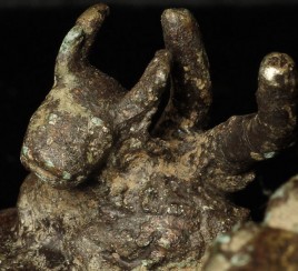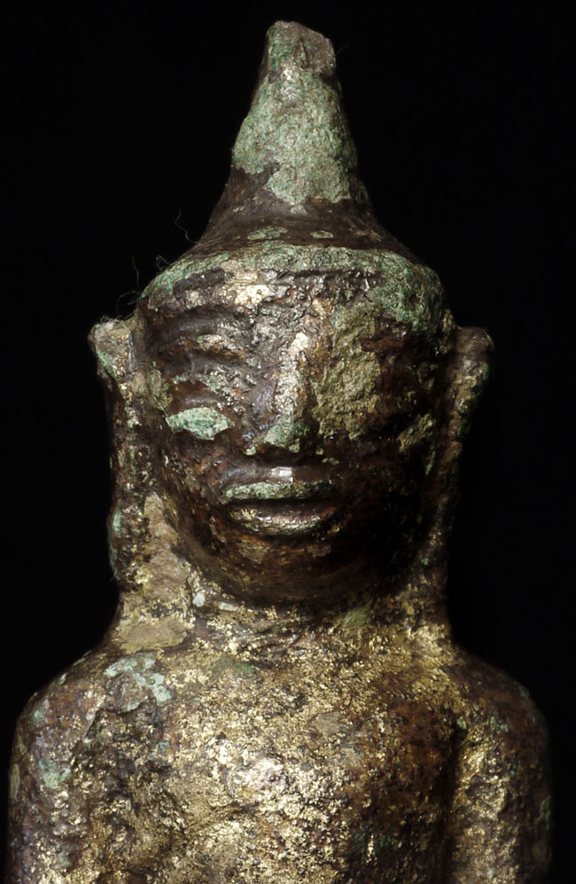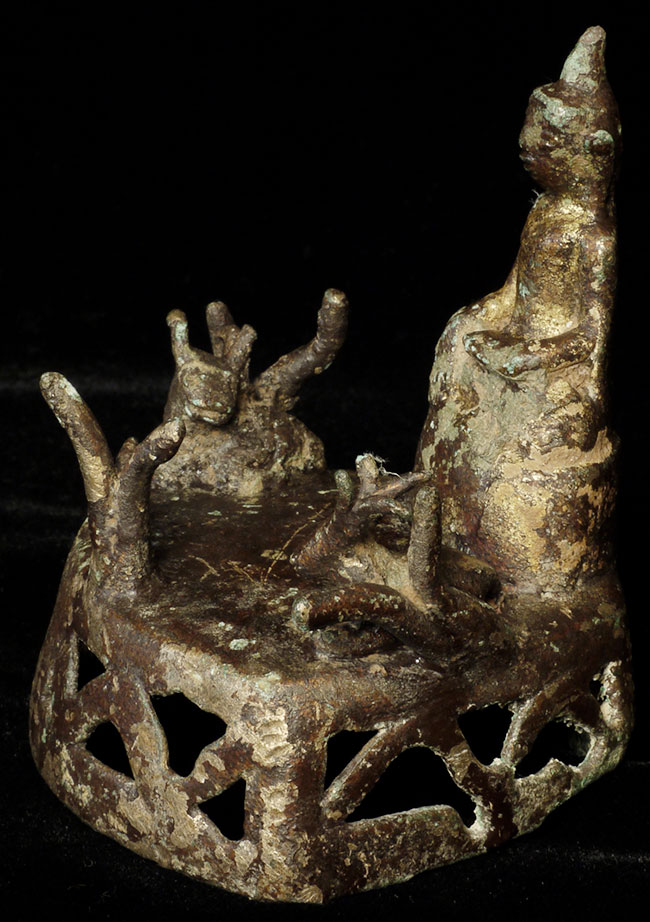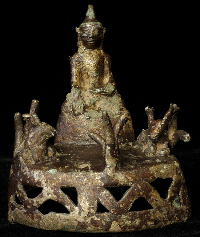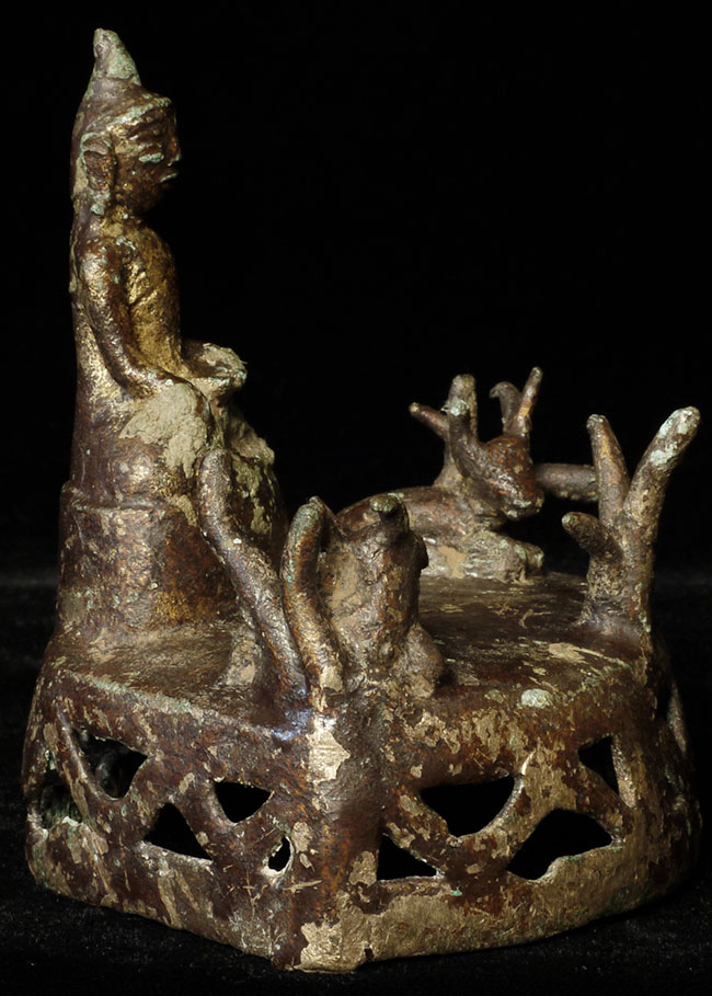 18/19thC Burmese Shan bronze of the Buddha giving his sermon at Deer Park. This type of narrative sculpture was used to teach stories of the Buddha's life, and originally would have been part of a large set. Sits 3.75 inches tall, 2 7/8 inches deep, 3.25 inches at widest point