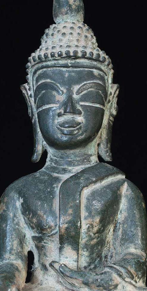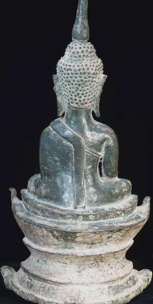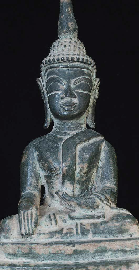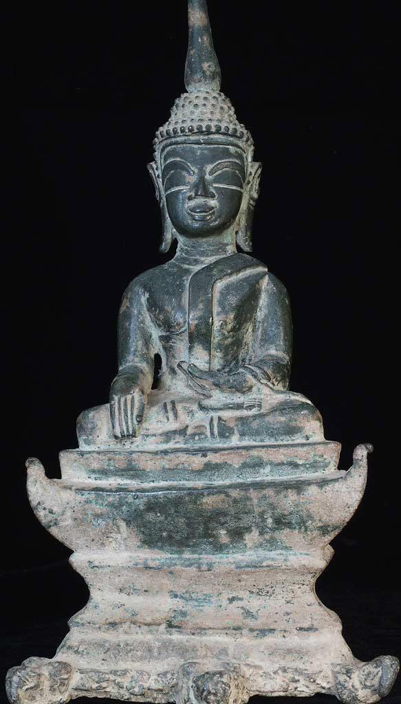 A personal favorite- a delightful and early Laos Bronze Buddha of good size and extraordinary jade green patina. He has a glorious smile, and sits on a boat shaped base (like a money of the period) with the remains of 3 elephant heads holding up the base (an extremely rare feature- one which I have seen only a few times out of many thousands of statues- I have one other listed on my site). He sits a full 11 inches tall, 5.5 inches wide and 4.5 inches deep. One of a kind, and highly desireable. He is a bit more expensive than some others, but he is quite special.