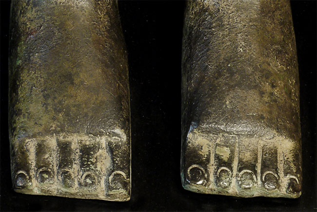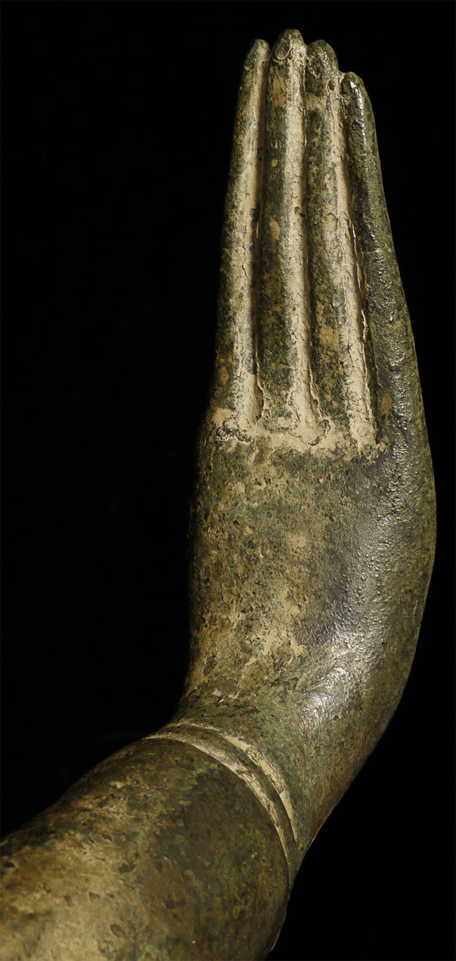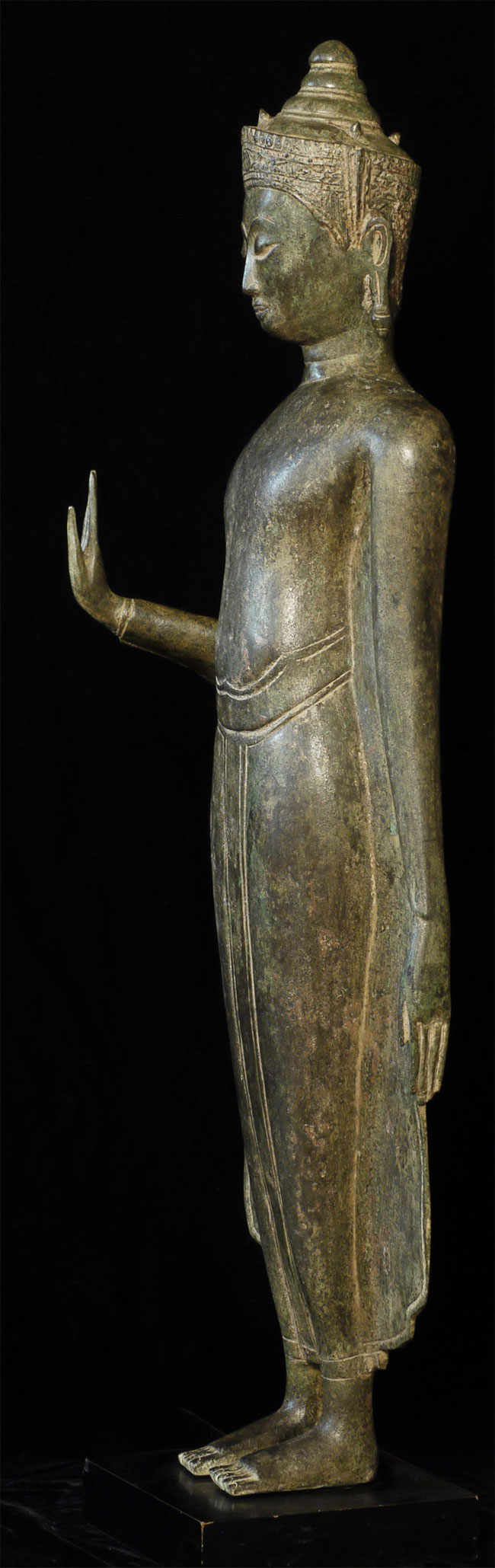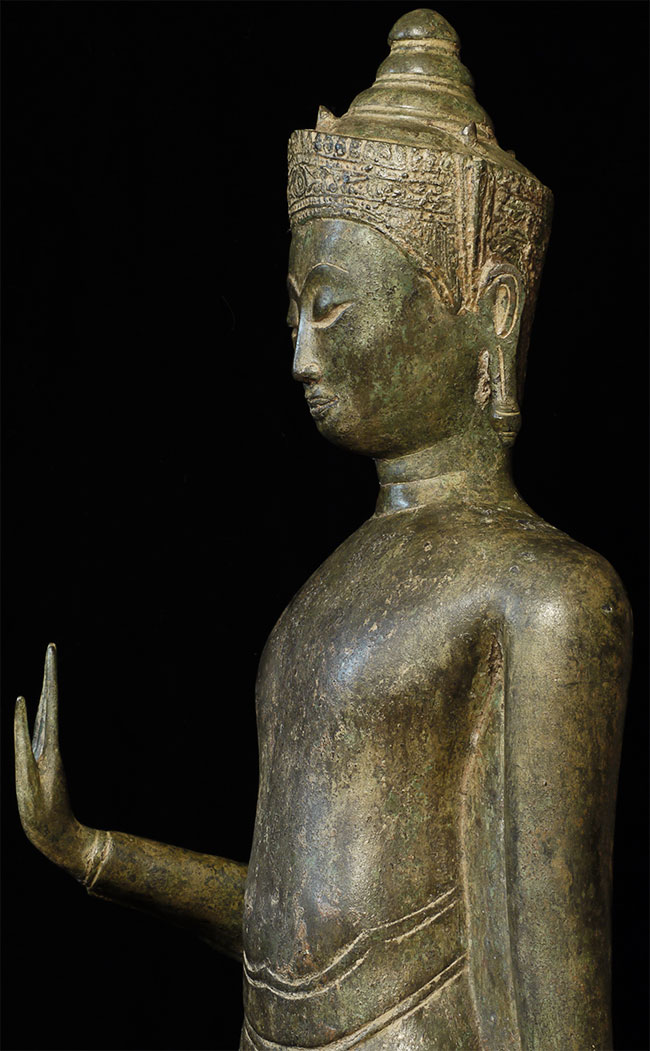 Large and beautiful 18thC standing Thai Buddha. Buddha stands a full 42 inches tall, base adds another 1.5 inches and is 7 x 7 inches square. Very hard to find an authentic one of this type of this size, in this condition, and with such presence. Heavy for its size (seems to be solid cast).