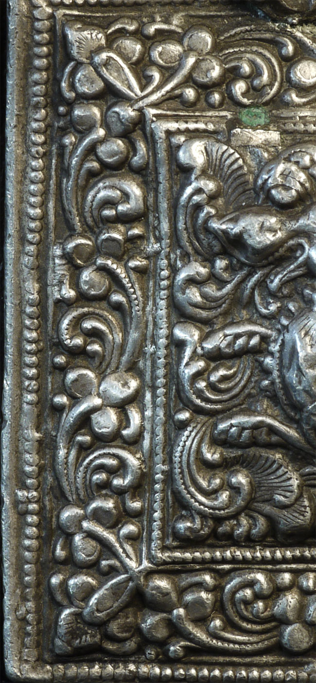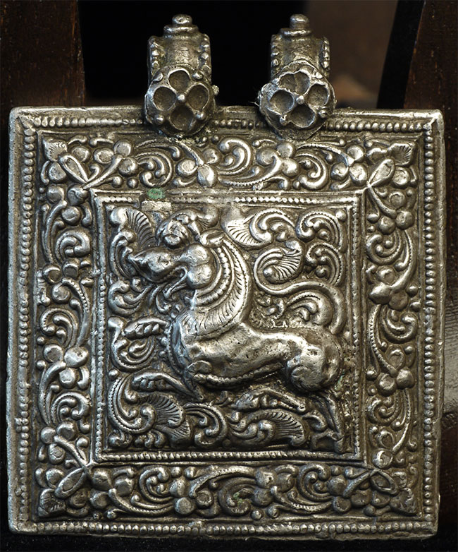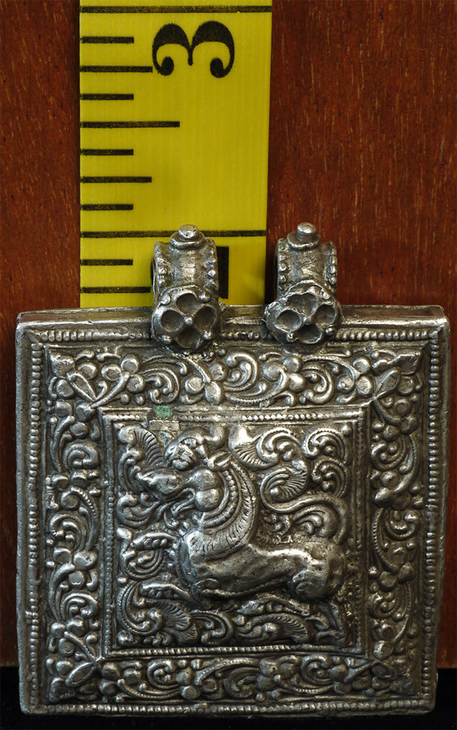 Antique Tibetan, Nepalese, or Indian silver alloy pendant. Possibly a sealed prayer box. Very heavy for its size. Dimensions- 2 x 1.7/8 inches. From an Irish collection of mostly Tibetan Buddhist objects put together in the 1950's and 60's.
