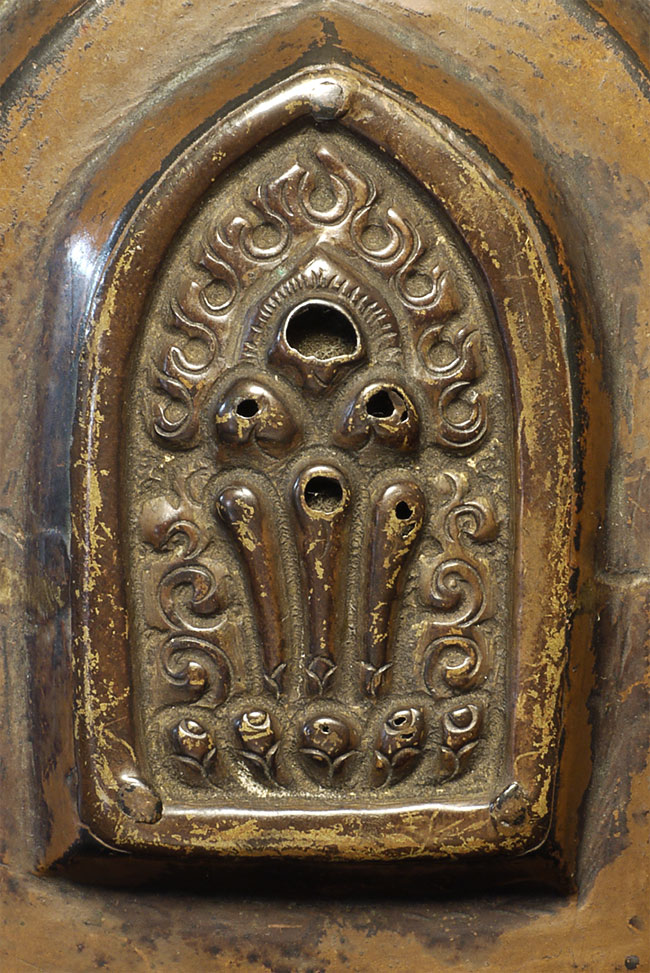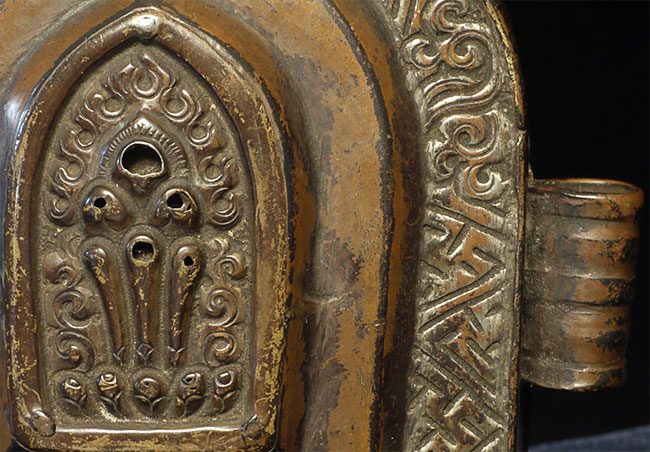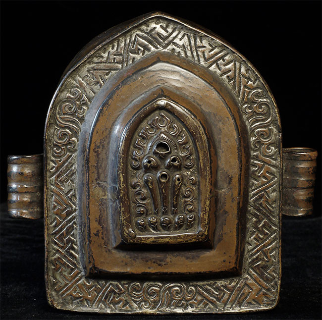 18thC Tibetan copper gau box. Was in a Scottish collection for 50 years. Sits 4.25 inches tall, 3.5 inches wide.