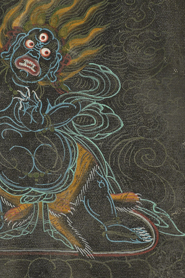 Antique black ground Mongolian thangka. Measures 3.5 x 4.25 inches. Outstanding example of its type.