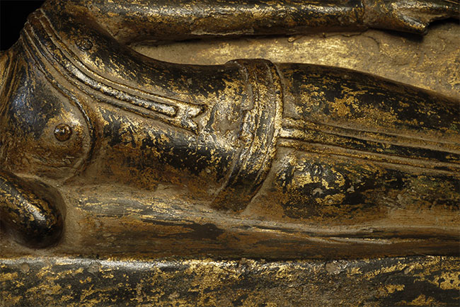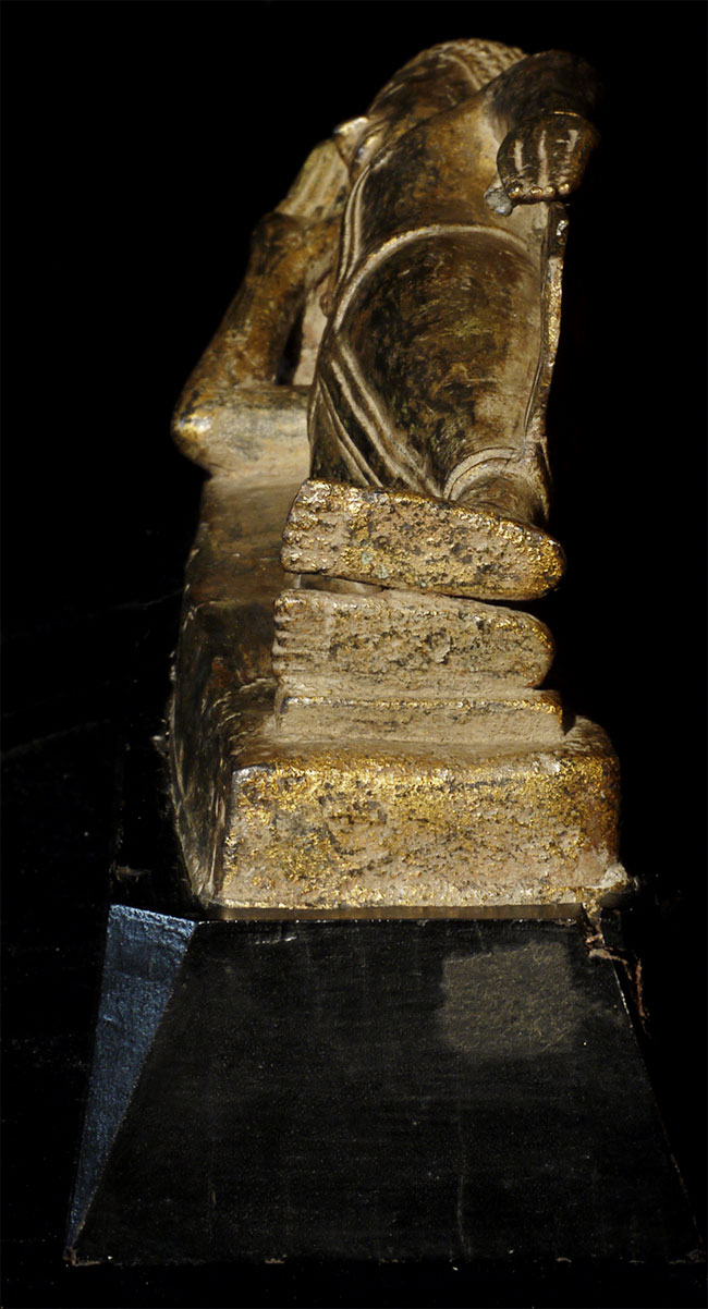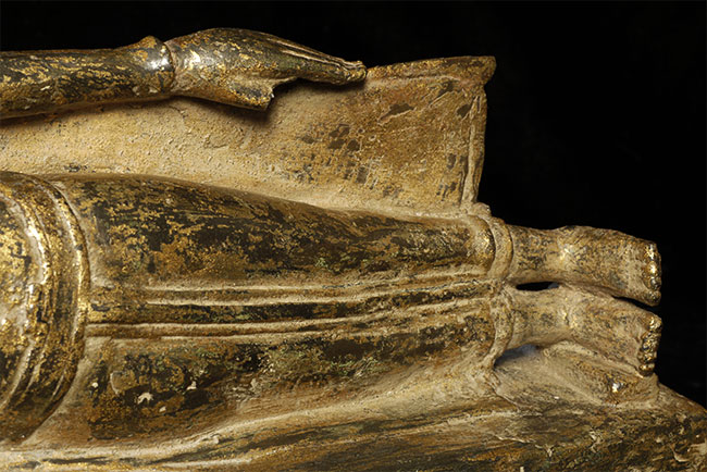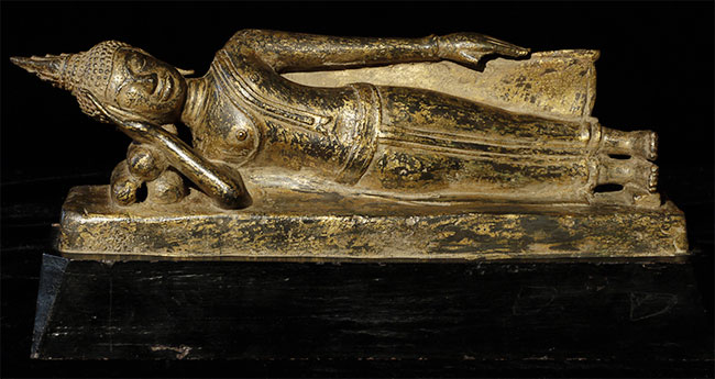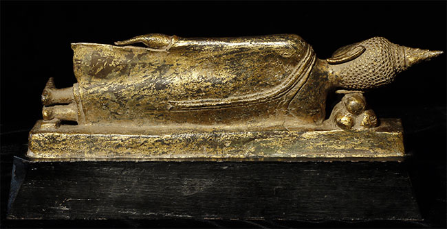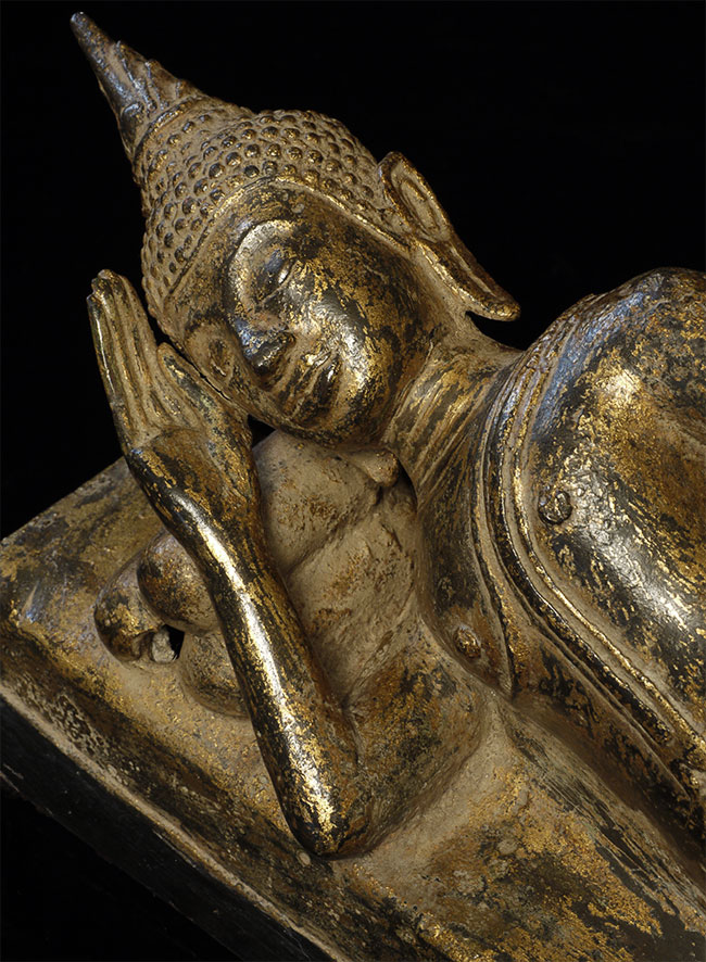 Thai Ayuthaya style 16/17thC reclining Buddha. Rare type. Loss of a few finger tips- otherwise excellent. Most of original lacquer and gilding remain. Buddha is 13 inches long, base measures 3.25 x 12 3/8 x 1.75 inches. Total height is 5.25 inches.