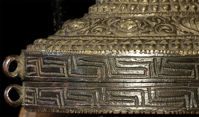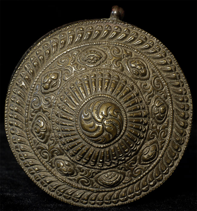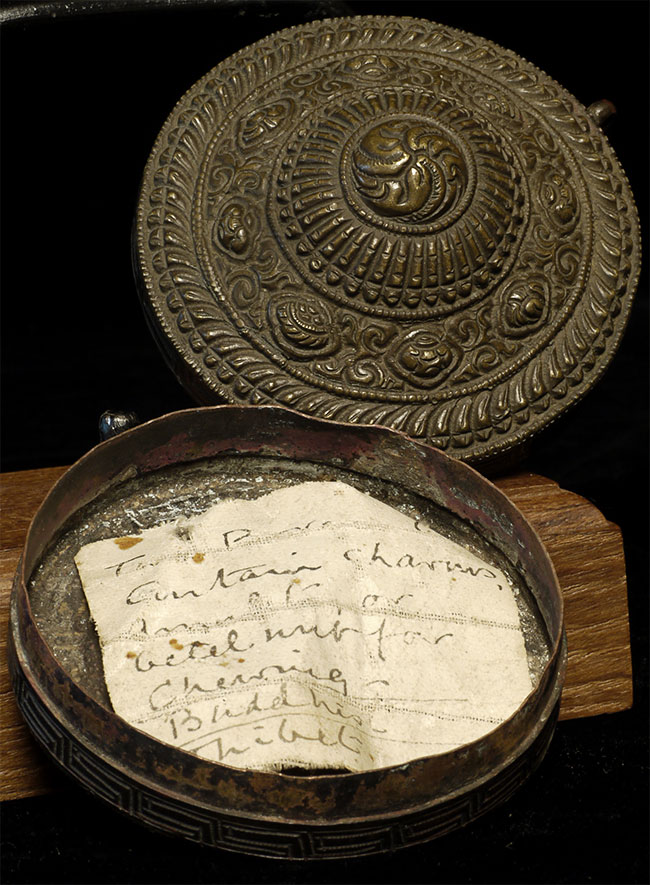 Antique Tibetan lime(?) box with intricate design. Was in a Scottish collection for 50 years. Size: 2 5/8 inch diameter