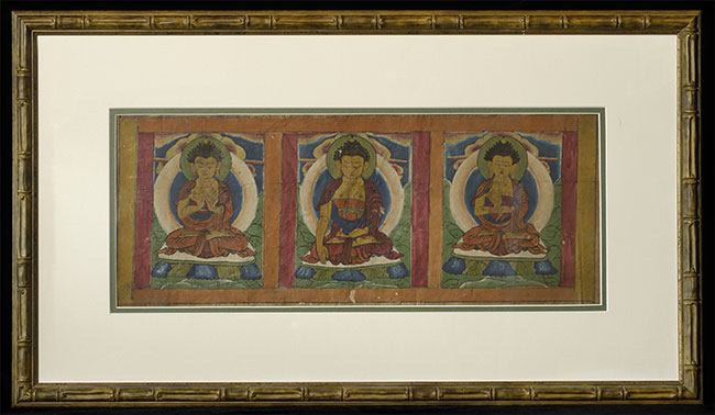 Antique Tibetan Thangka. Size is 7.75 x 19 inches. Frame measures 16 x 27 1/8 inches.