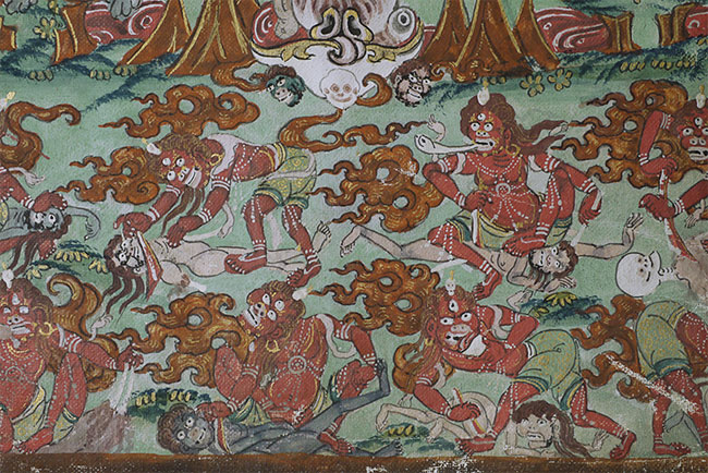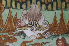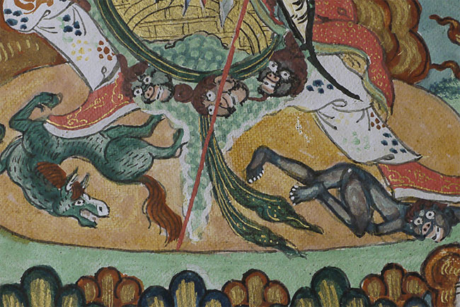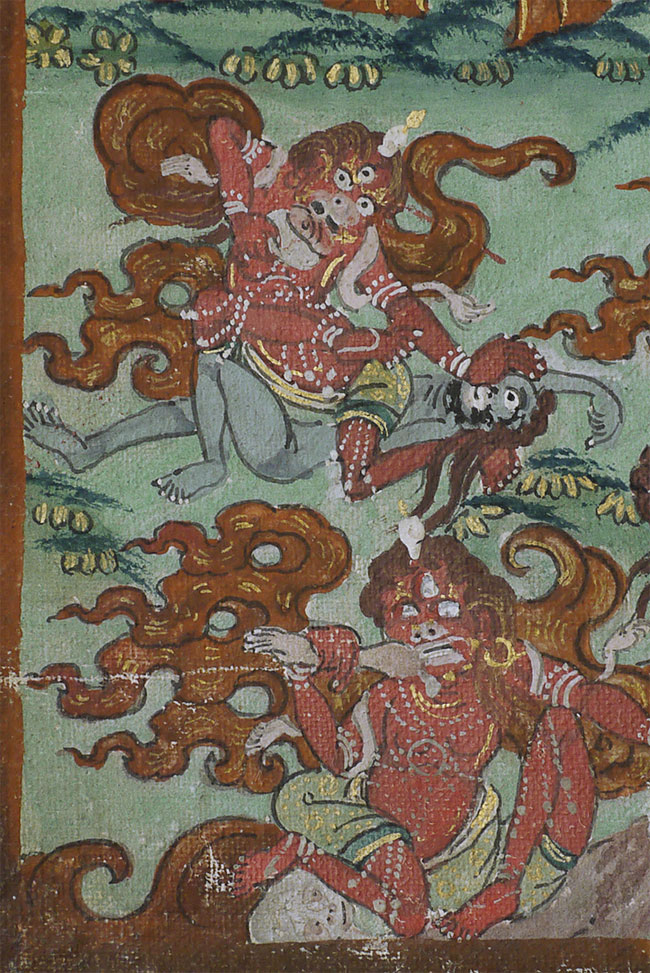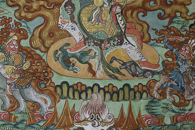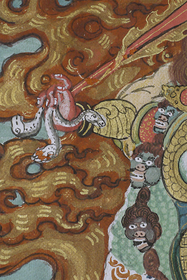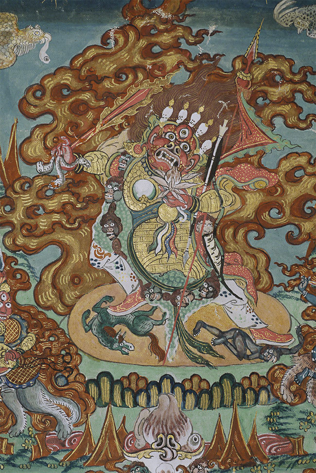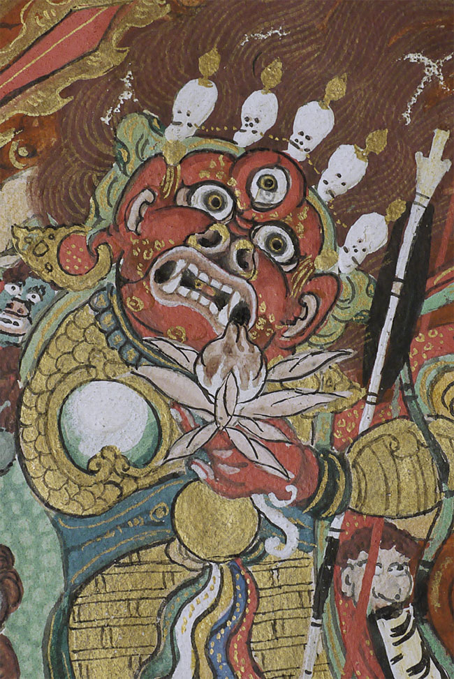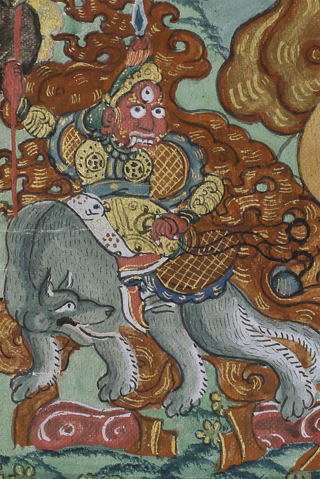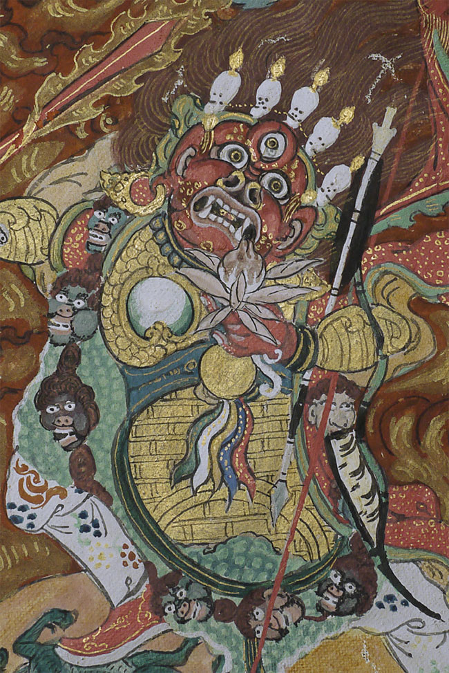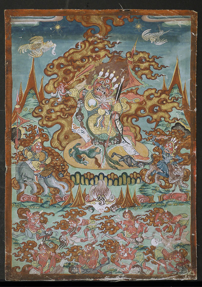 Top quality antique Mongolian Thangka. Measures 8.75 x 12 3/8 inches. Powerful, animated, intricate, intense, and very beautiful. In exceptional condition.