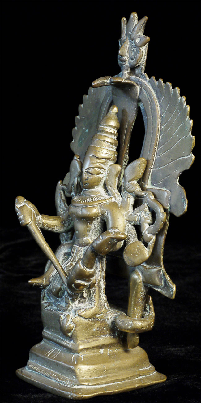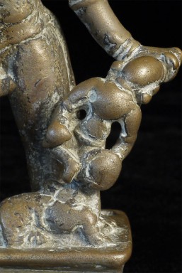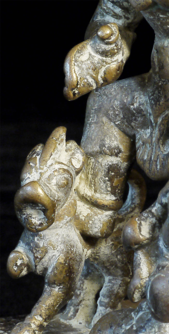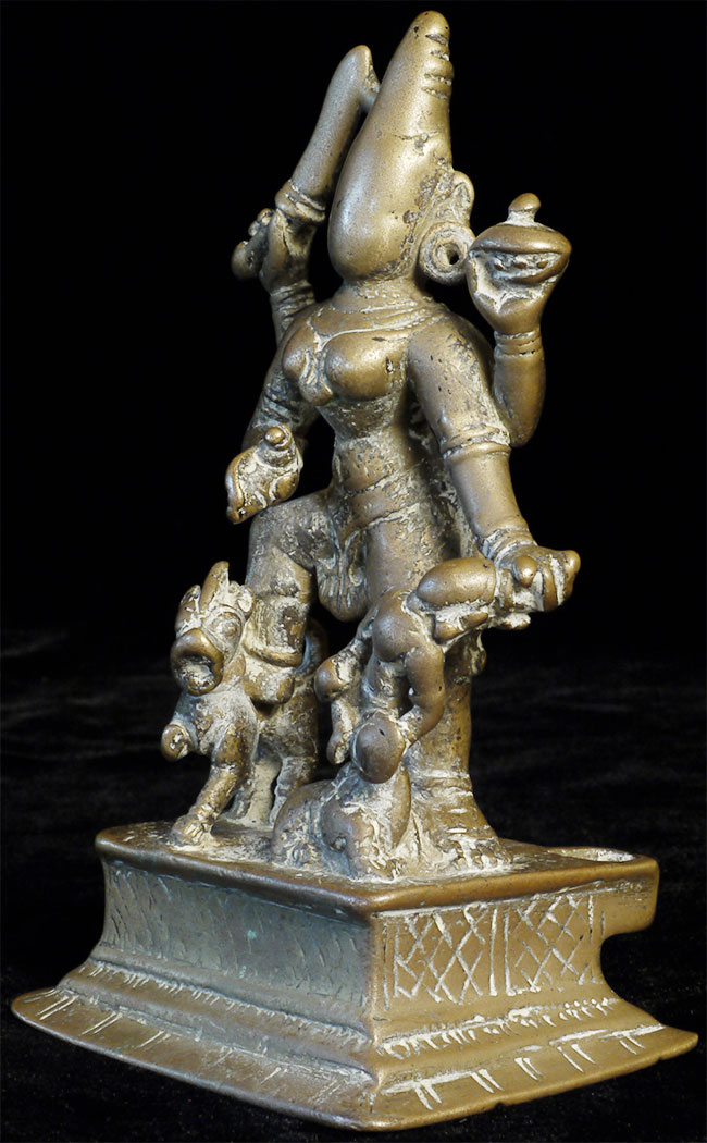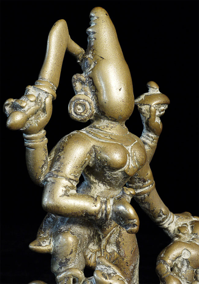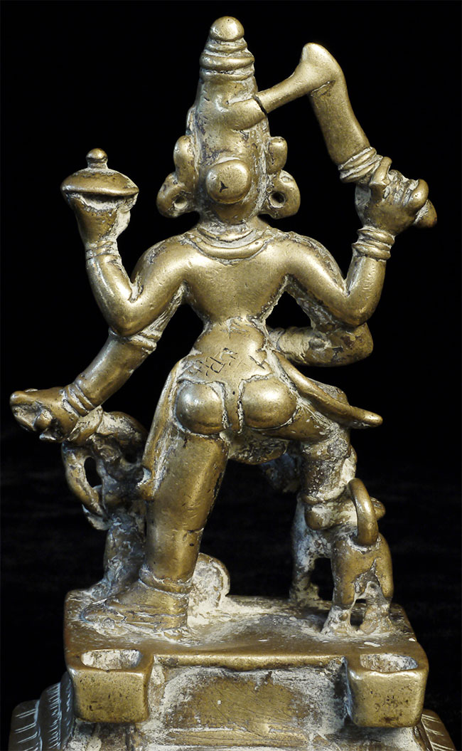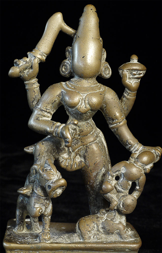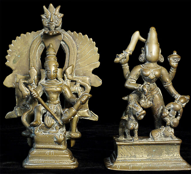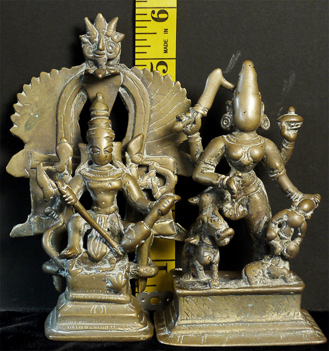 Pair of antique Indian Durga figures. Both with considerable ritual wear. One retains original backplate. Taller of the two pieces is 6 inches tall with backplate.