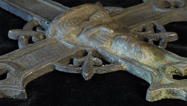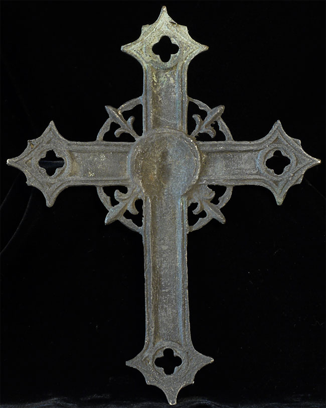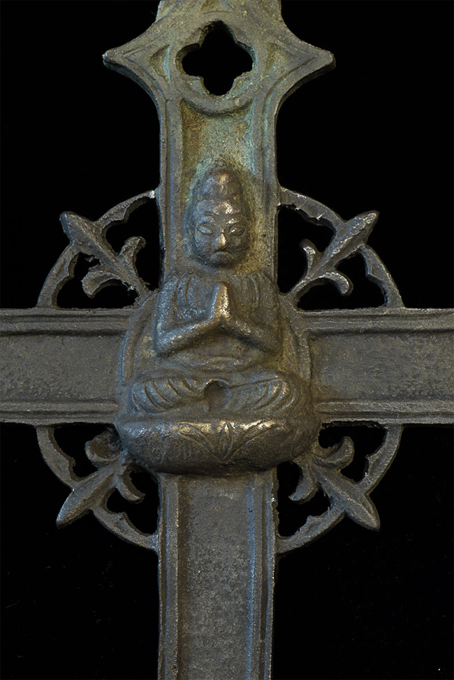 Very rare 16/17thC Japanese Bronze Cross with Buddha. I've owned 3 iron examples of this over 25 years, and seen one other at auction. I recently purchased 2 bronze (or other alloy- a magnet does not stick) examples, of which this is one. I've been told they were used by early Japanese Christians, as they were persecuted by the Shoguns, and wanted to show that they still respected the Buddha. 9.75" tall, 7.75" wide, approximately .5" at deepest point.