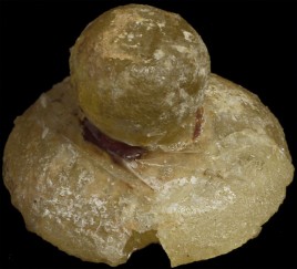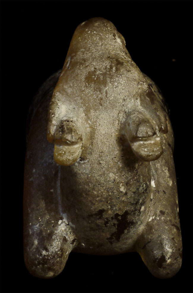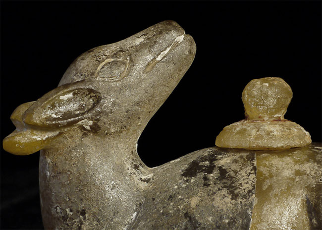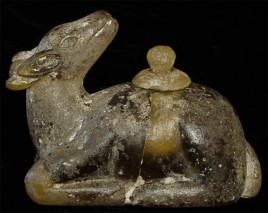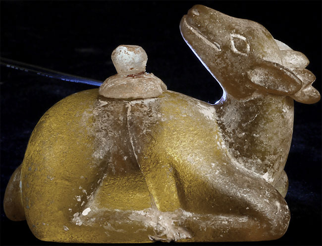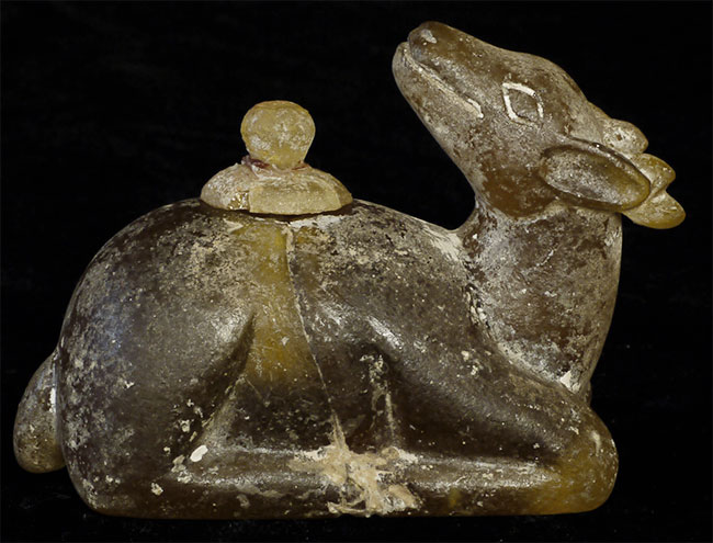 This is a wonderful yellow ancient carved glass reliquary deer with original contents from Northern Thailand. It was dug up 30 years ago in the "Hot" or "Hod" district before an area that previously had a number of early temples was flooded to make a reservoir. Any Thai early glass Buddhas are rare: the ones made out of this extremely dense glass are rarer. The glass includes gold and other precious metals, which gives it intense weight and an oxidized surface. This piece is as good as the best pieces in Thailand museums. 3.25 inches long, 2.75 inches at the tallest point. Either carved from 2 attached pieces of glass or cracked long ago. Two backlit photos show translucent quality.