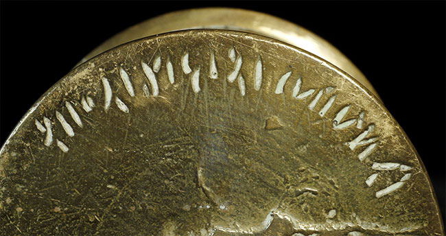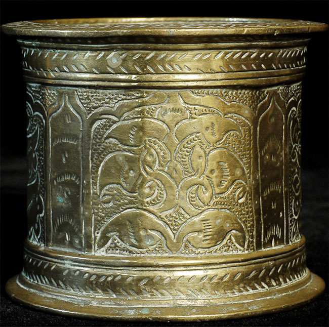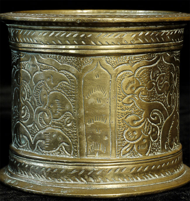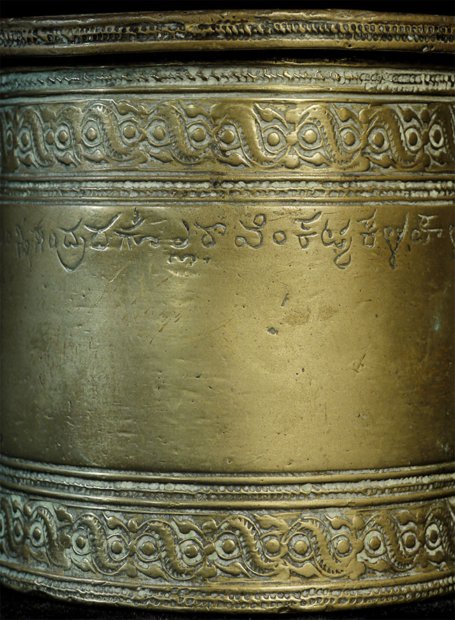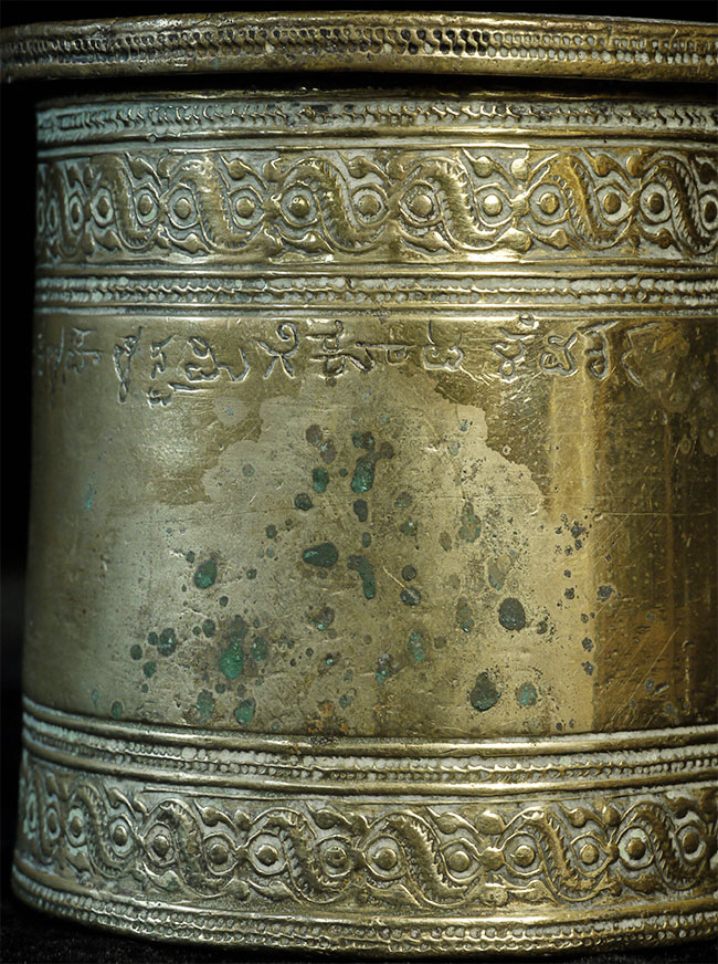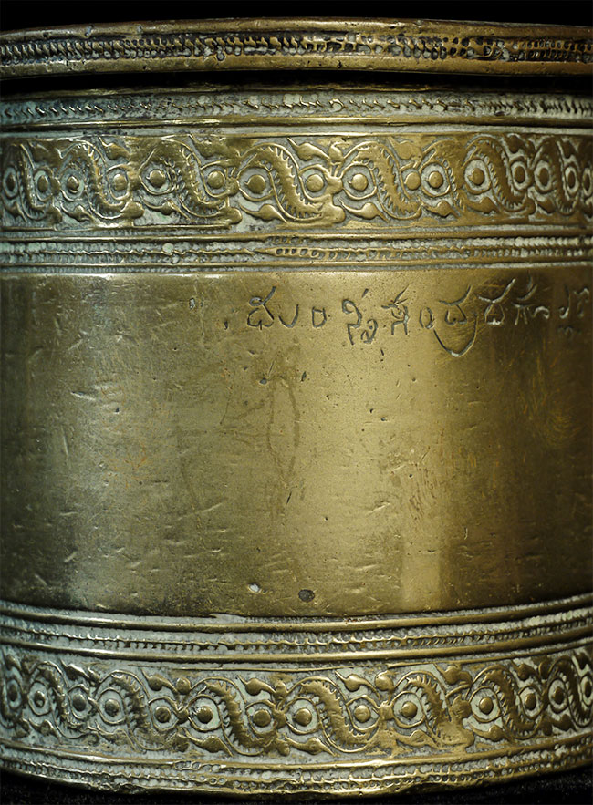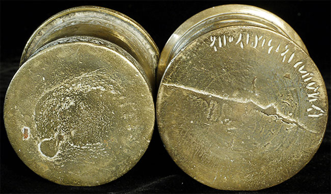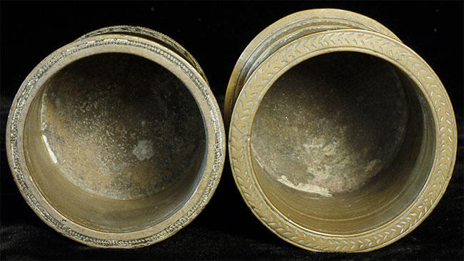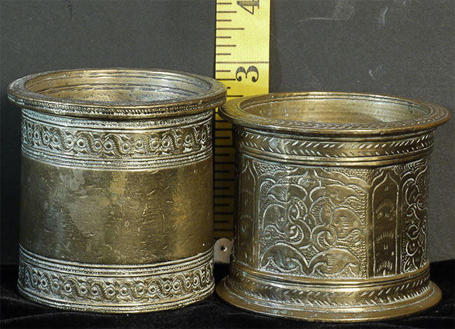 Pair of thickly cast antique bronze or brass Indian (?) ritual cups with writing on them. Taller of this pair is 2.75 inches tall