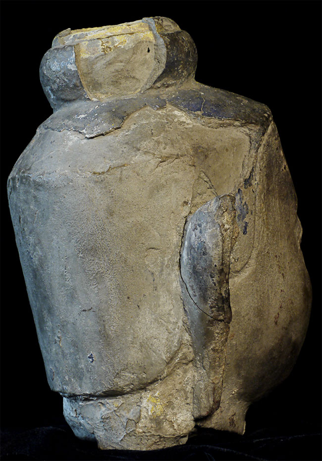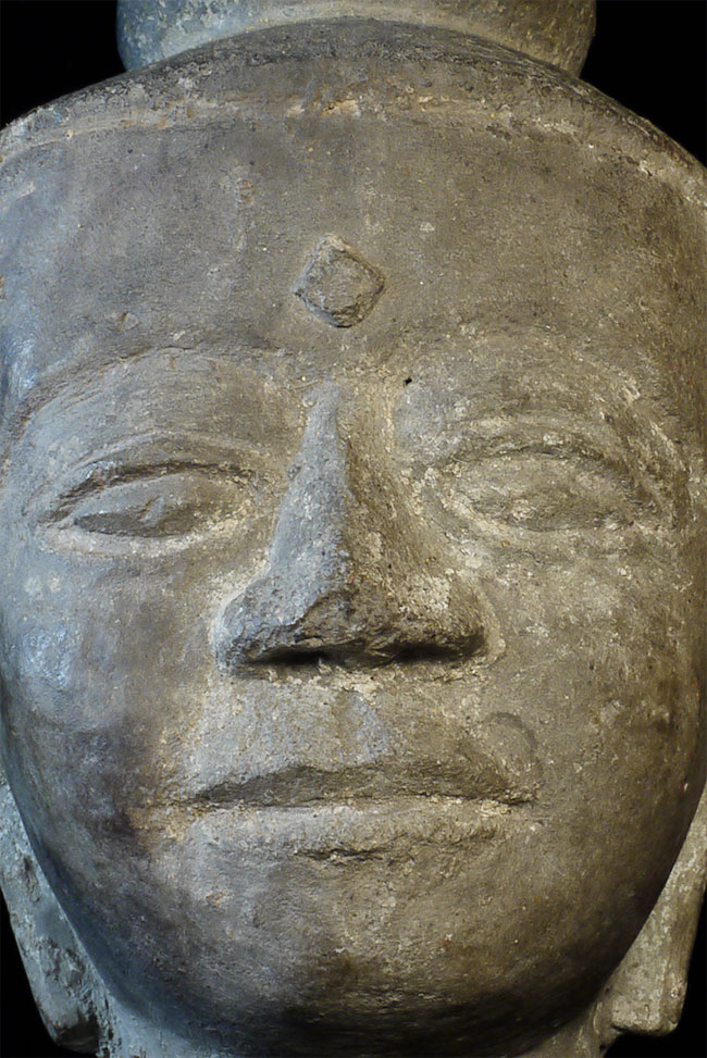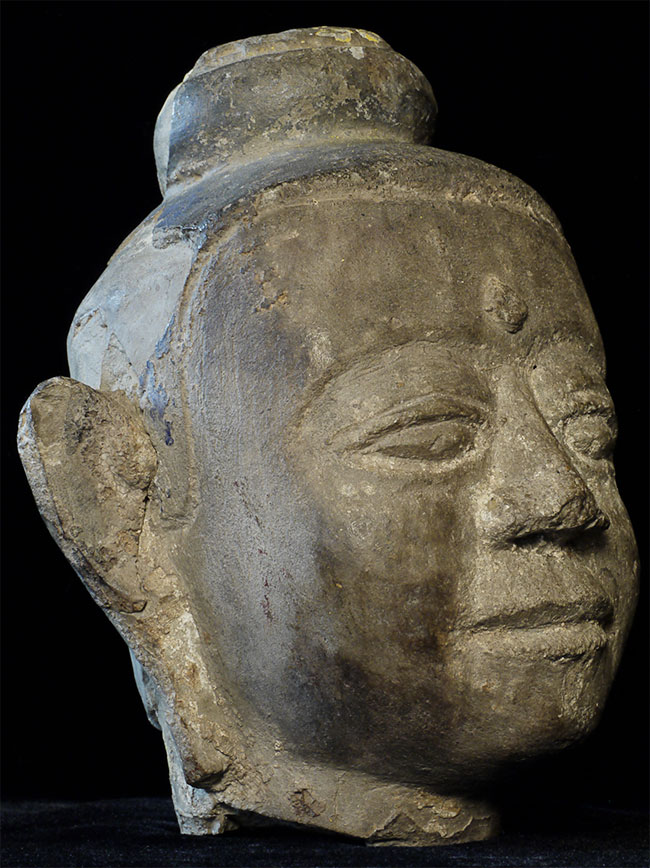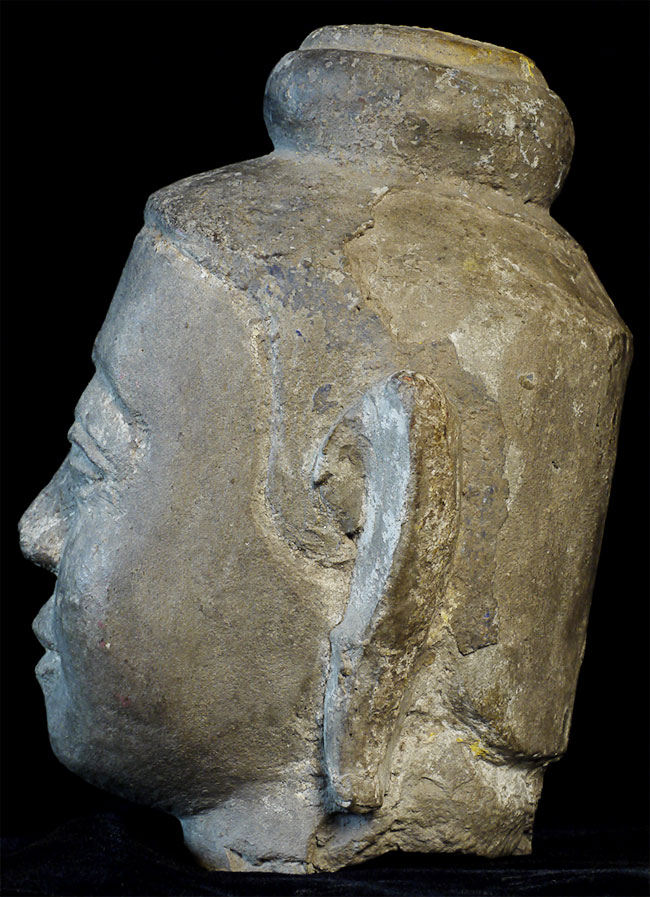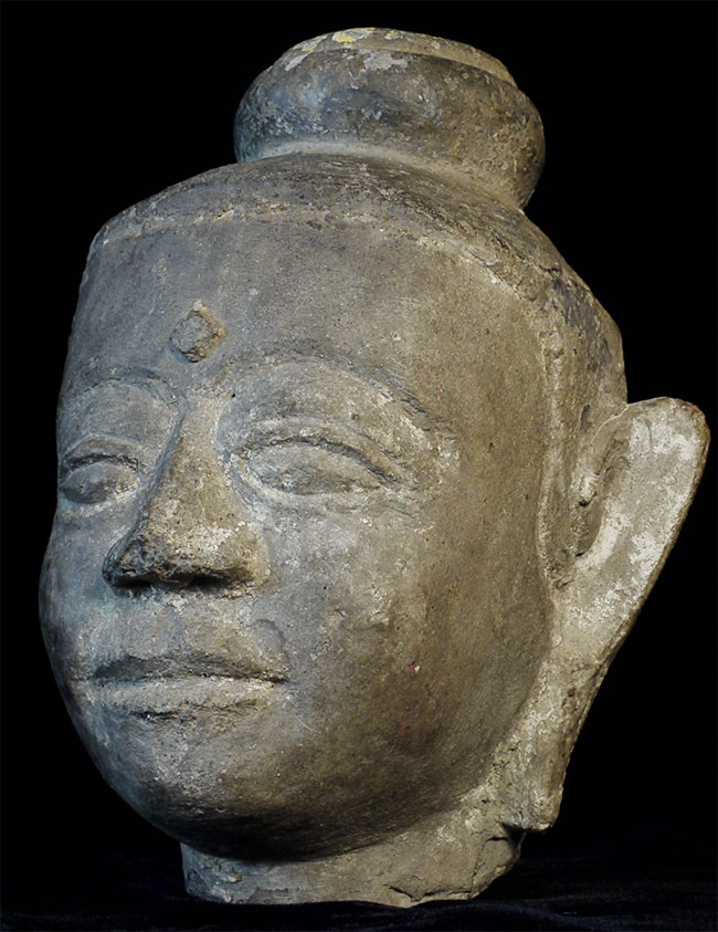 15 - 17thC Cambodian Stone Buddha -- very uncommon and lovely type -- easy to see authenticity. Traces of original polychrome remain. Losses and part of one ear re-attached as seen in the photos. Approximately 7 inches tall.