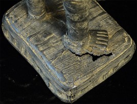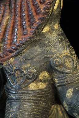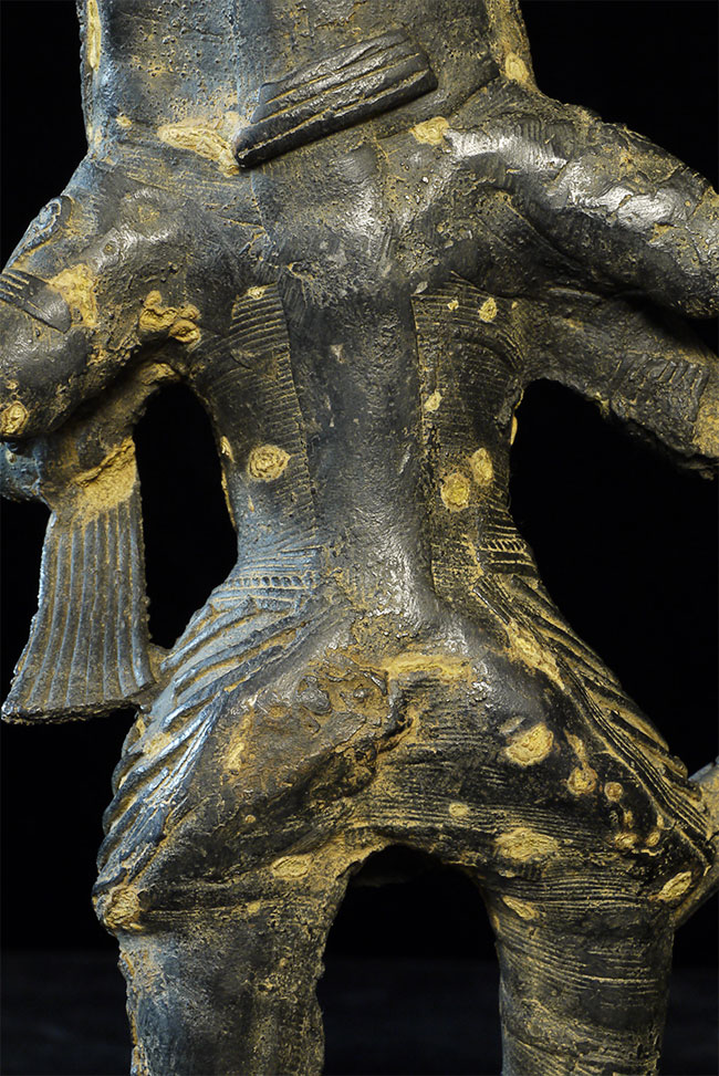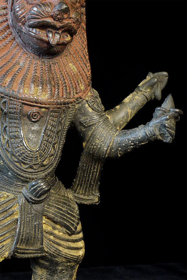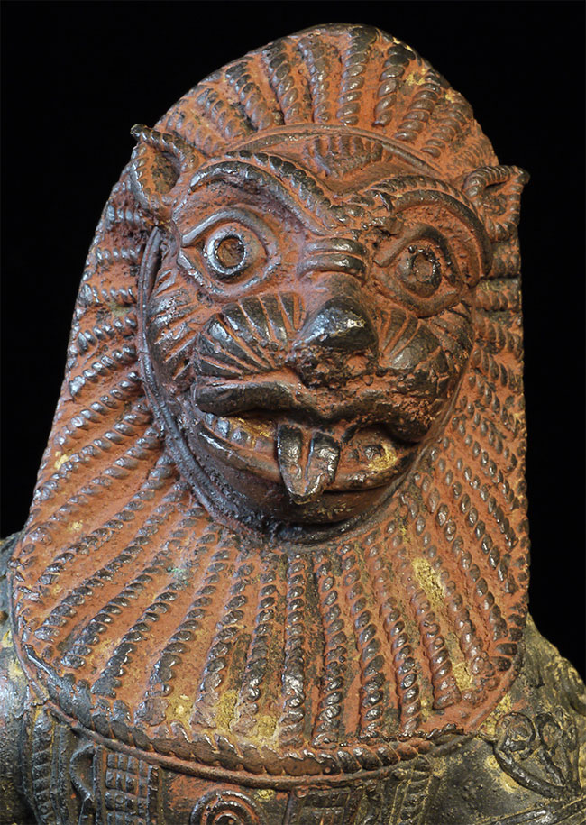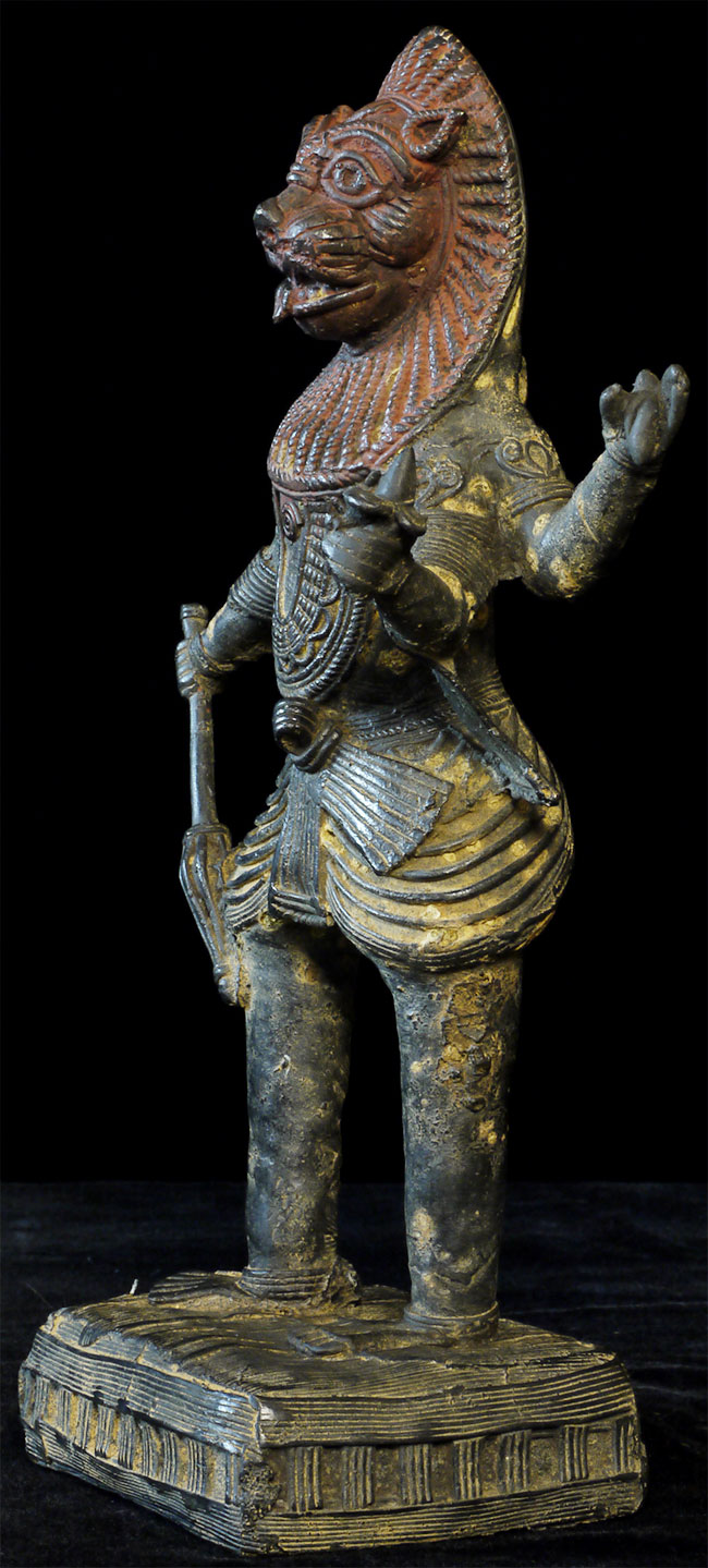 Delightful vintage/old folk-style emanation of Vishnu(Narashima). Probably from Nagaland region of India. Missing one hand. Remains of red and yellow puja powder. Good size at 10.5 inches tall. Lots of personality- everyone who looks at him smiles.