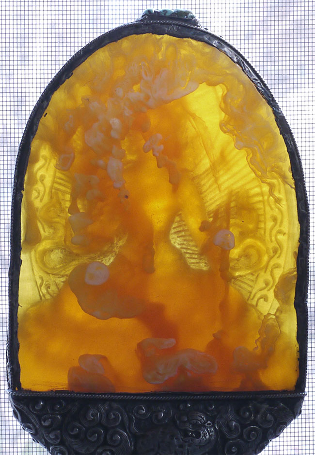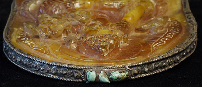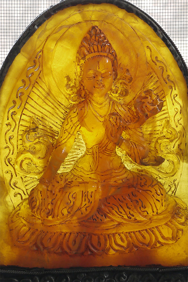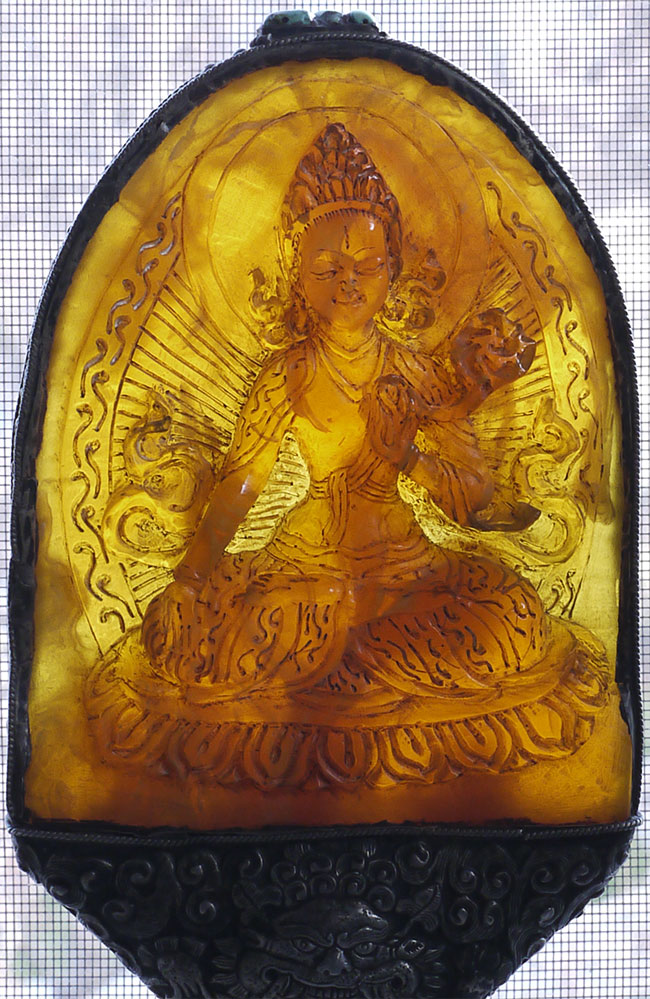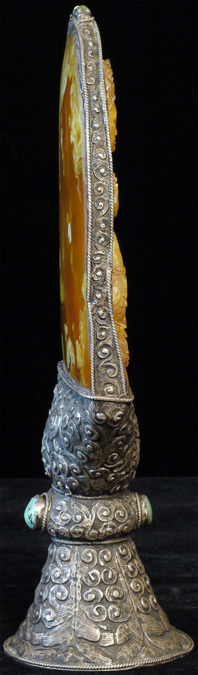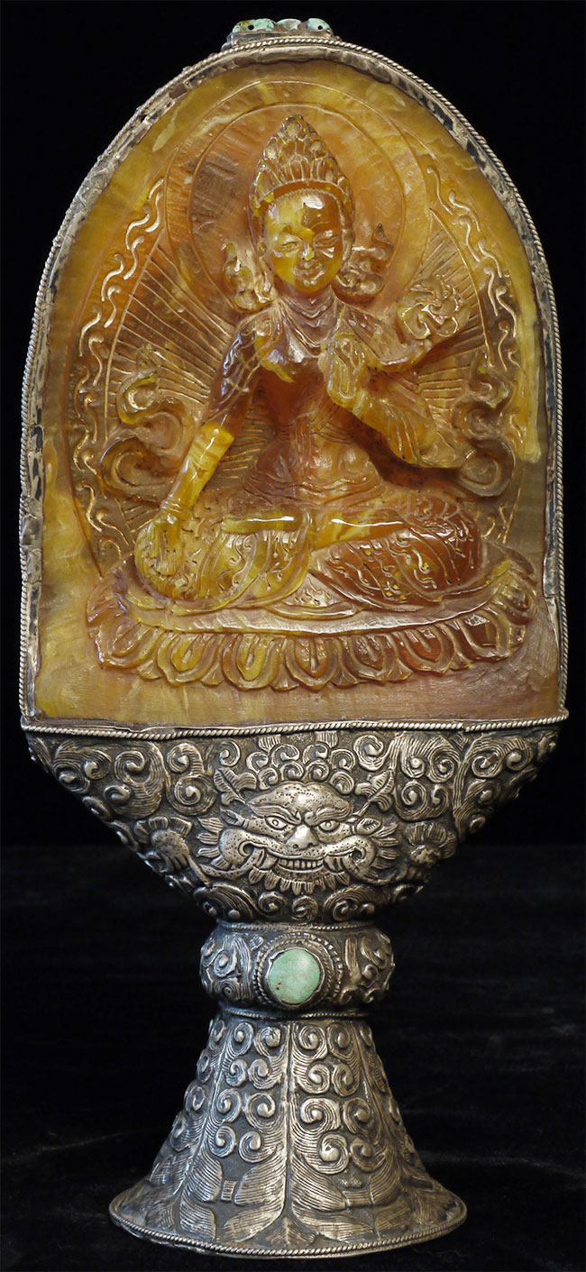 Superb vintage/old Nepalese Altar piece. Made of "Tibetan silver", amber, and turquoise. Very fine silverwork, and beautiful central figure. 9 3/8 inches tall.