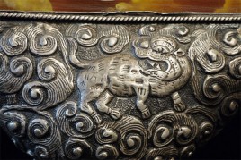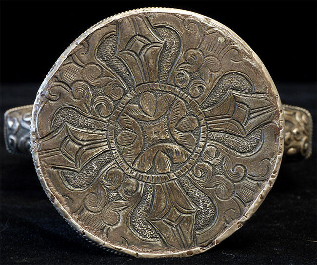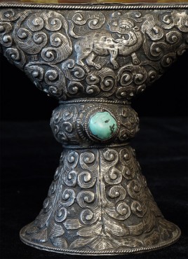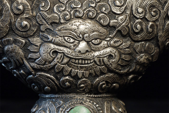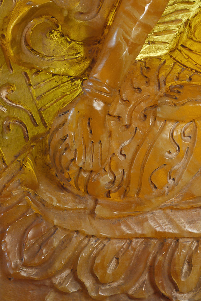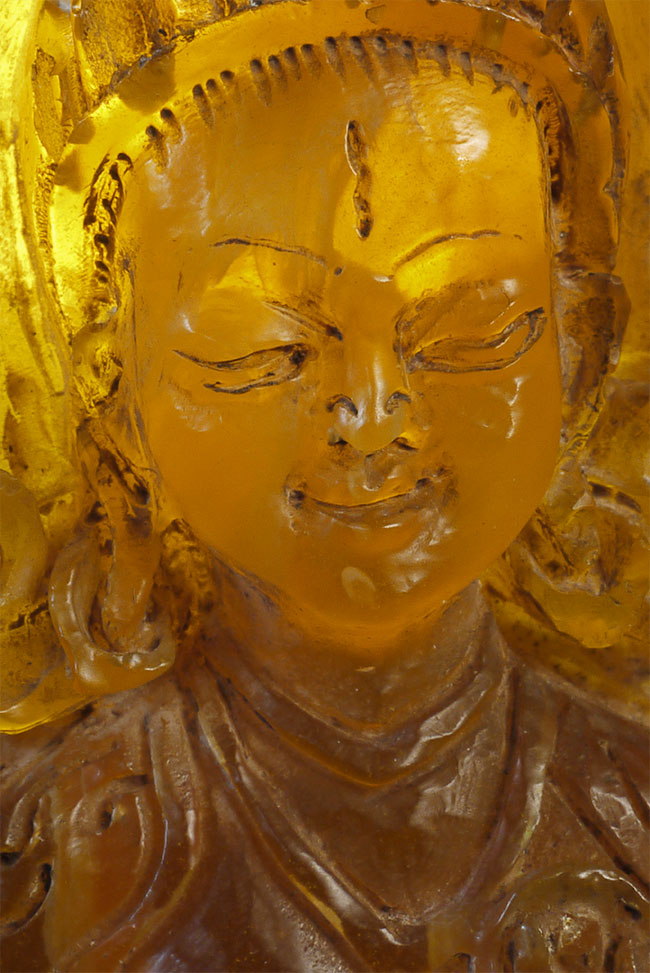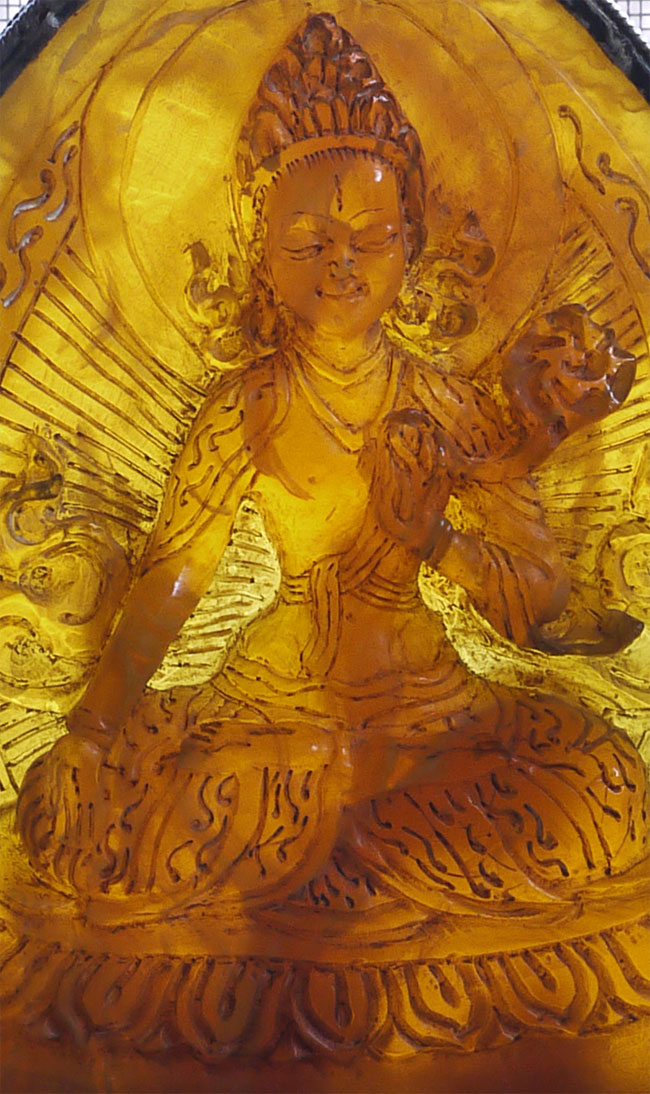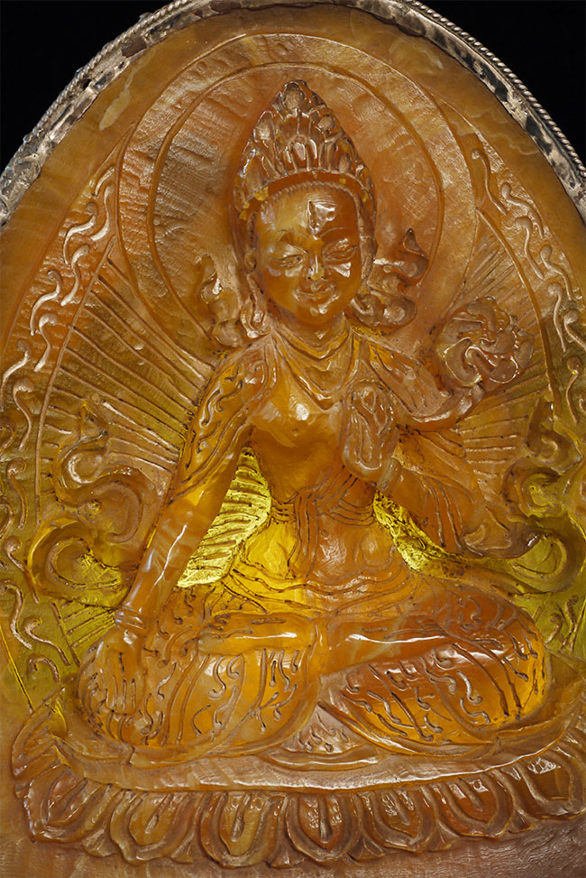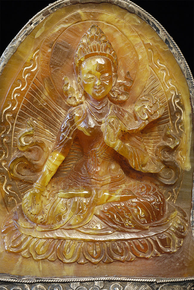 Superb vintage/old Nepalese Altar piece. Made of "Tibetan silver", amber, and turquoise. Very fine silverwork, and beautiful central figure. 9 3/8 inches tall.