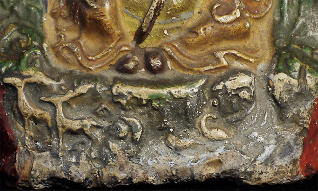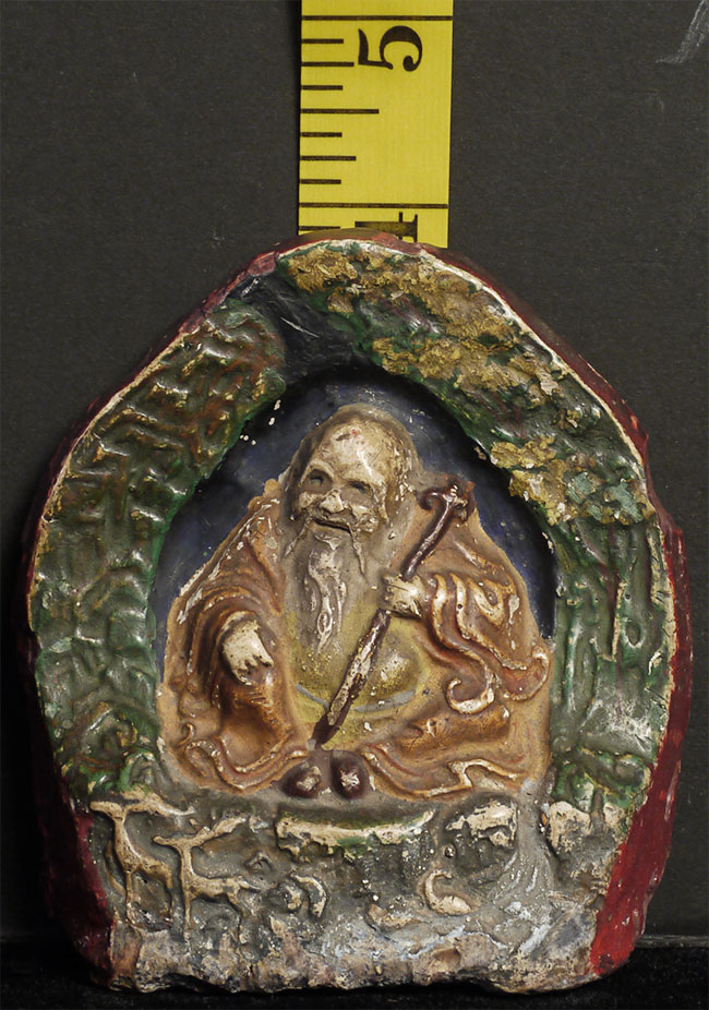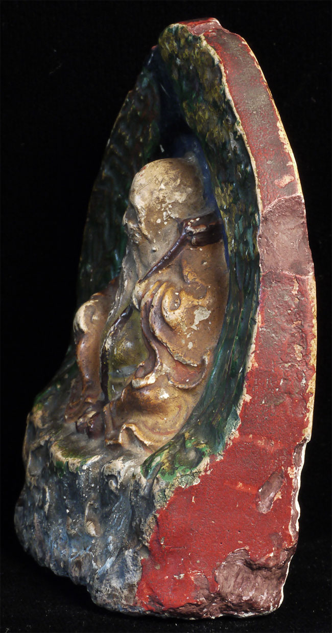 Unusual Antique Mongolian Tsa Tsa. Carved of a very soft crumbly plaster-like stone or stone-like material. Great personality and presence. Sits 3 7/8 inches tall