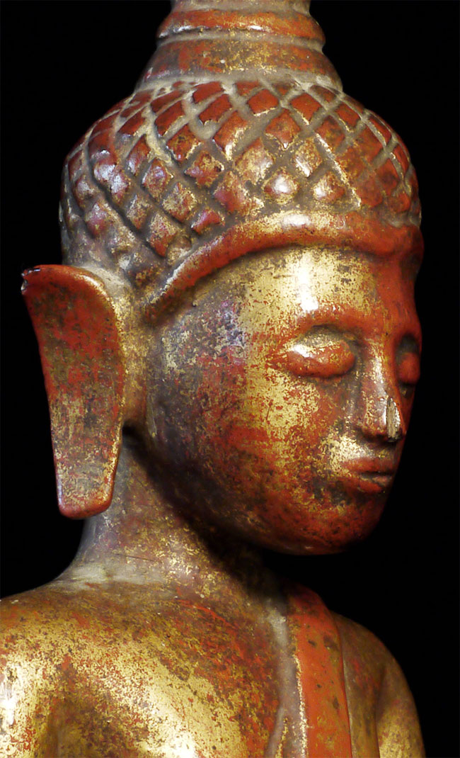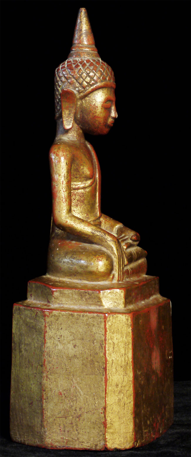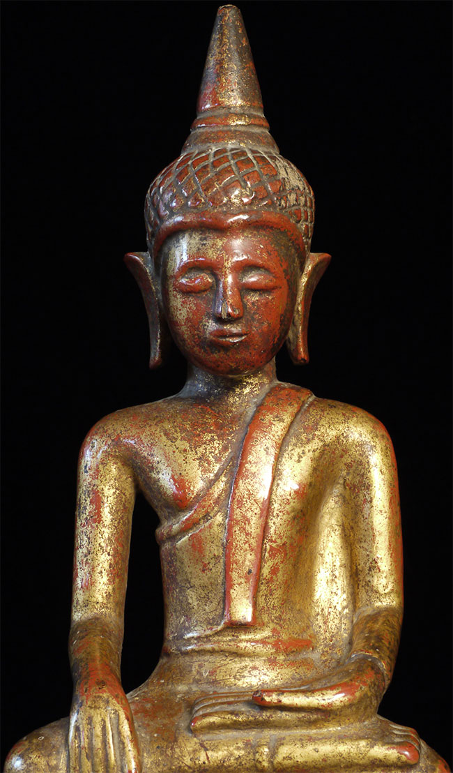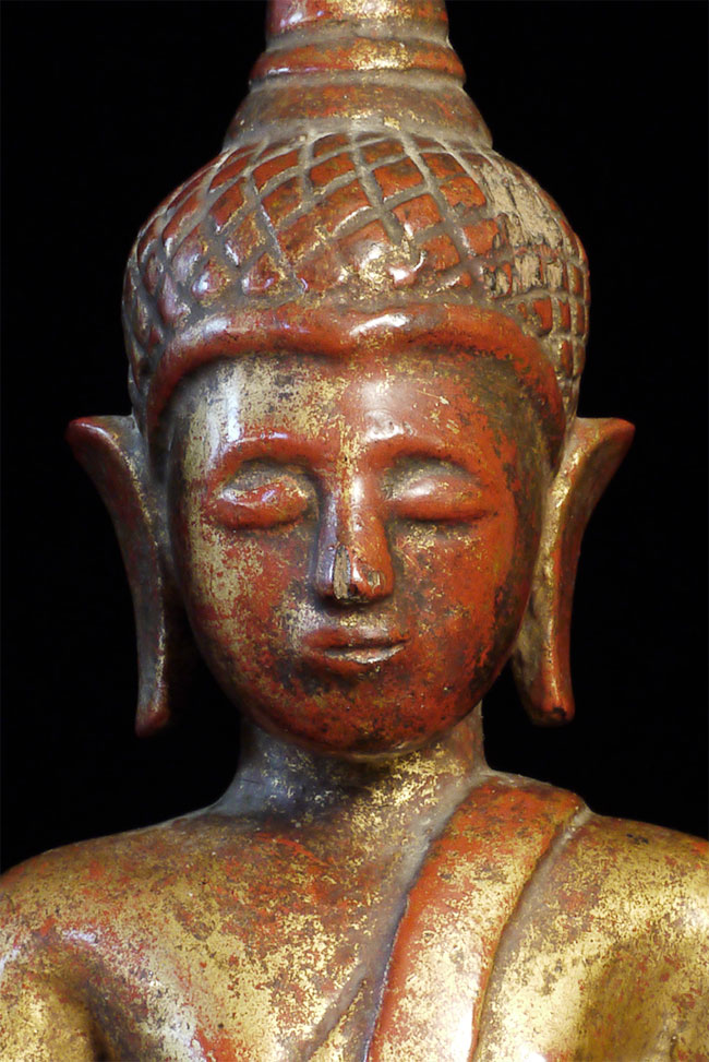 Very nice antique Thai Buddha. Most of original lacquer and gilding remain. Sits 11.5 inches tall.