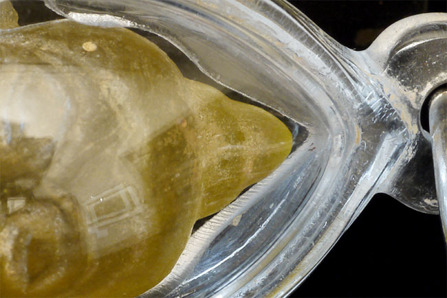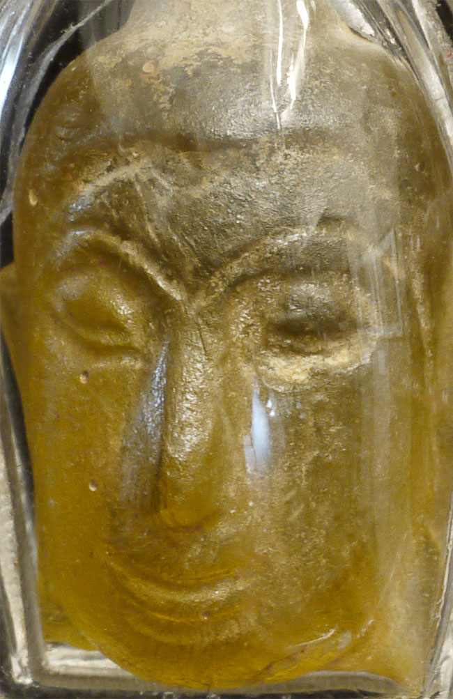 Lovely 16/17thC Northern Thai Buddha head sculpted out of a special glass which has significant amounts of gold mixed in to it (this gives it its color as well as making it extremely heavy for its size). 1 inch tall