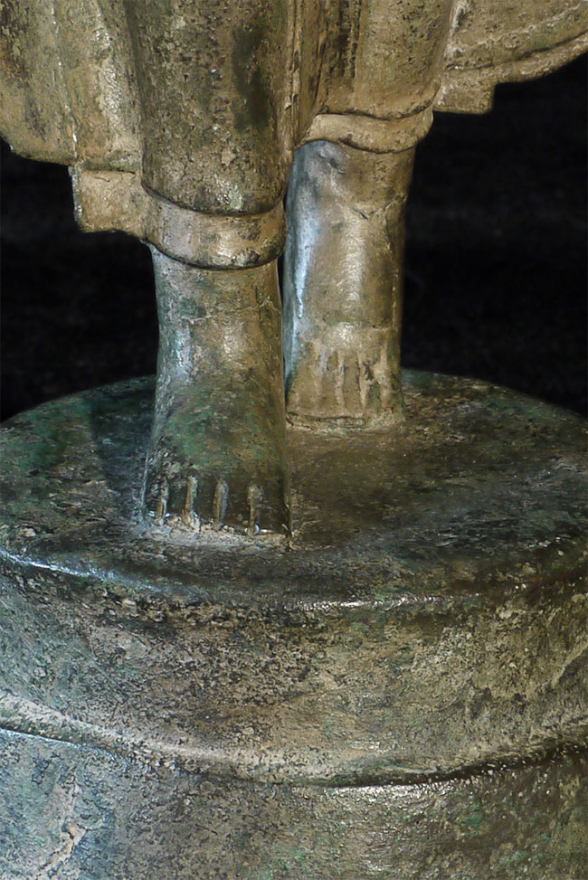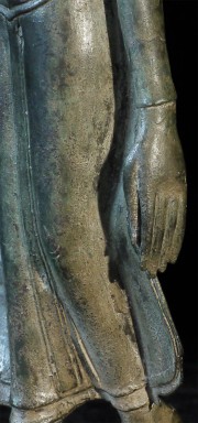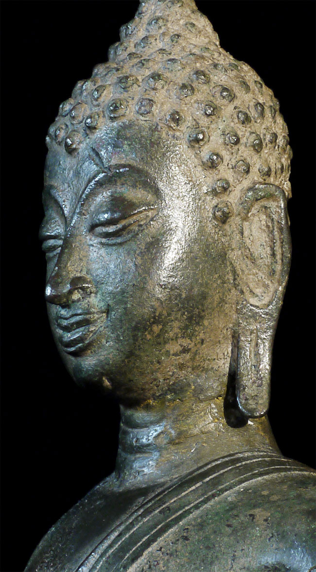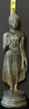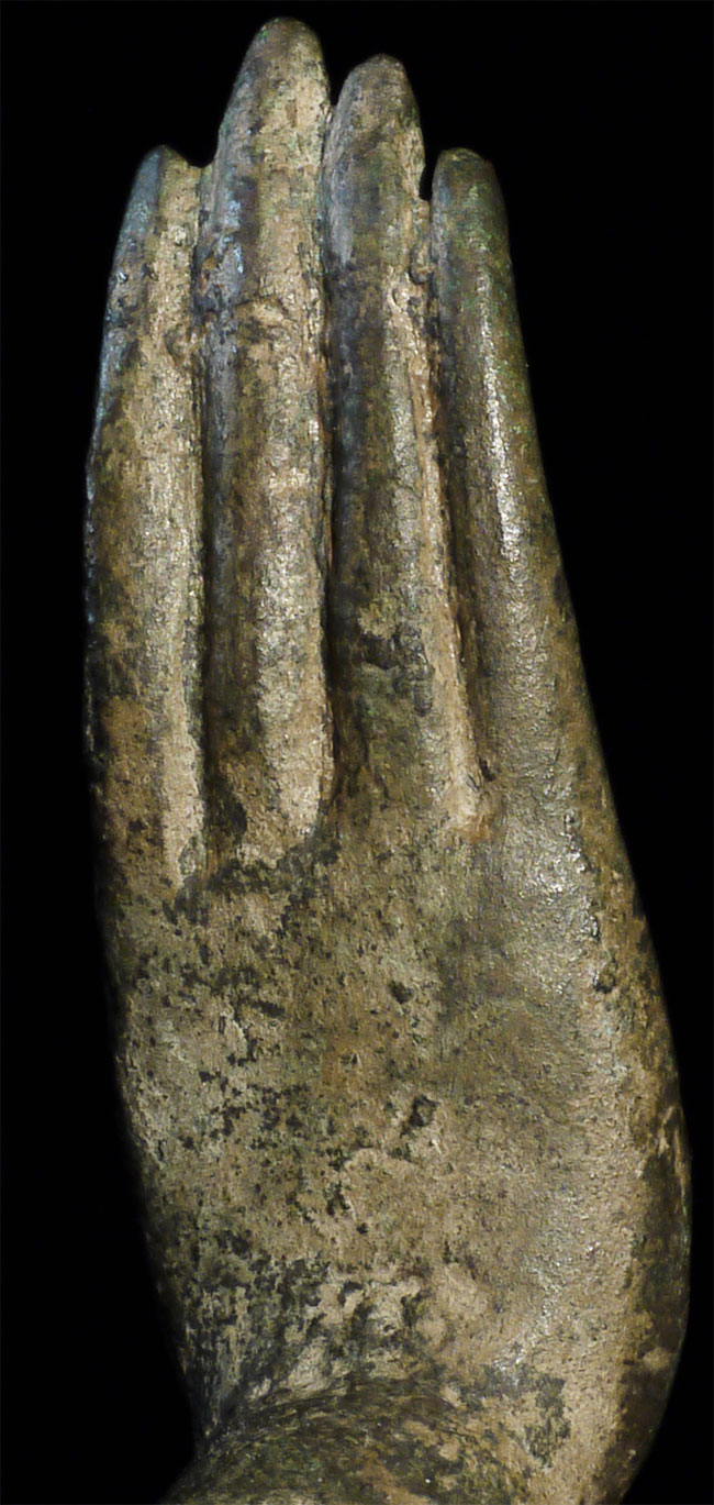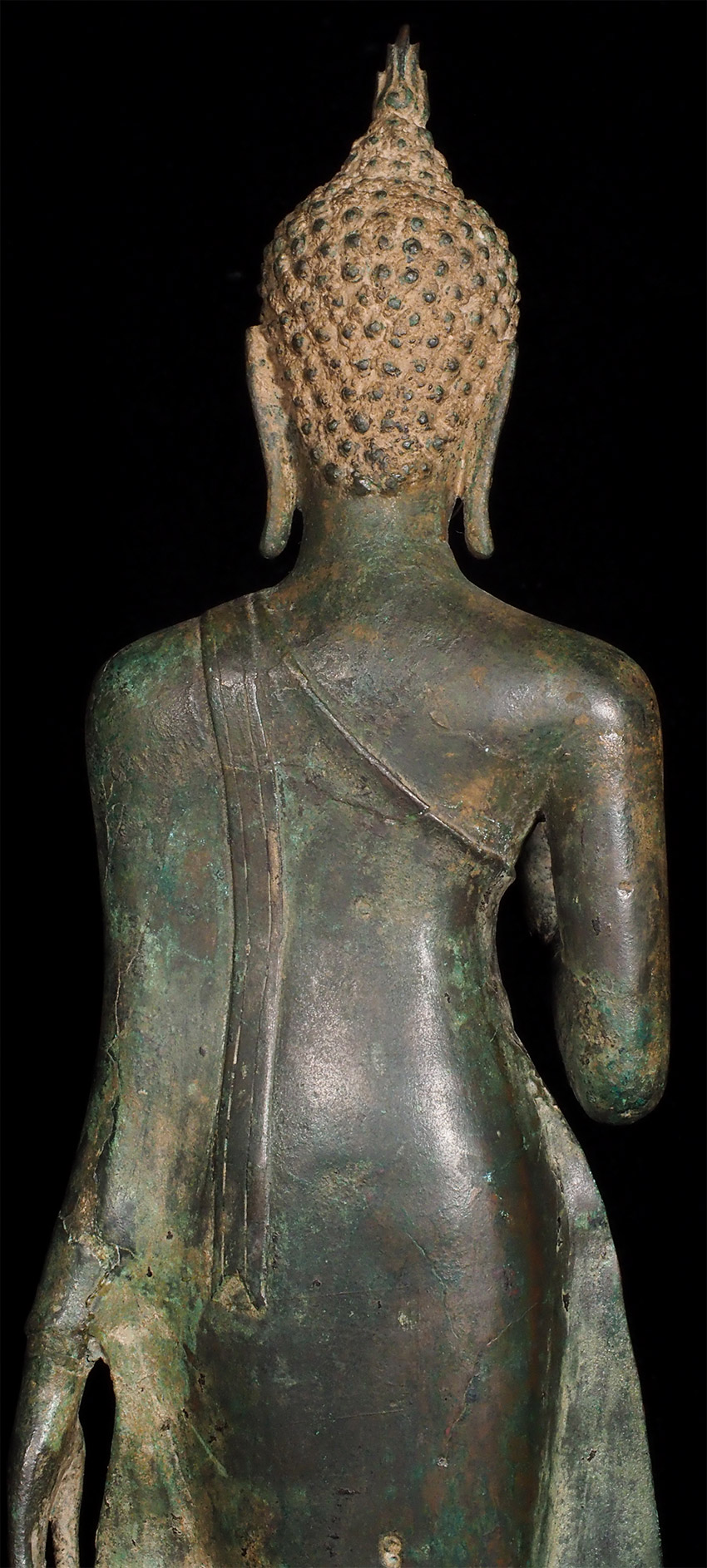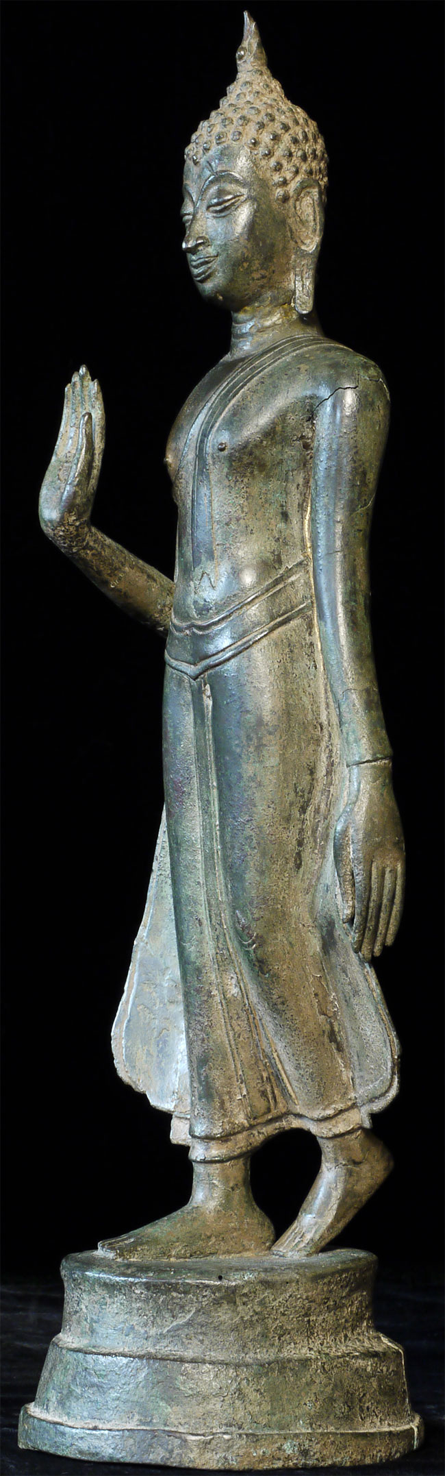 A world class 15/16thC Walking Sukhothai Buddha. A small fraction of this type you see are true period pieces, especially in this pristine condition. Beautiful "jade skin" patina (the most prized patina of all), and traces of original gilding. Measures 15.25 inches tall and its bottom has a diameter of 4.25 inches. The finest examples of this type I have ever come across. A copy of the original 1968 invoice from a high end antique shop in Bangkok, Thailand, is included. From the estate of a former CEO of a pharmaceutical company.