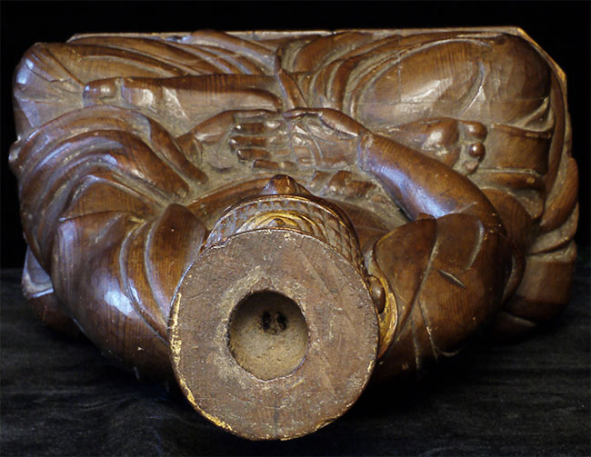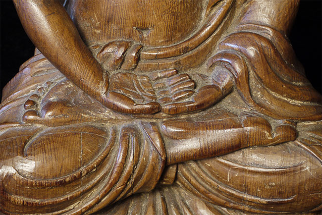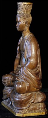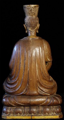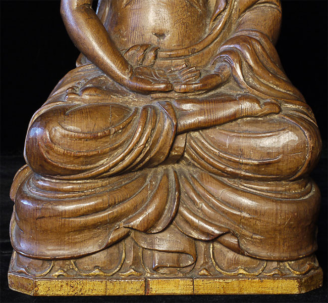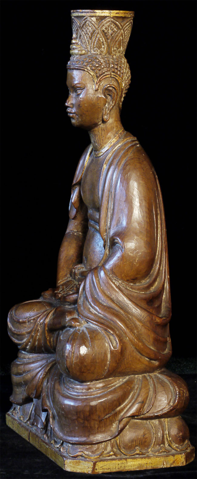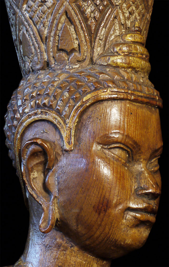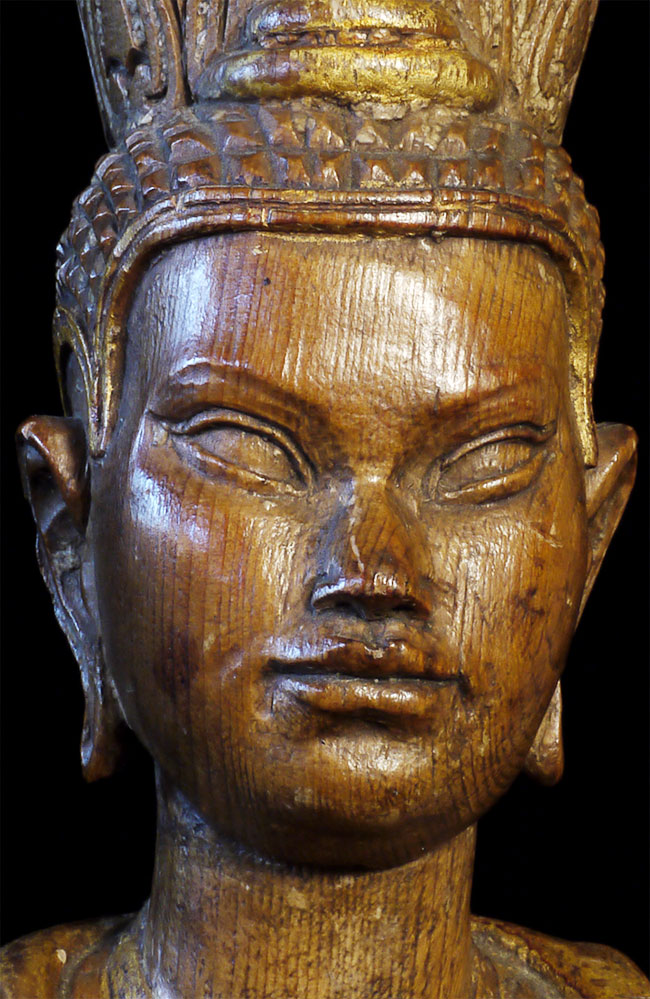Superbly carved SE Asian Buddha. Possibly Cambodian based on face, but unlike any other I've seen. Extremely sophisticated and unusual robe and crown treatment. Looks to originally had another part which went in to the crown. Traces of gilding and mellow patina suggest real age, though I do not know how to date.. Sits a substantial 15 inches tall.