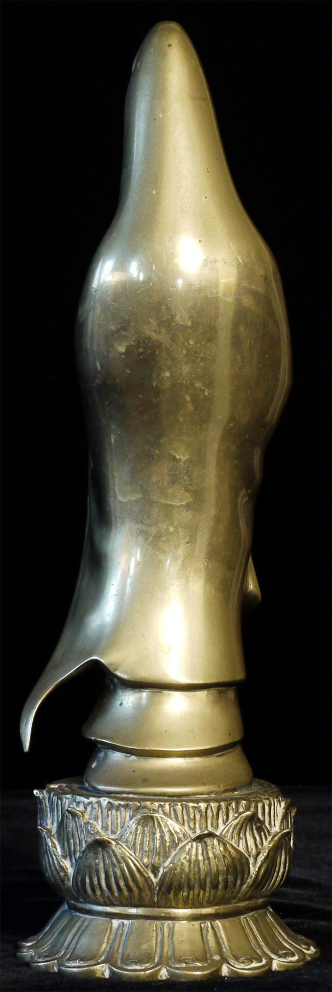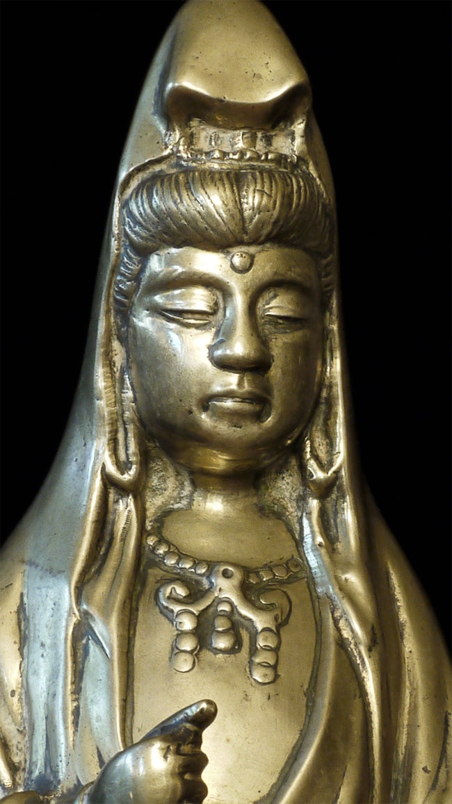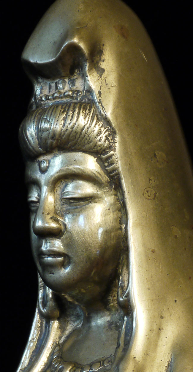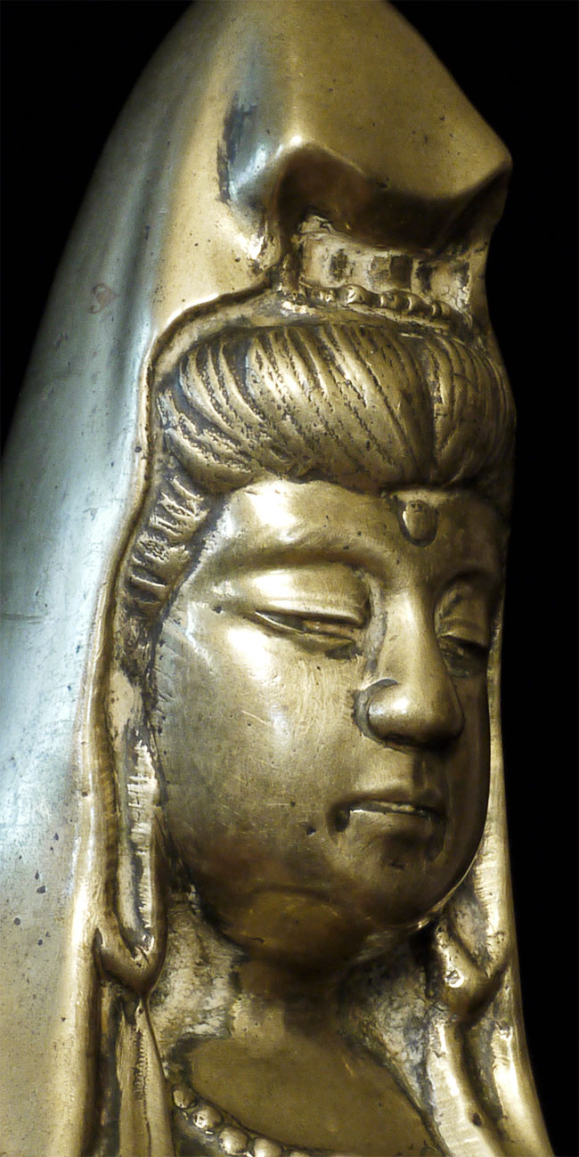 Special antique Quanyin or Bodhisattva of Compassion. From China or Korea. This piece has an extraordinary face which embodies a feeling of quiet serenity and calm. At a distance, it looks like so many other related figures, but as you get close it becomes apparent that this is a very singular sculpture. Signed on the underside. 13" tall.