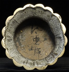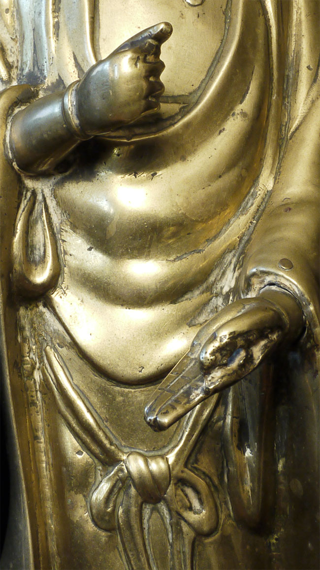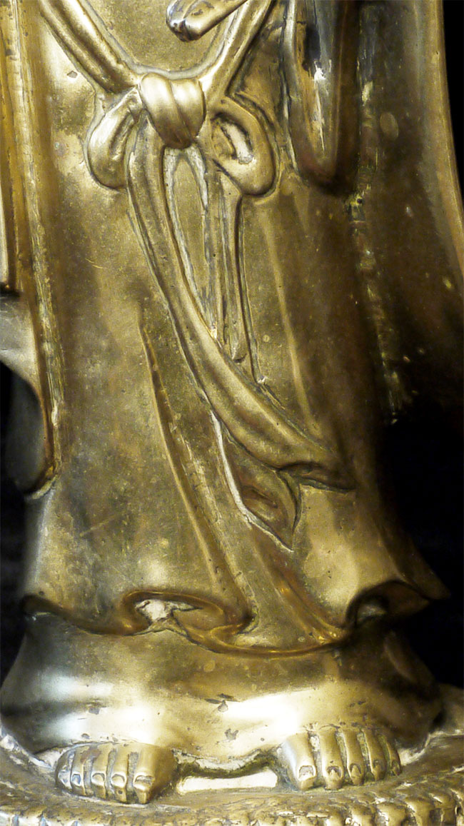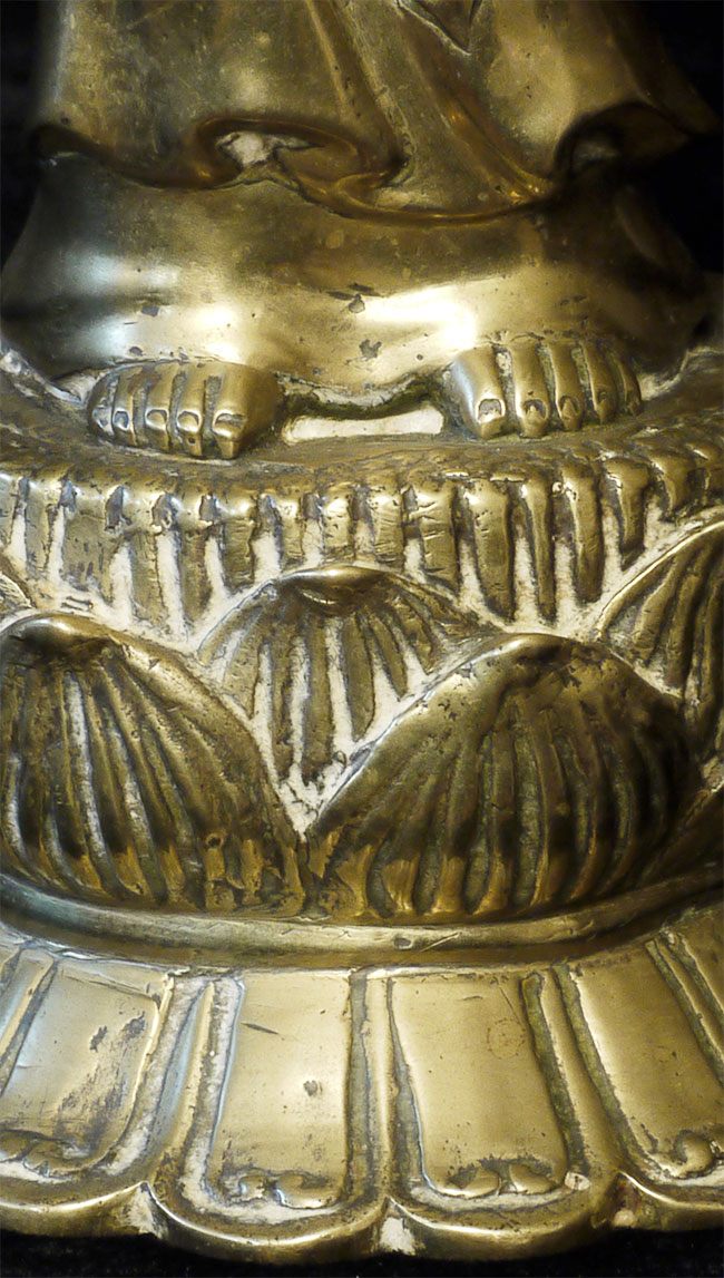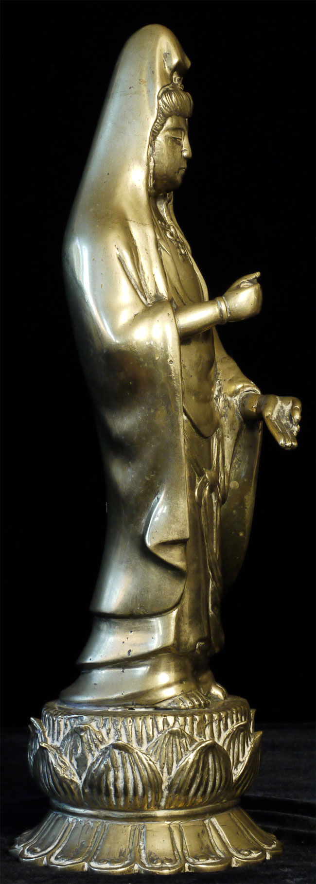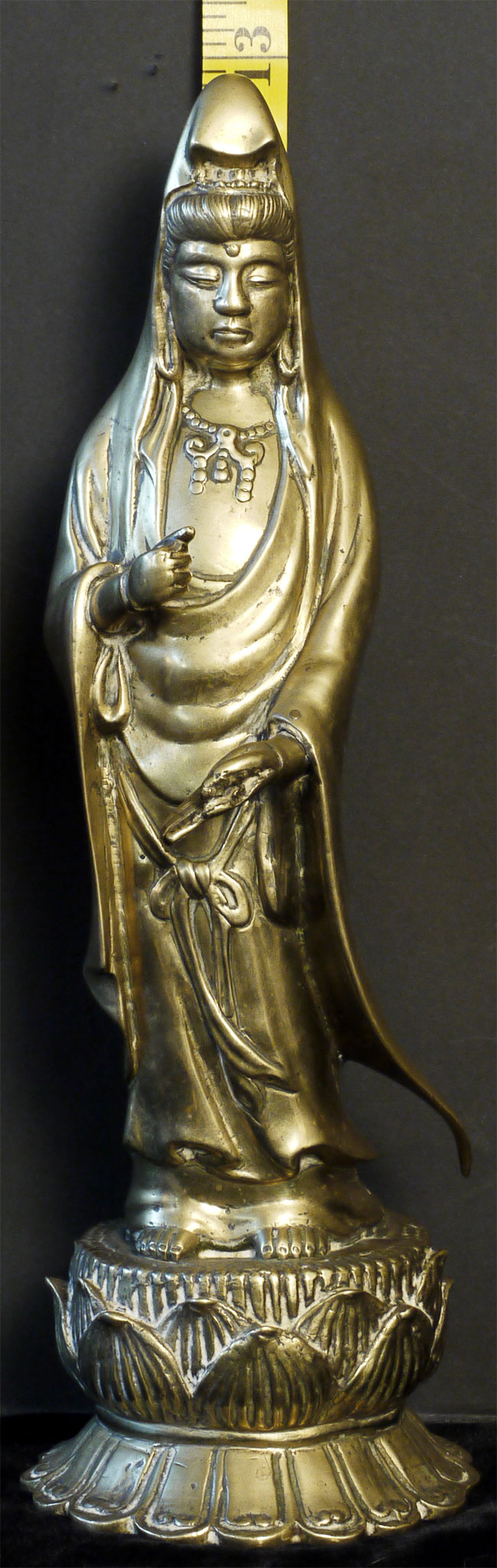 Special antique Quanyin or Bodhisattva of Compassion. From China or Korea. This piece has an extraordinary face which embodies a feeling of quiet serenity and calm. At a distance, it looks like so many other related figures, but as you get close it becomes apparent that this is a very singular sculpture. Signed on the underside. 13" tall.