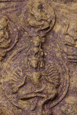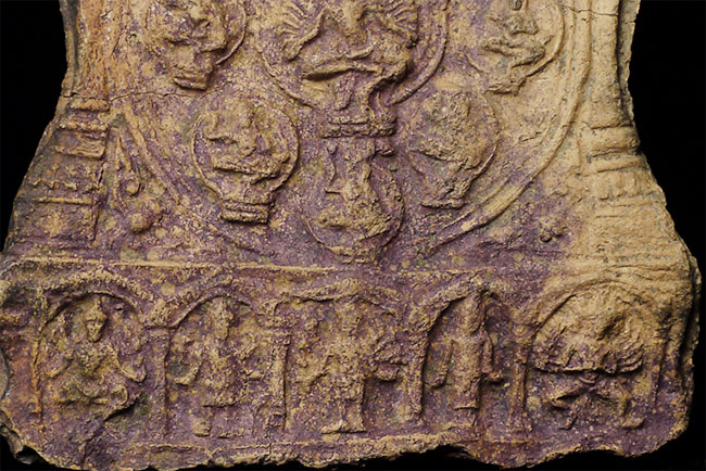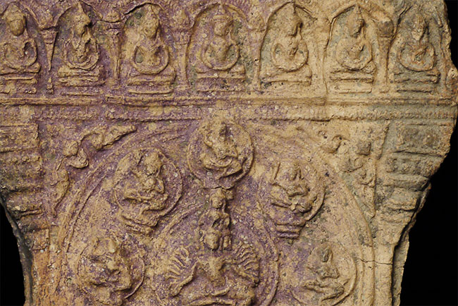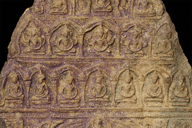 Cambodian Buddha Tablet. Probably a period (12/13thC) piece, though these have been emulated for centuries. A nice example. Some wear and loss. From a group of pieces I sold to a friend long ago that I recently re-purchased. Appears to have purple incrustation Large example at 7.25 inches tall.