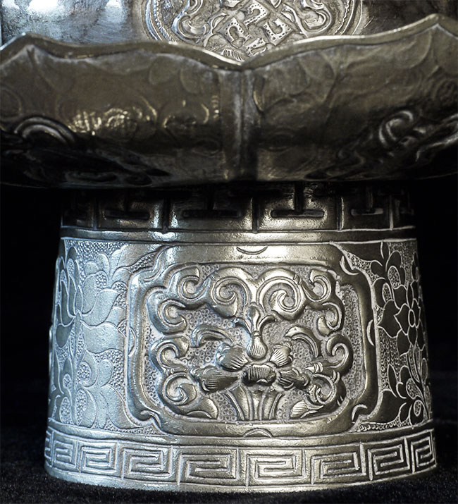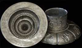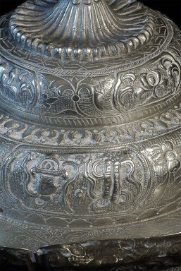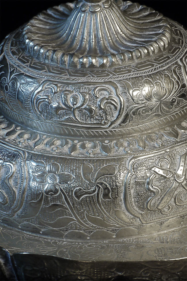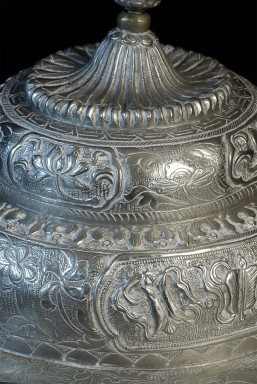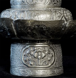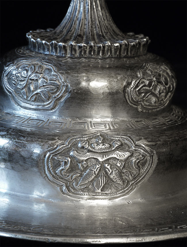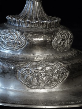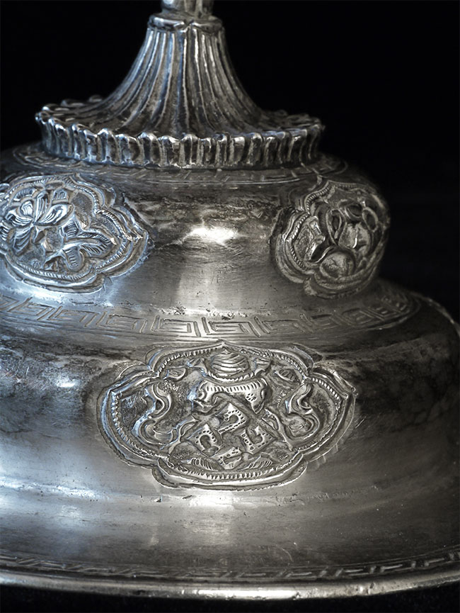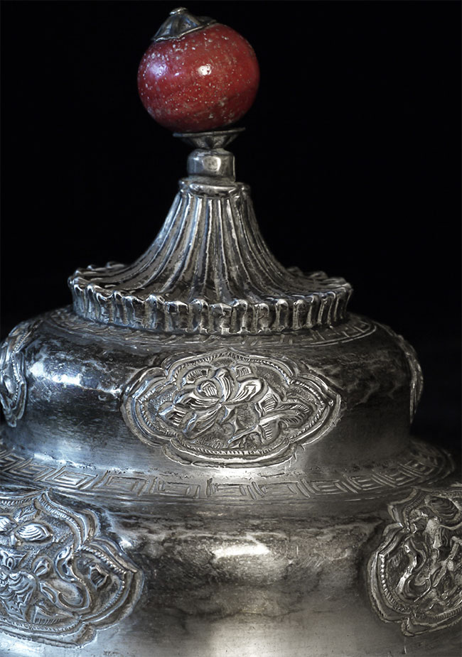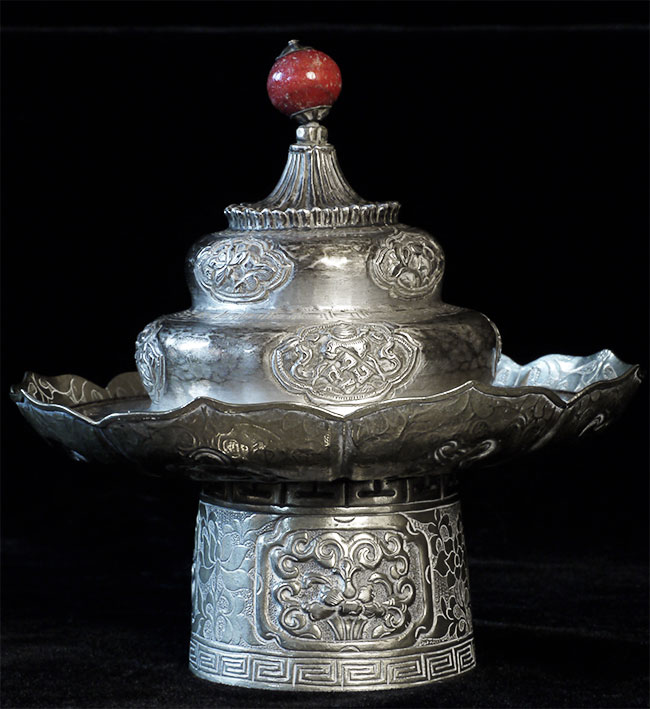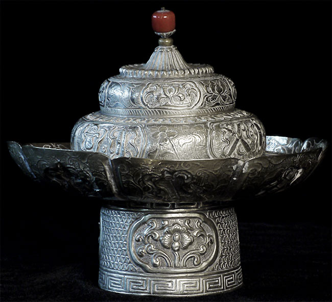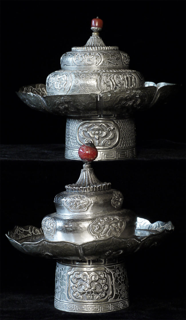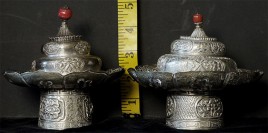 Two vintage/antique silver or silver-like alloy cups. One of the red beads is loose, and tops probably were married to bottoms. The taller of these two is 4.75 inches tall. Diameters are approximately 5 inches.