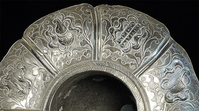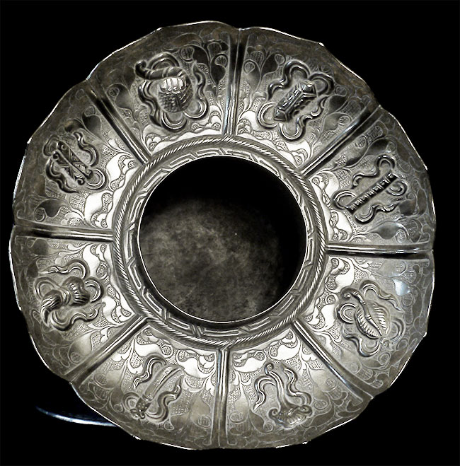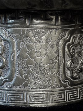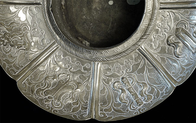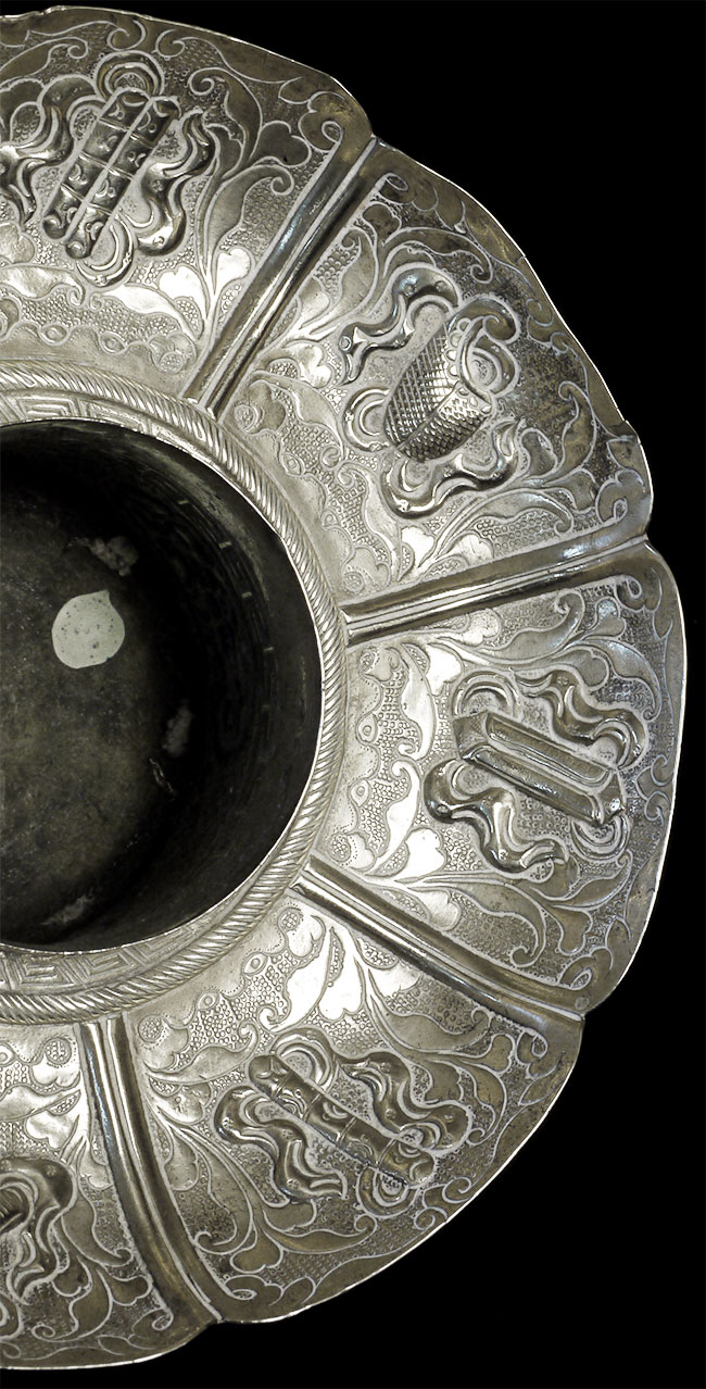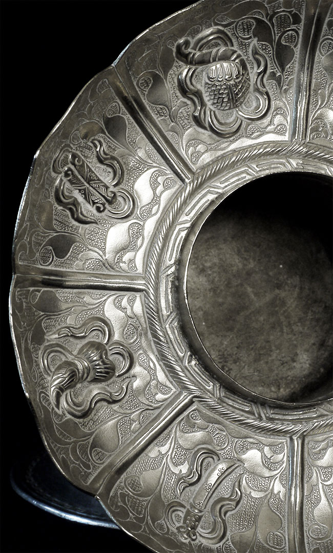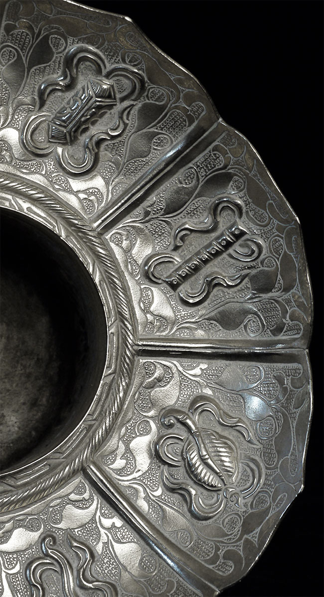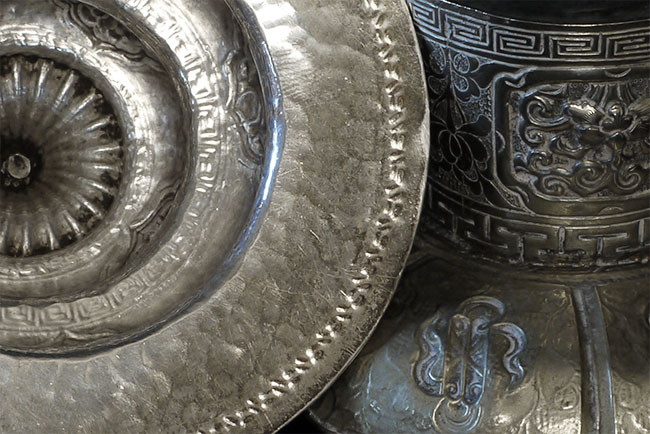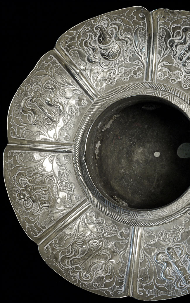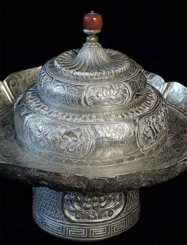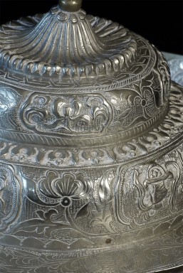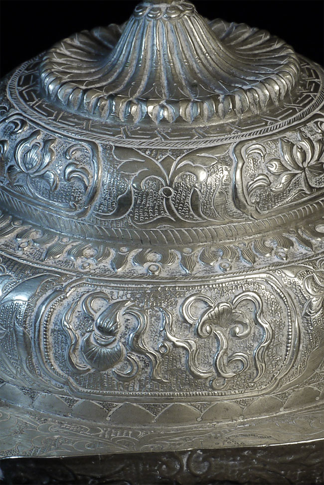 Two vintage/antique silver or silver-like alloy cups. One of the red beads is loose, and tops probably were married to bottoms. The taller of these two is 4.75 inches tall. Diameters are approximately 5 inches.