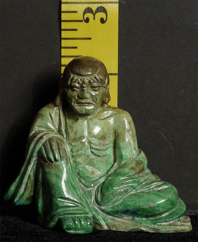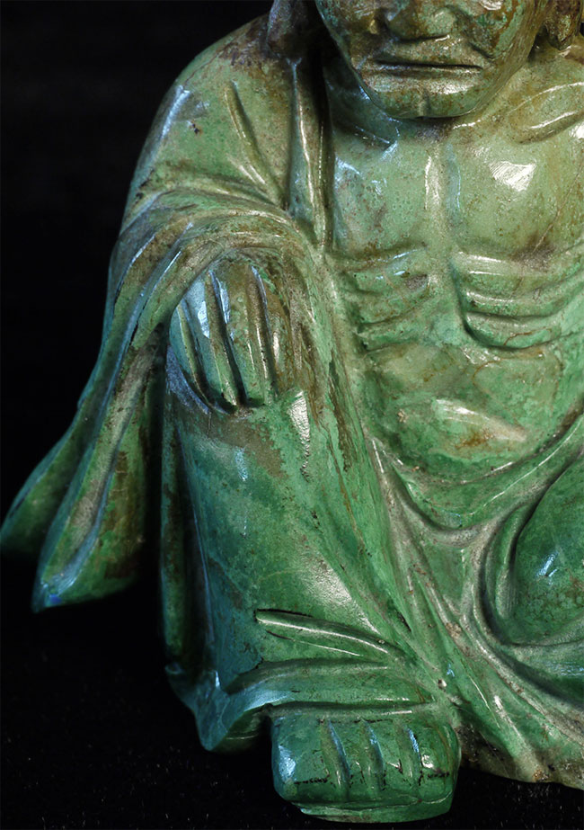 Antique Chinese malachite and azurite lohan. From a Carmel California estate. Amazing piece of stone. Sits 2.25 inches tall, 2.5 inches at widest point.